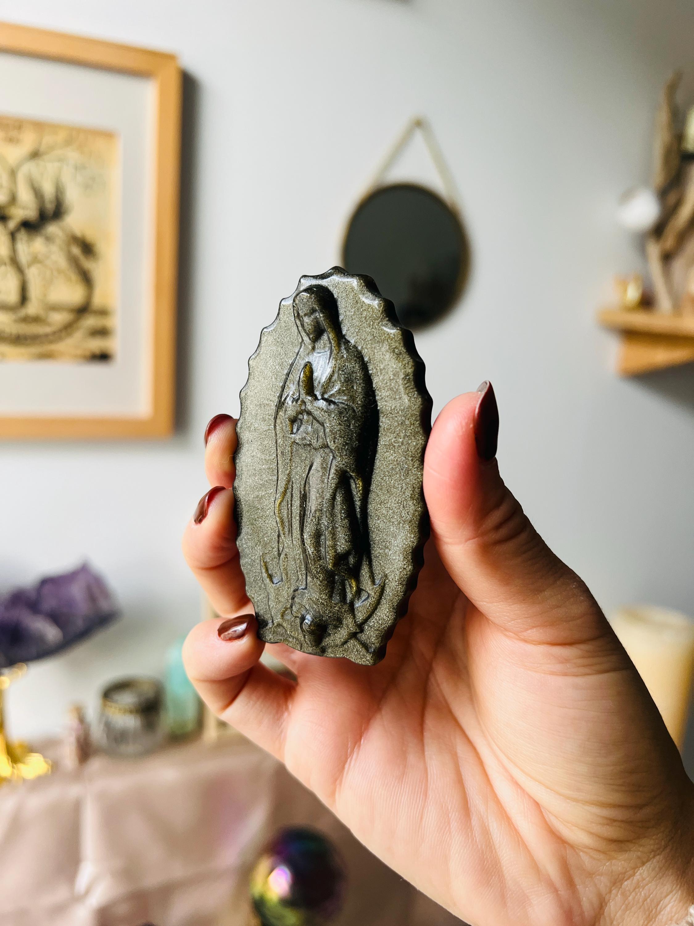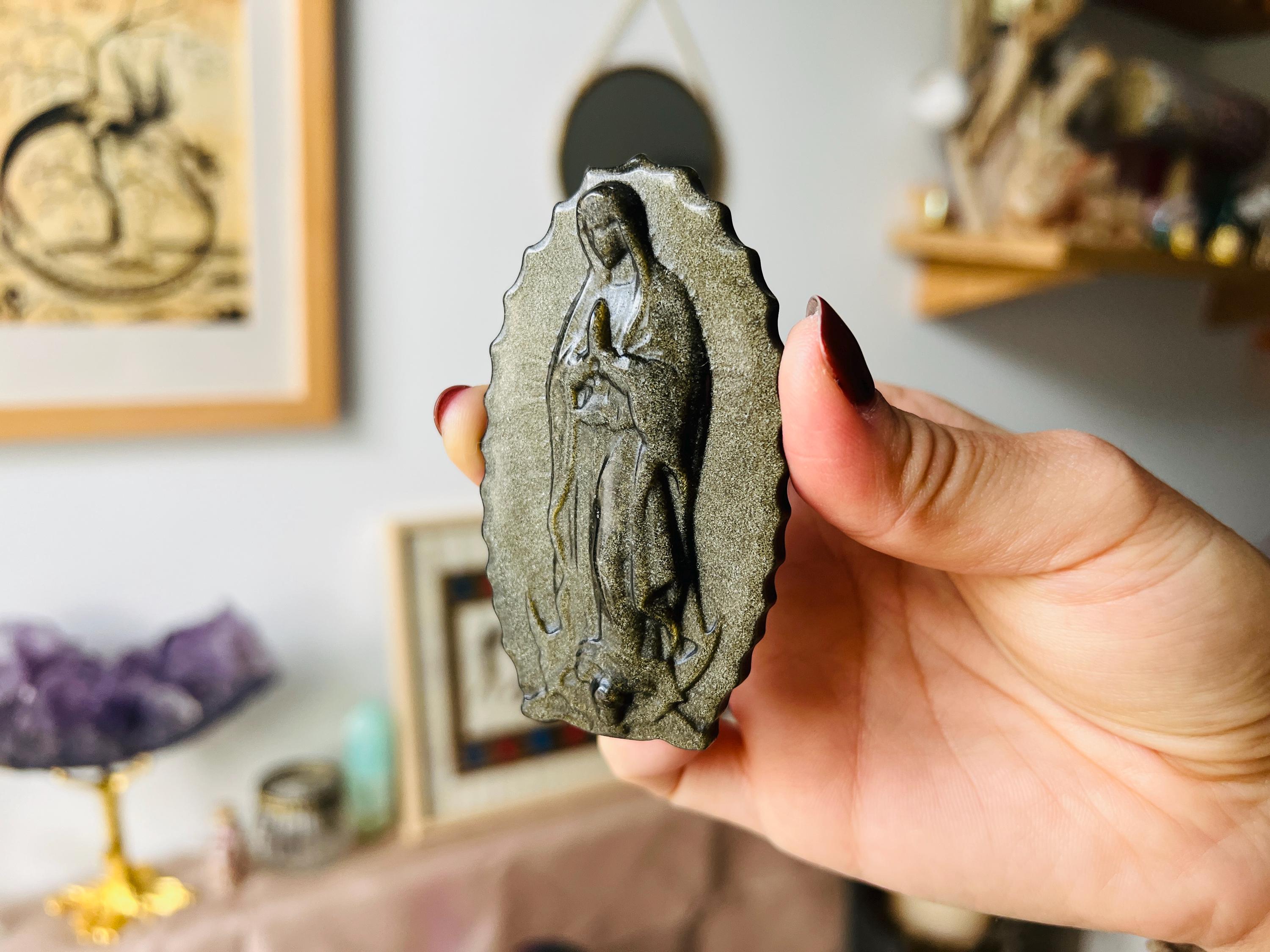 These hand-carved Virgin Mary statues, inspired by Our Lady of Guadalupe, combine the delicacy of natural minerals with a subtle iridescent Aura finish, giving them a celestial glow that shifts under the light. Each sculpture is finely detailed, showcasing both the graceful contours and purity of the stone.