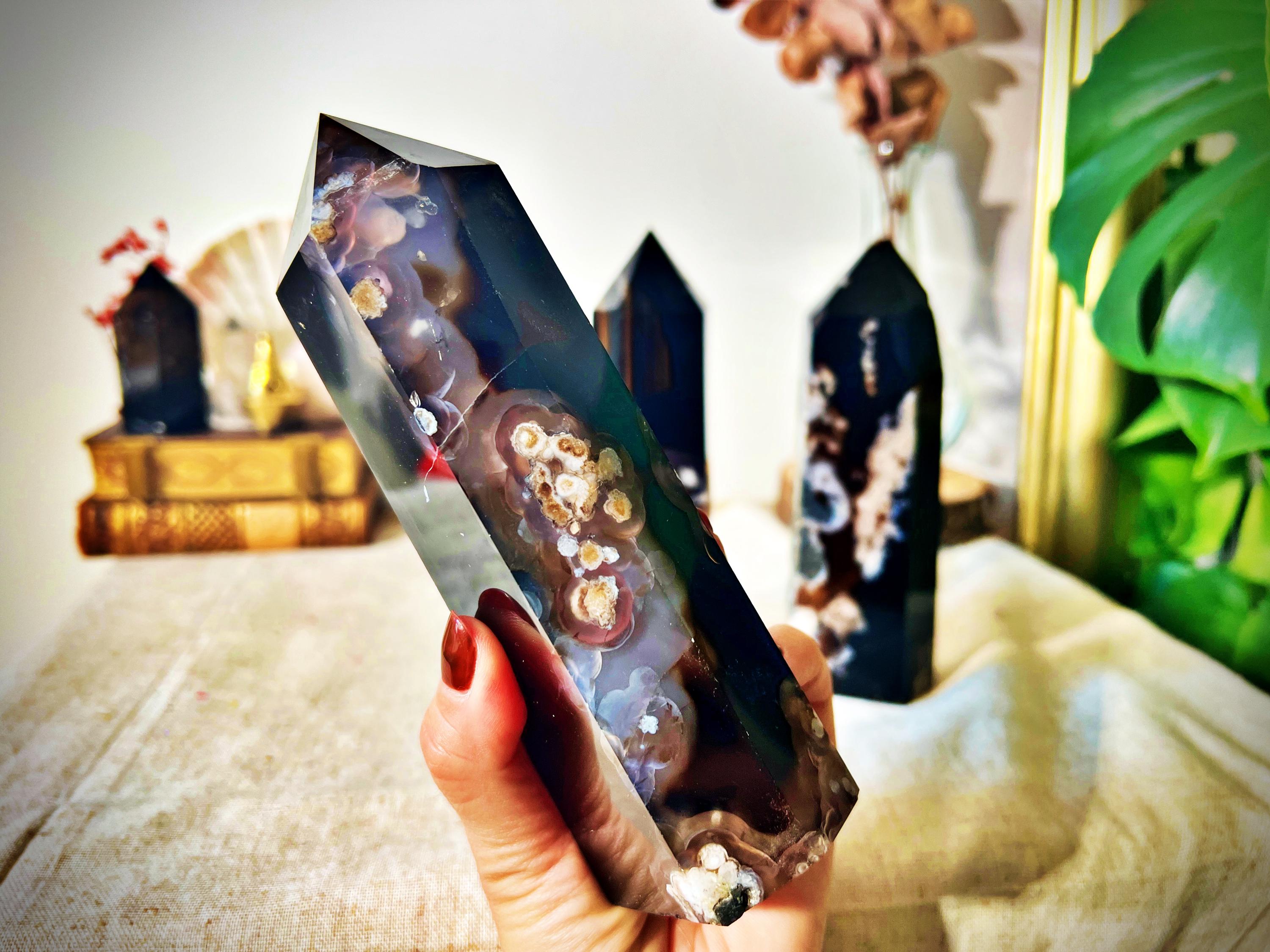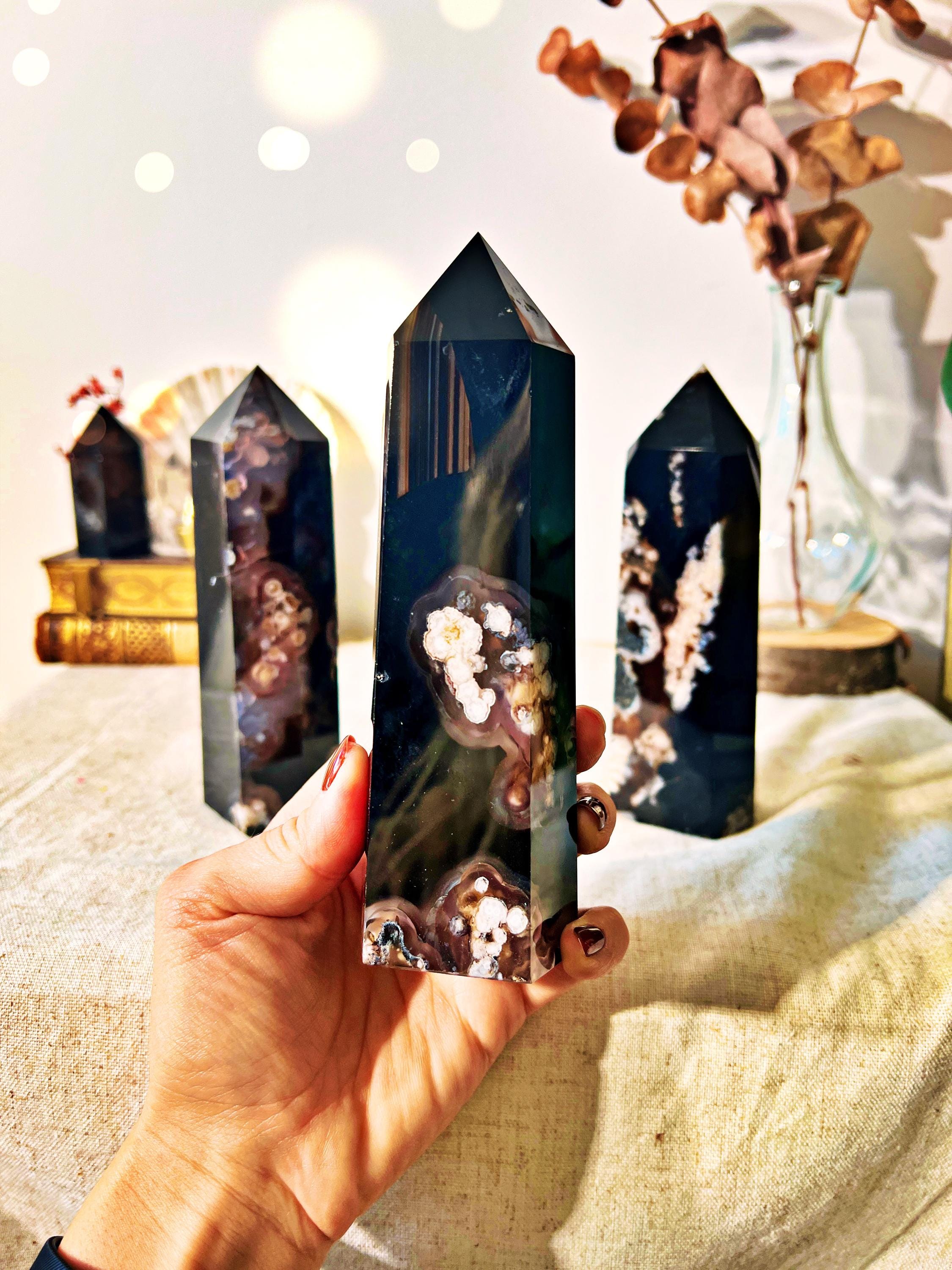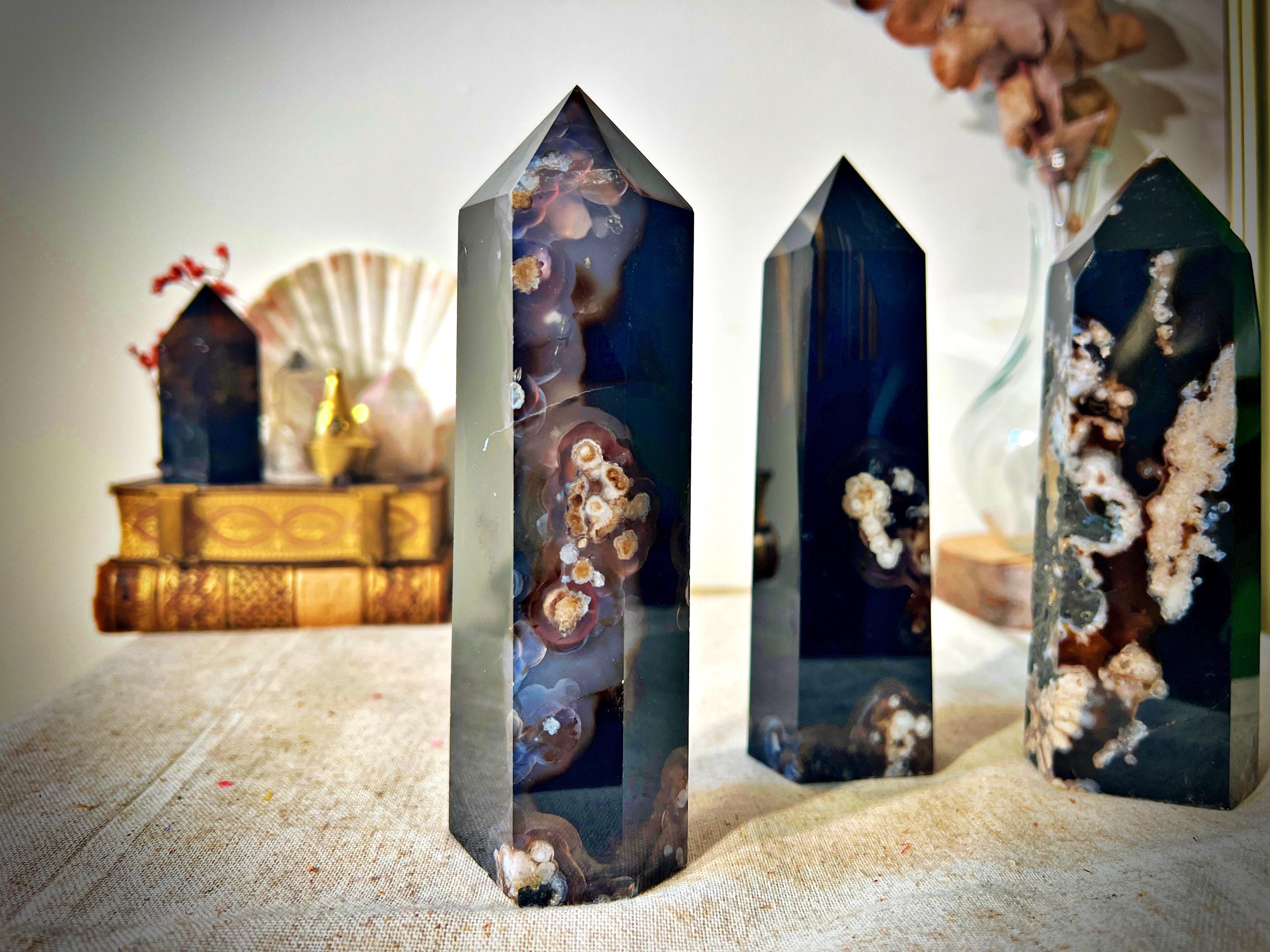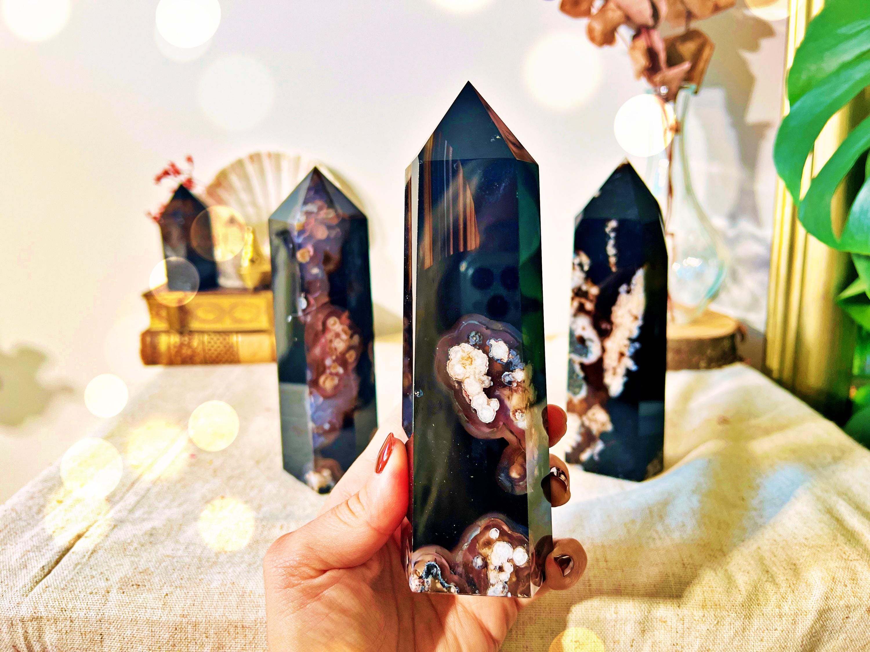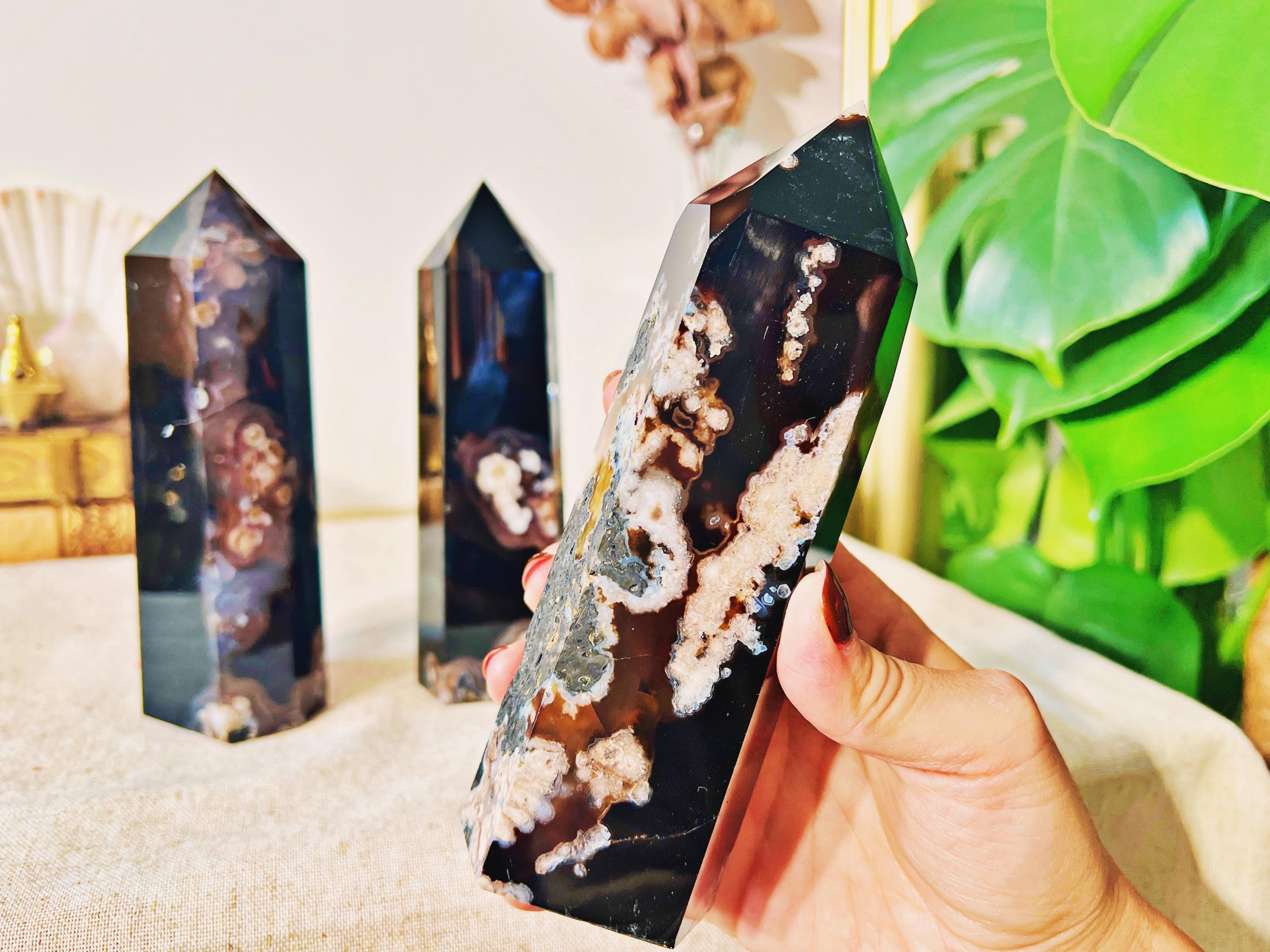 A striking contrast between the dark background and the delicate floral inclusions — these black cherry blossom agates reveal true mineral landscapes. Their polished surface displays patterns reminiscent of blooming cherry branches, frozen in stone for millions of years.