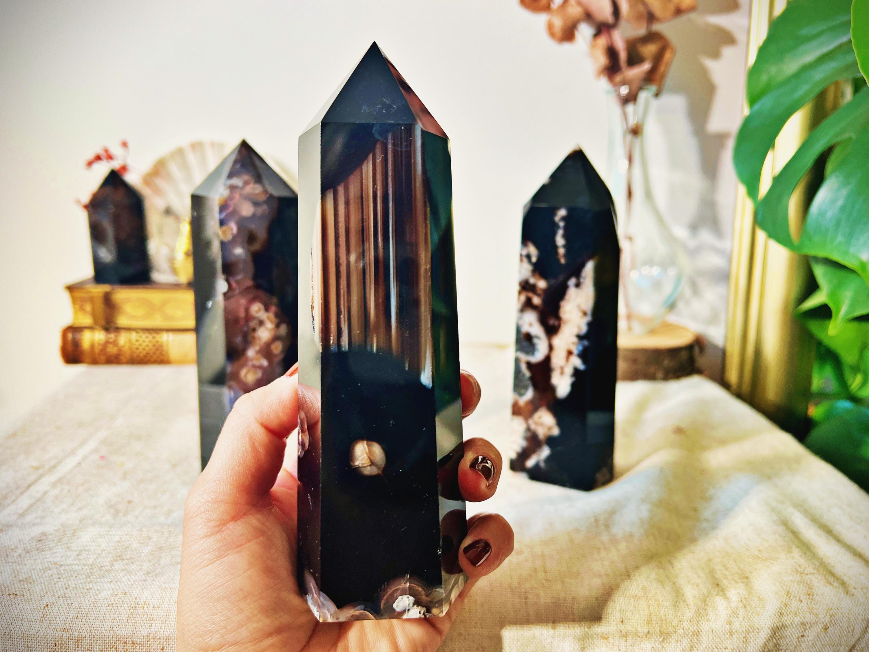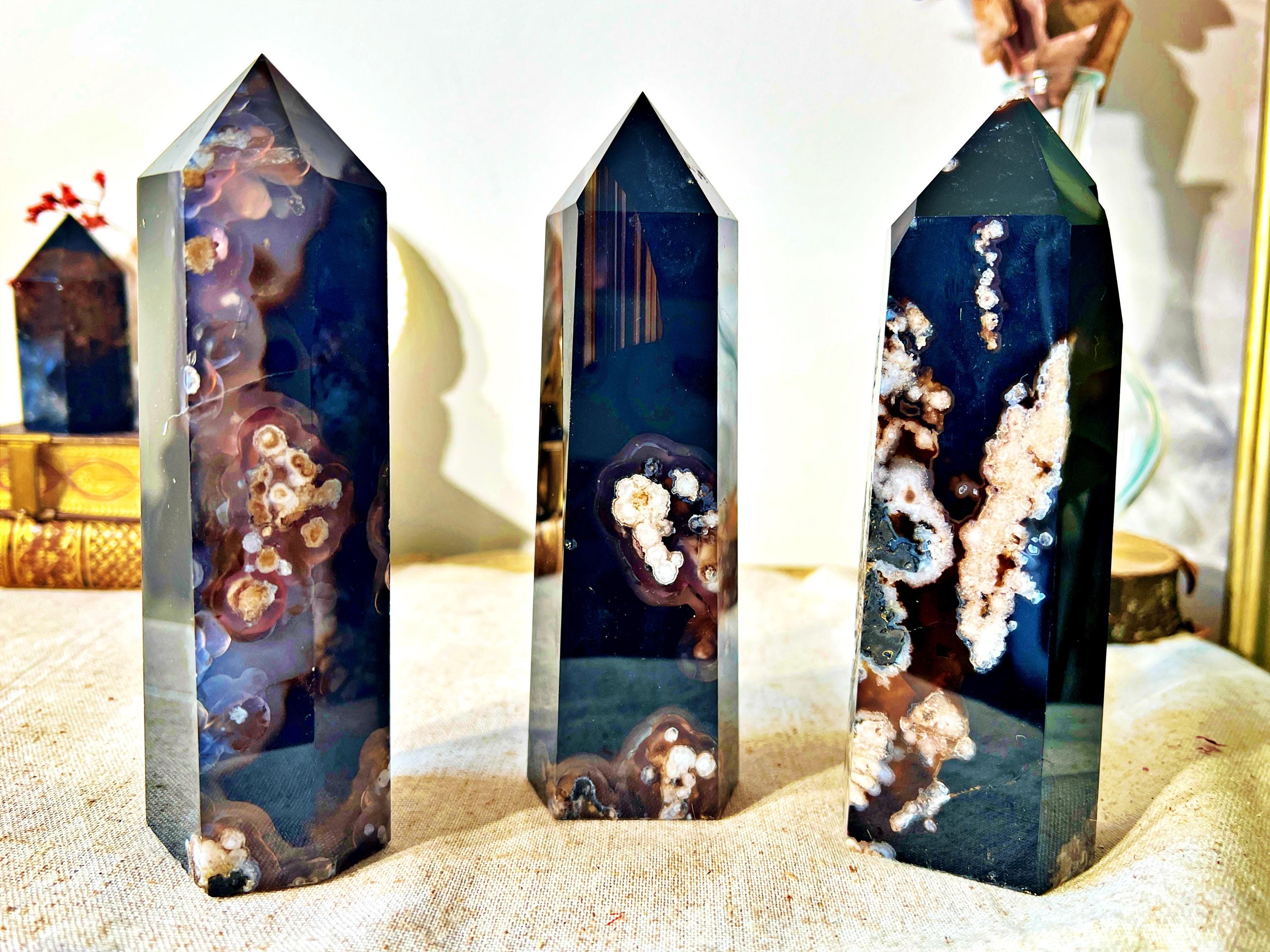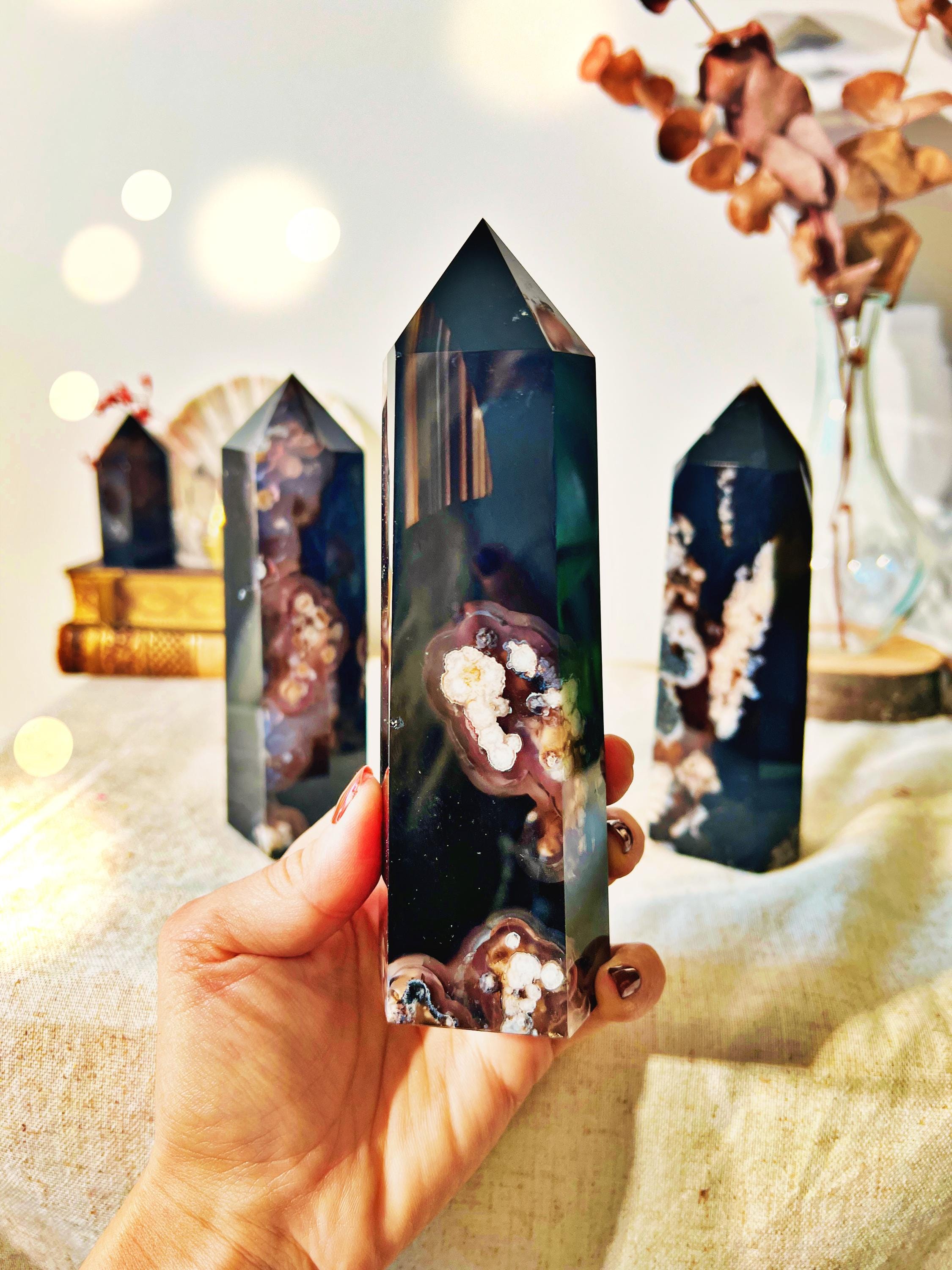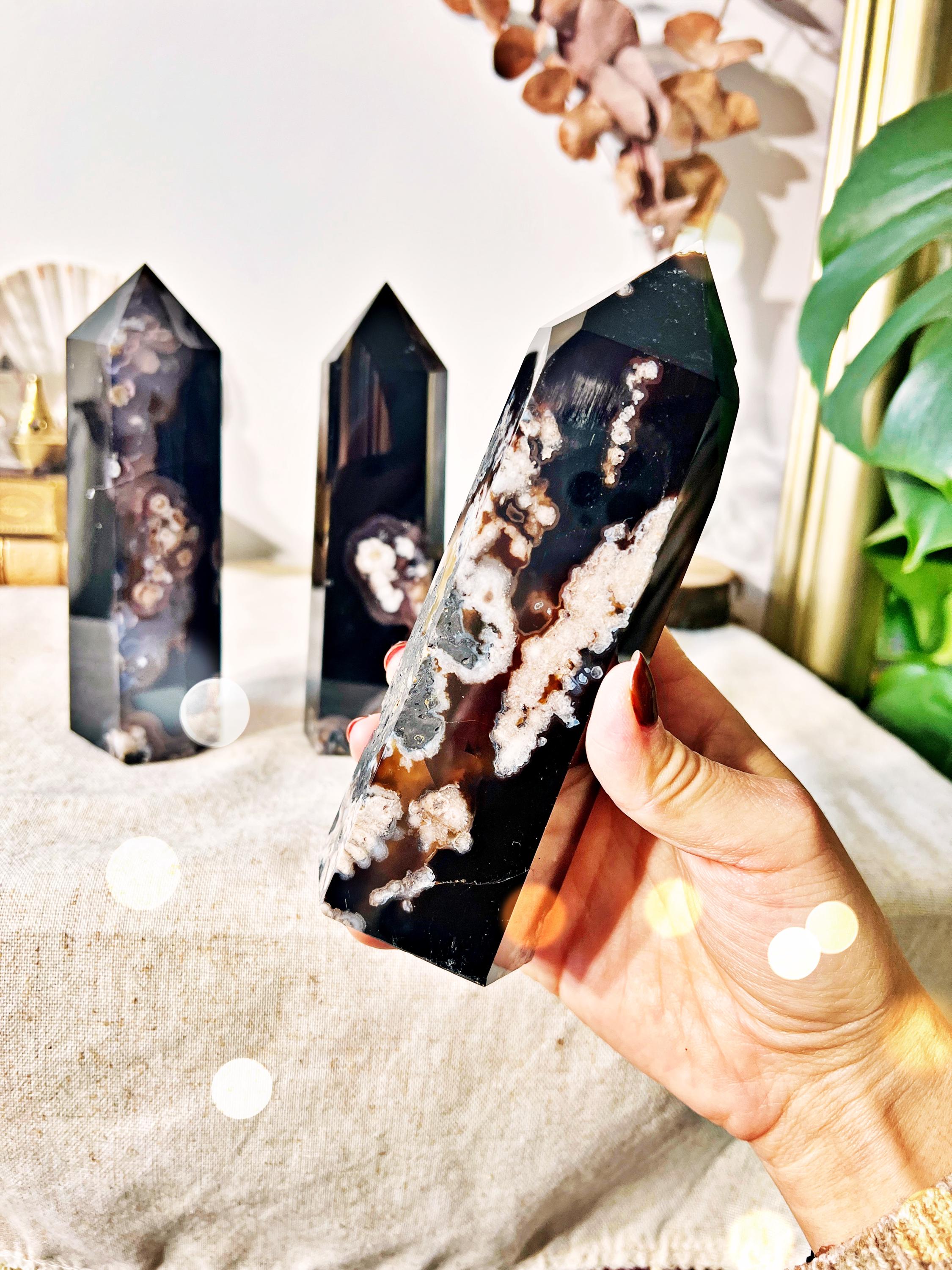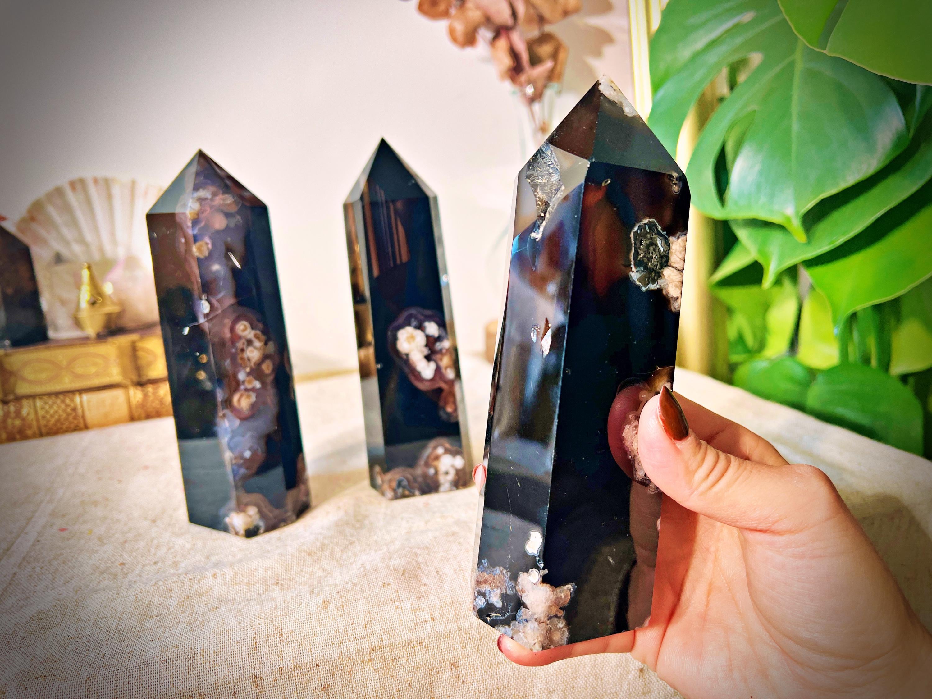 A striking contrast between the dark background and the delicate floral inclusions — these black cherry blossom agates reveal true mineral landscapes. Their polished surface displays patterns reminiscent of blooming cherry branches, frozen in stone for millions of years.