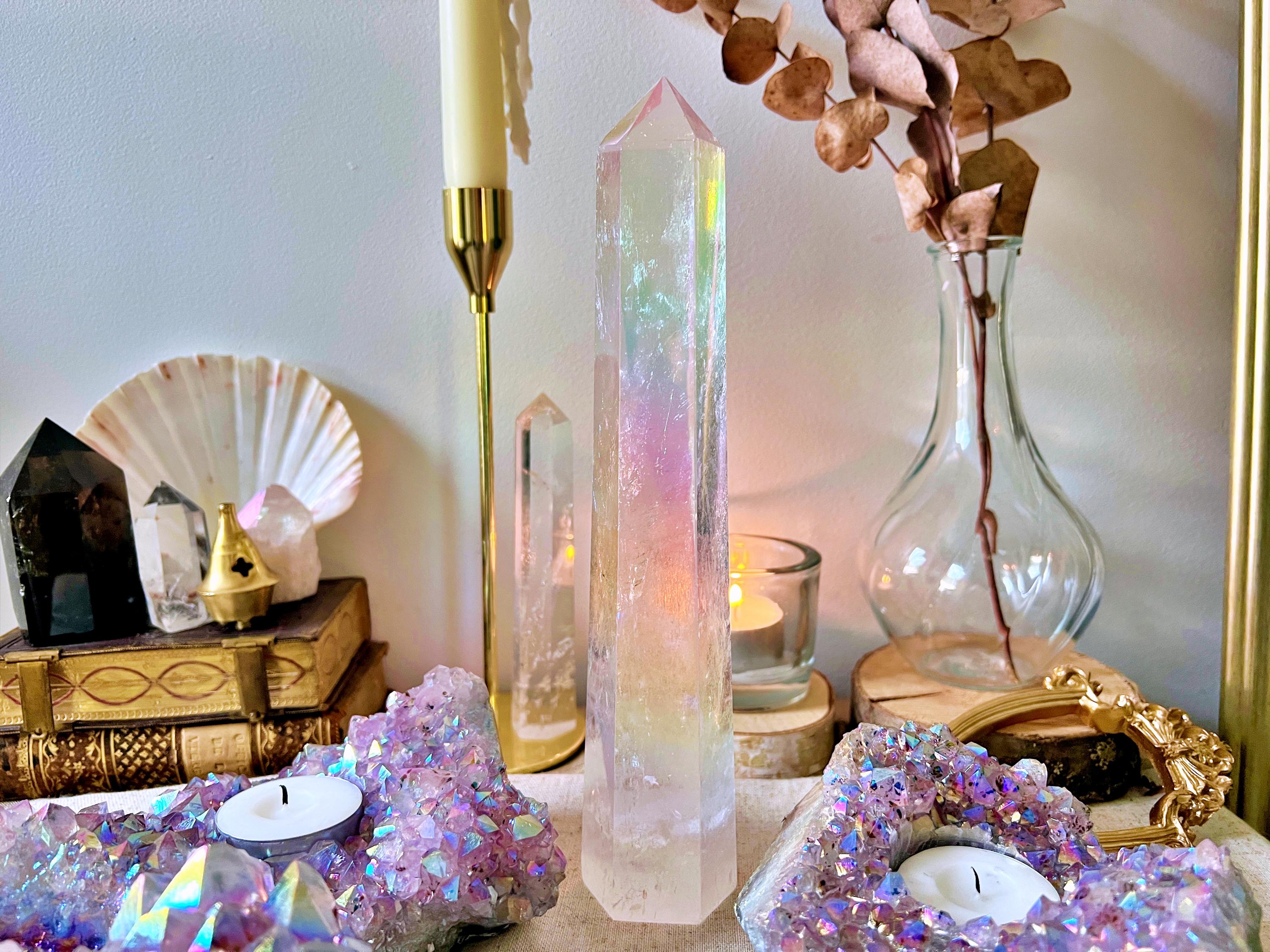 This tower weighs 700 g and stands 20 cm tall, revealing under each light a delicate play of rainbow flashes, pearly veil, and the clear purity of natural quartz beneath the Aura layer.