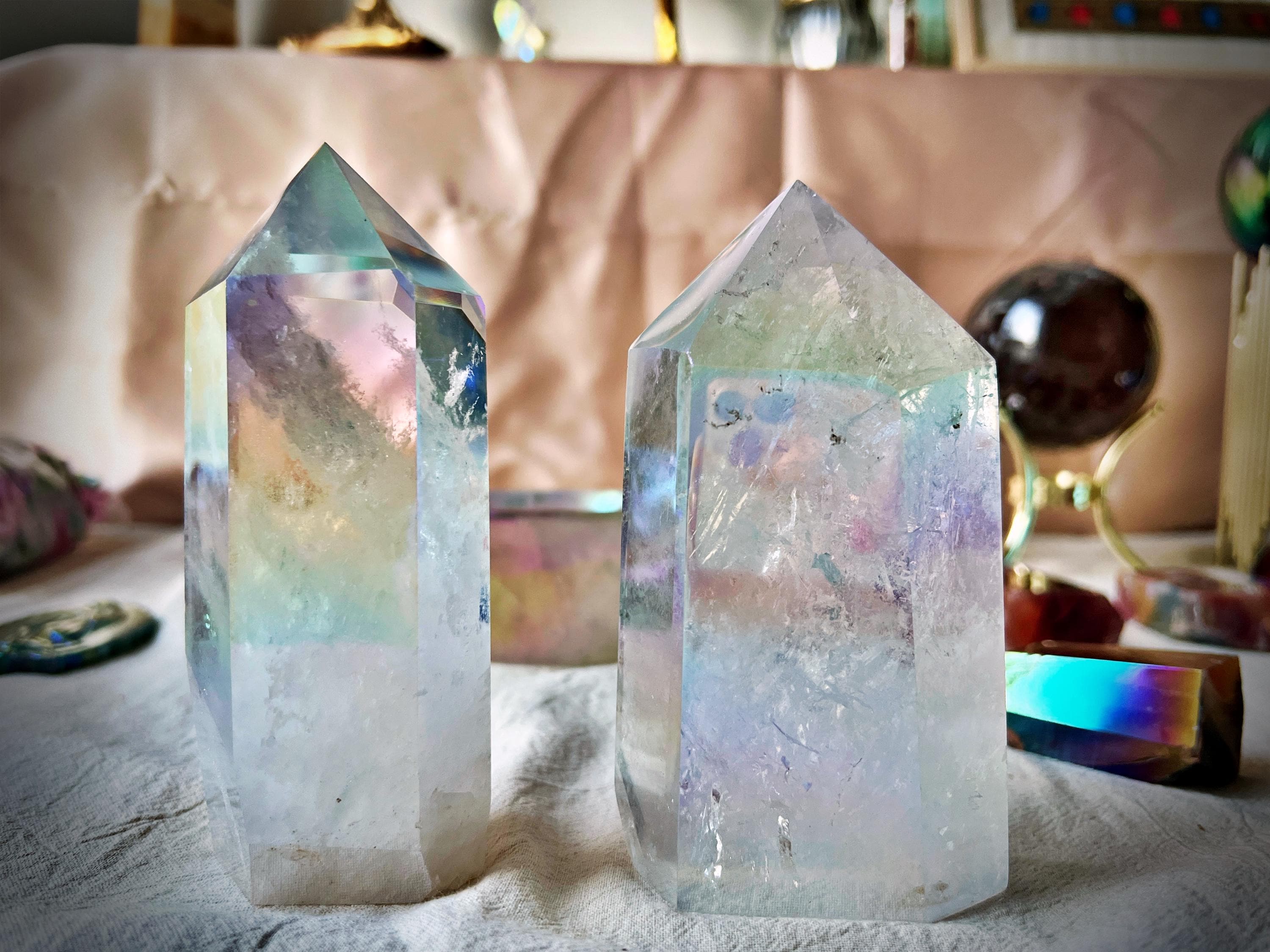A Clear Quartz point, carefully enhanced with a Platinum Aura coating — also known as Opal Aura for its subtle iridescent rainbow sheen and pastel glow.