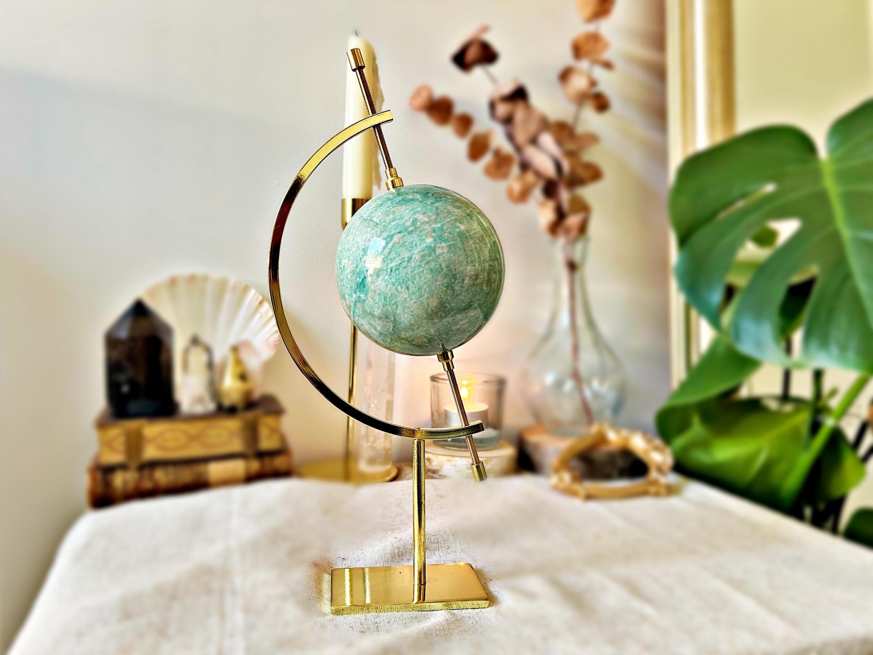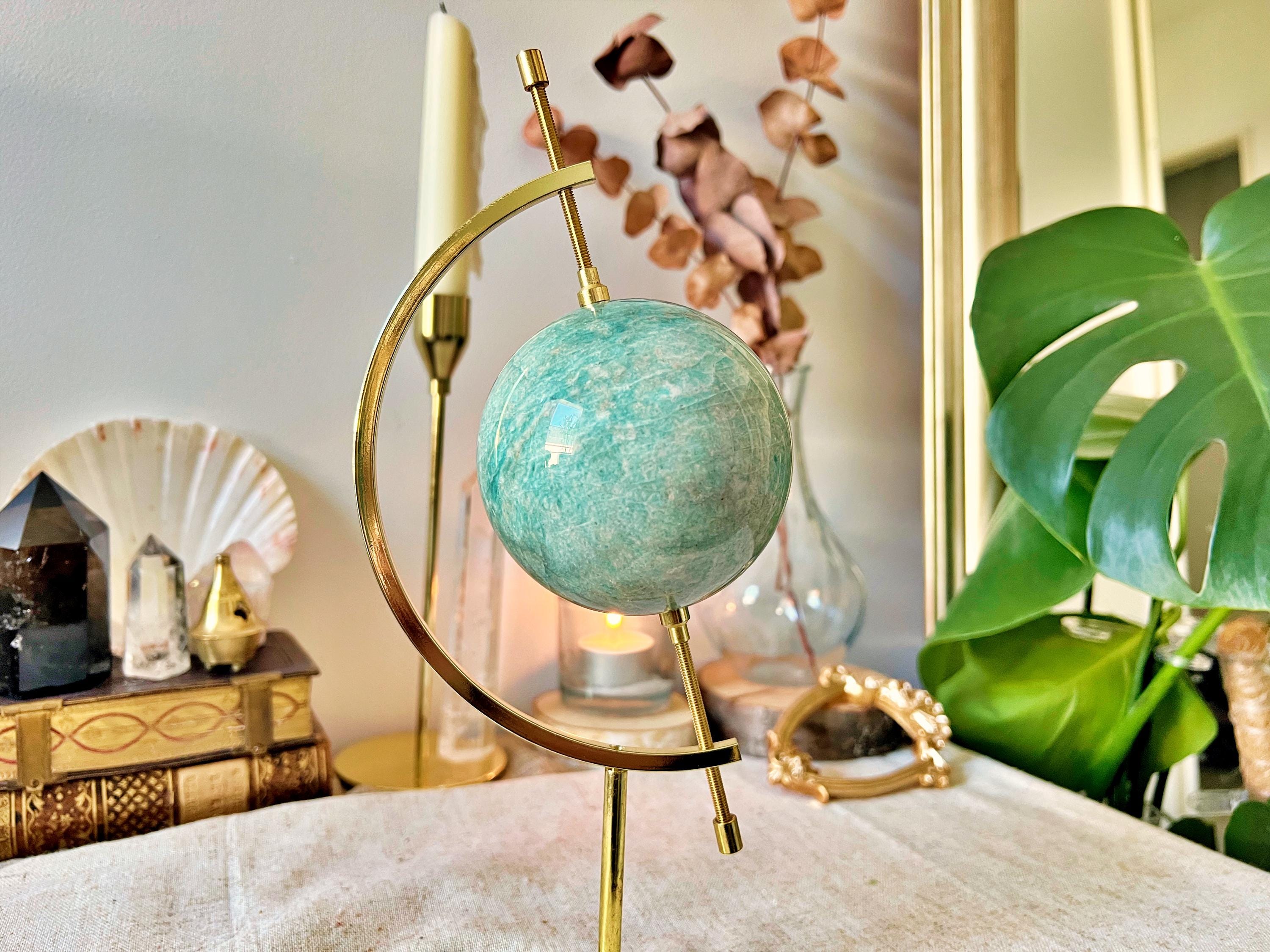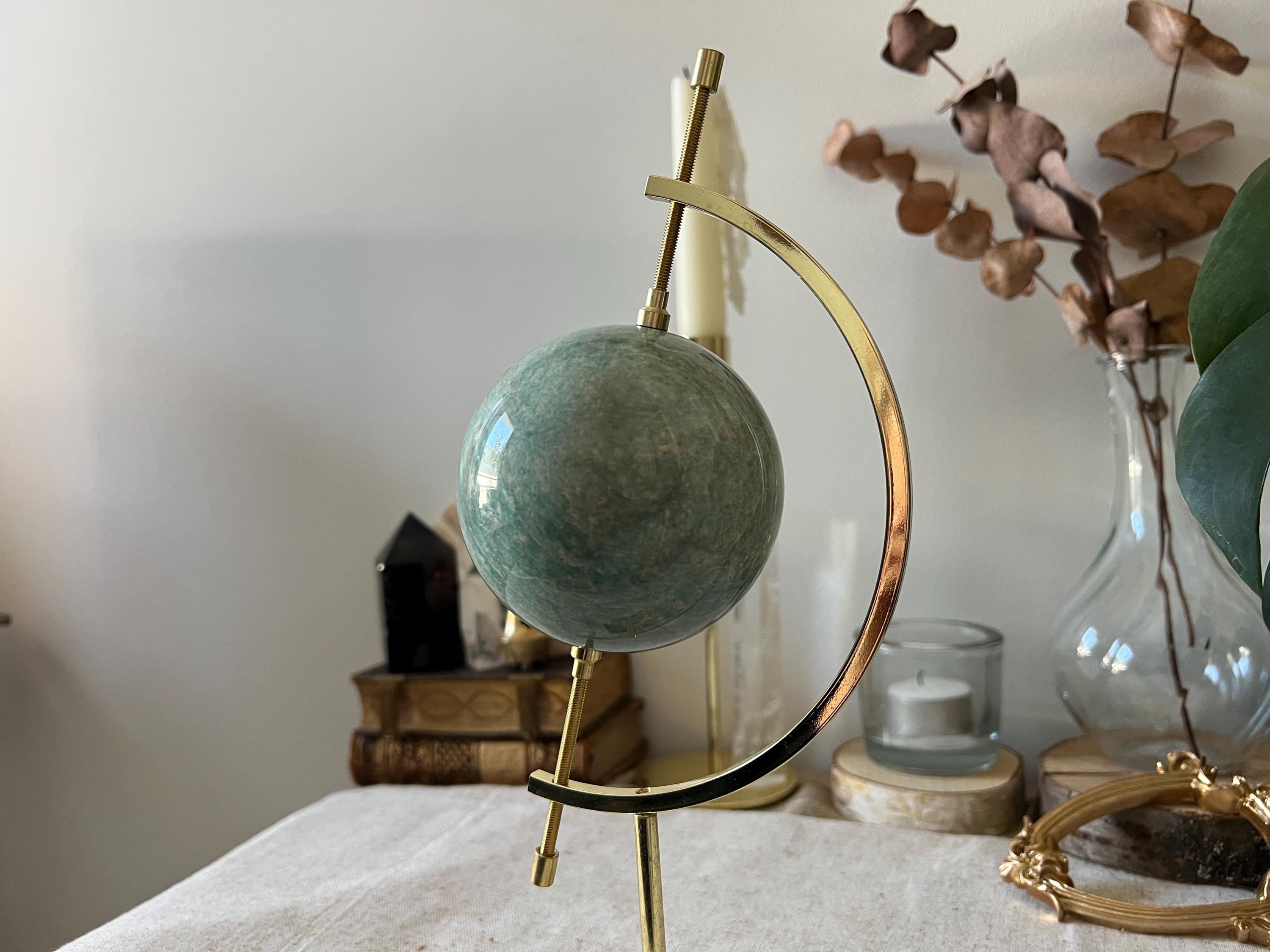 Natural Amazonite Sphere – Gem Quality, 733 g, 8 cm, with Golden Renaissance-Style Stand