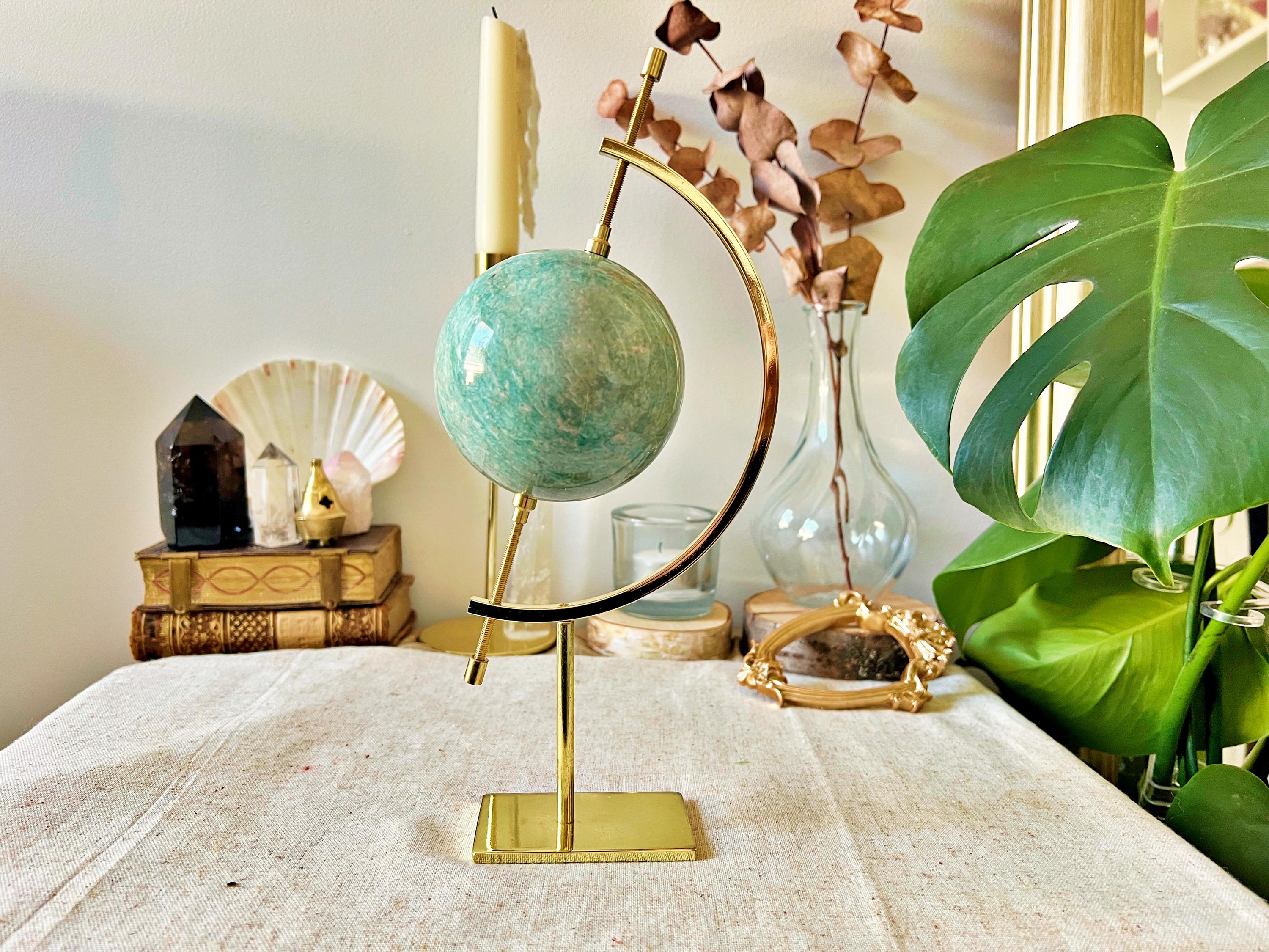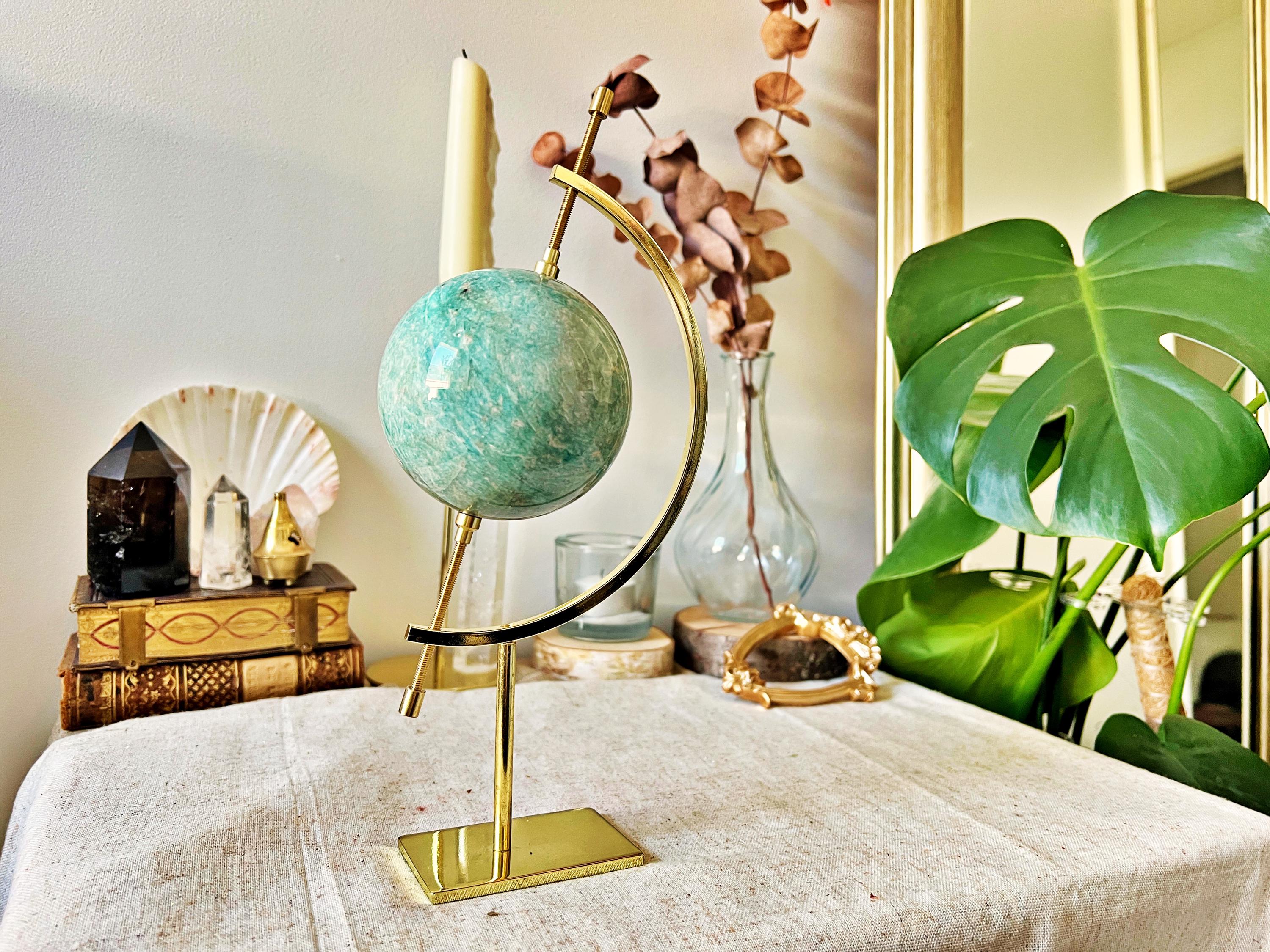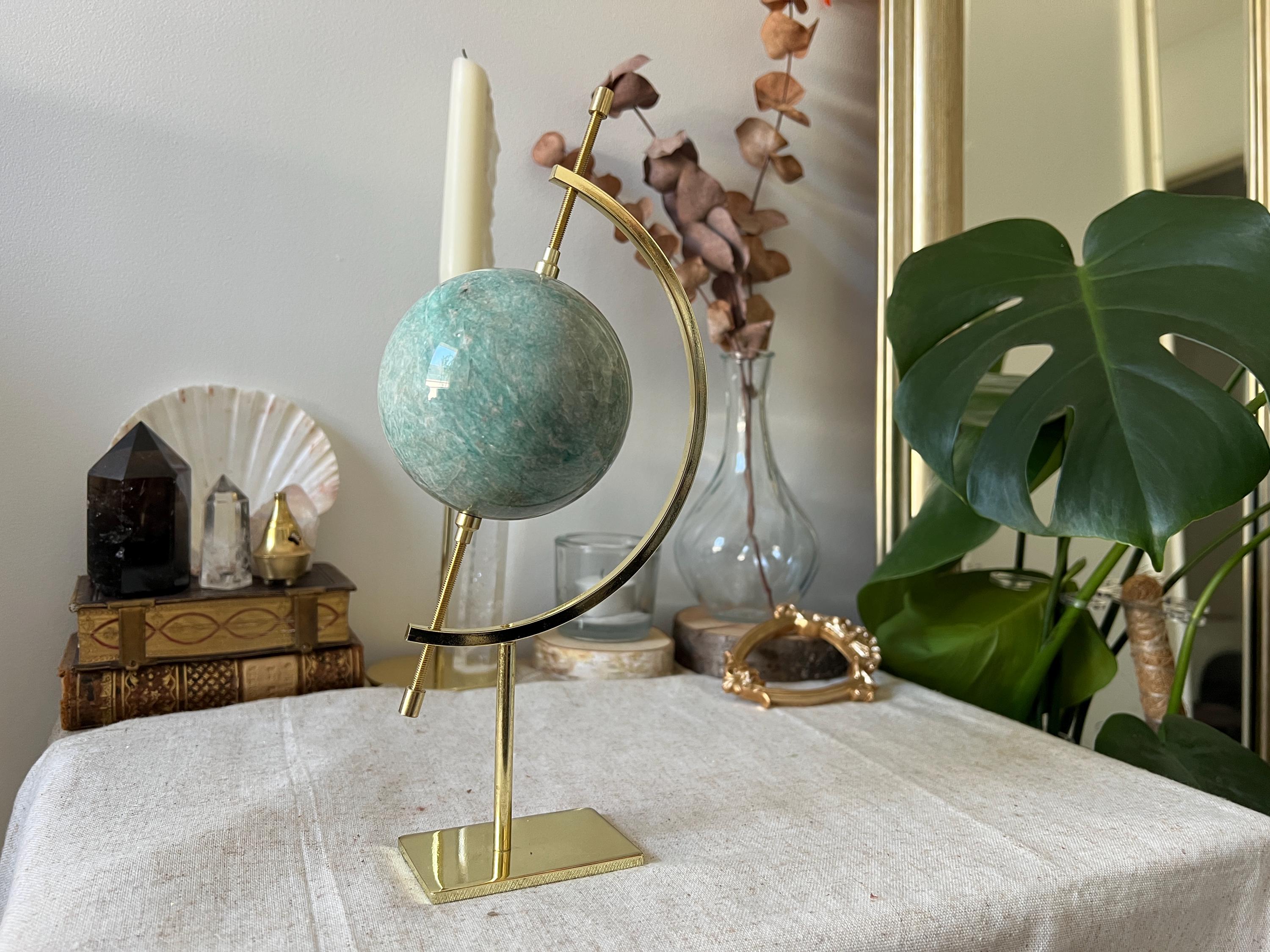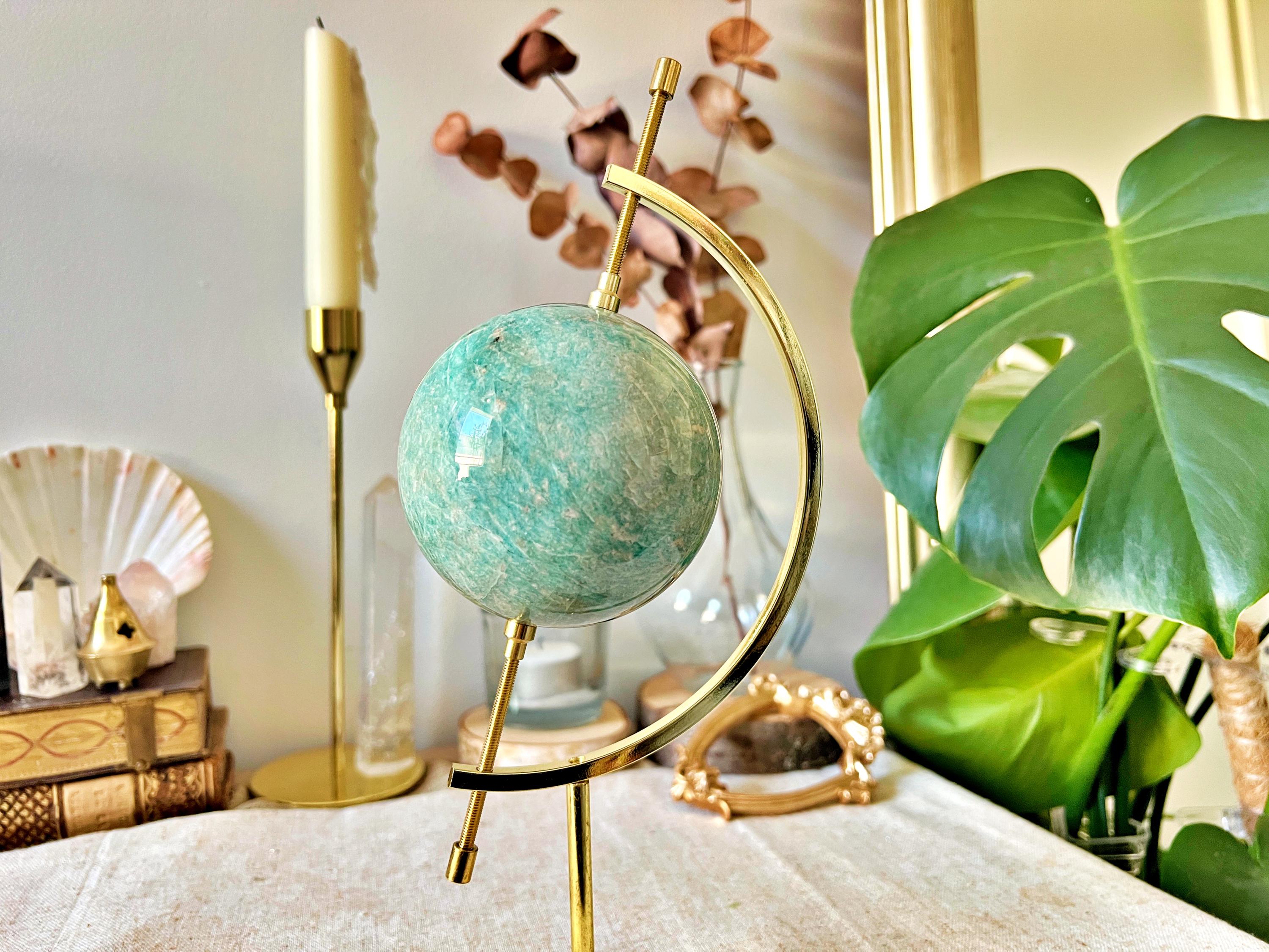 An exceptional natural amazonite sphere, carved from rare gem-quality material. Its vivid blue-green shades display subtle shimmering effects that beautifully catch the light.