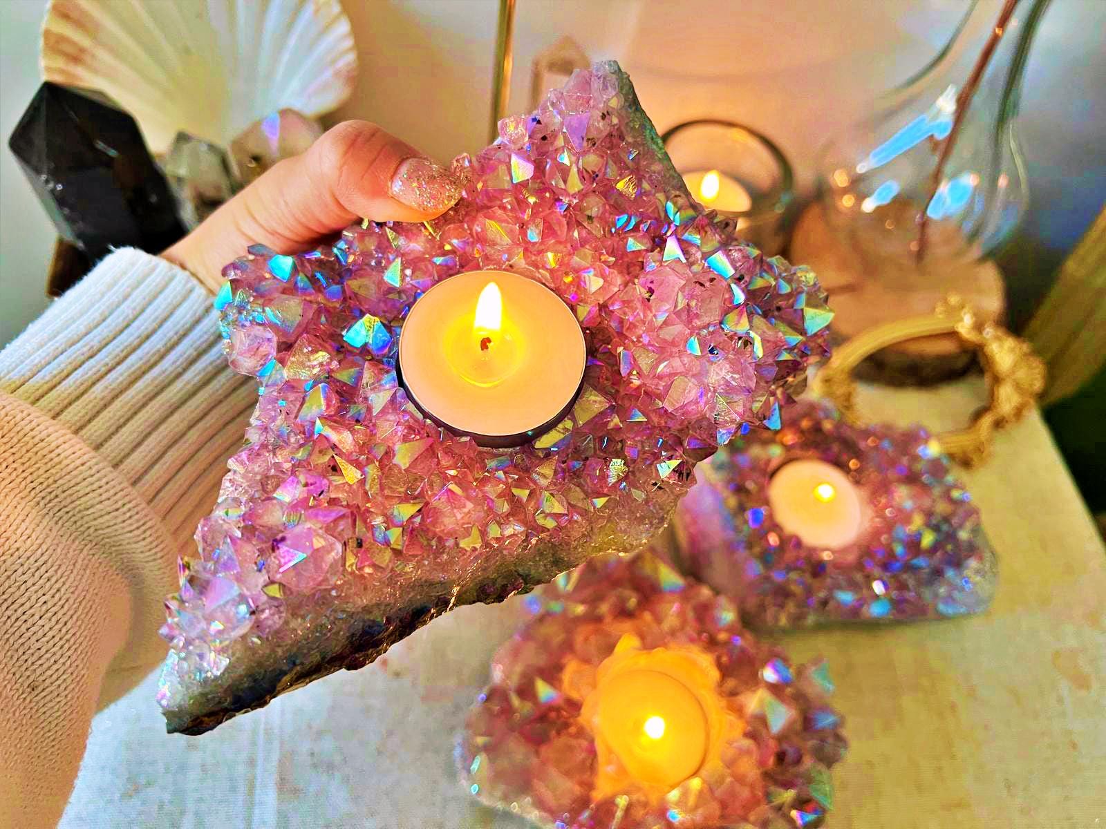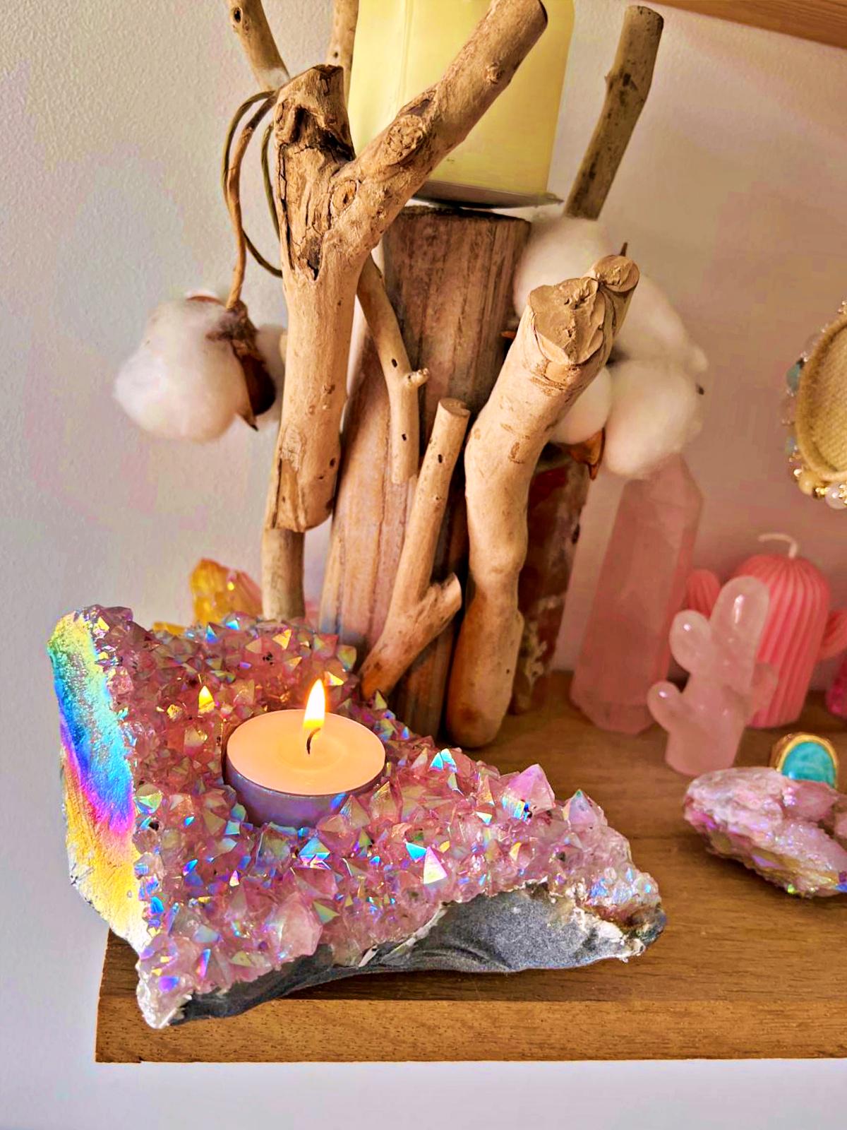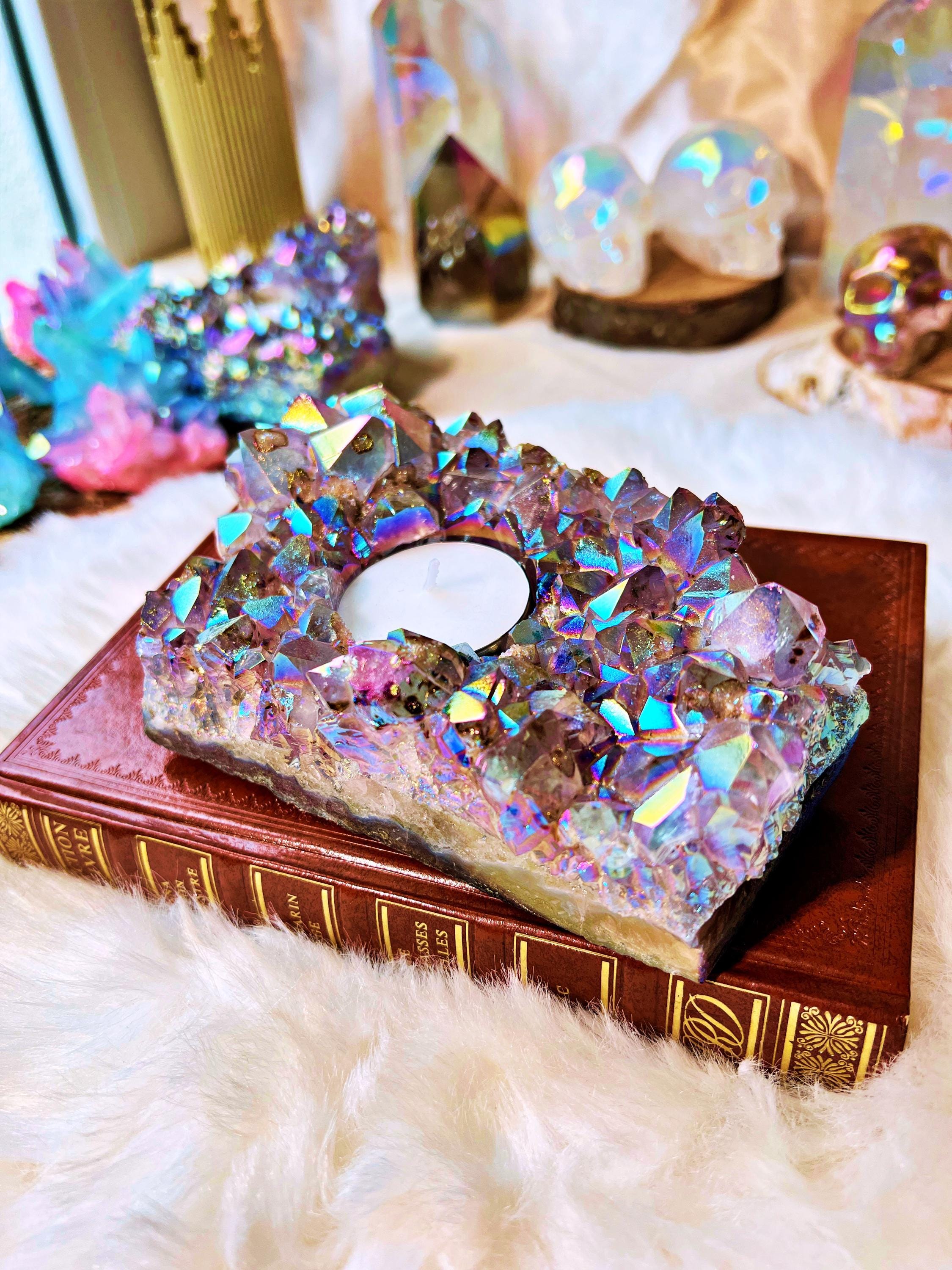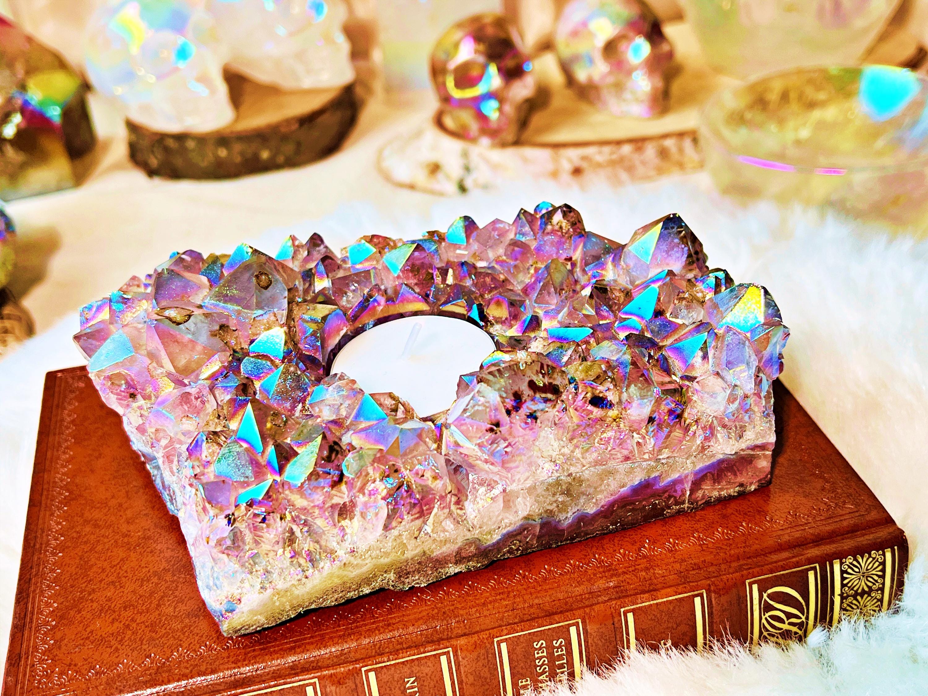 A unique candle holder, crafted from a natural amethyst geode with exceptional crystal points.
