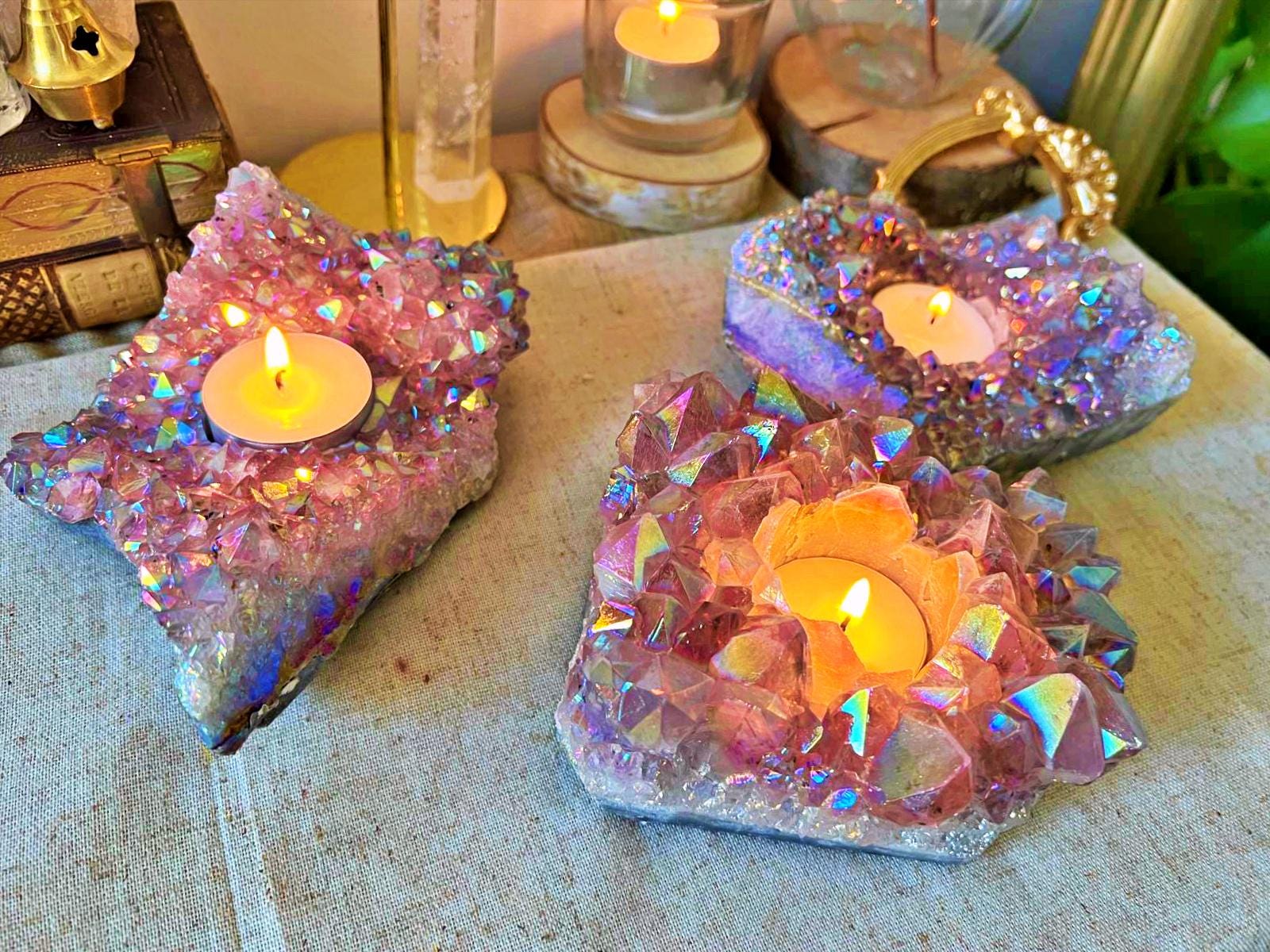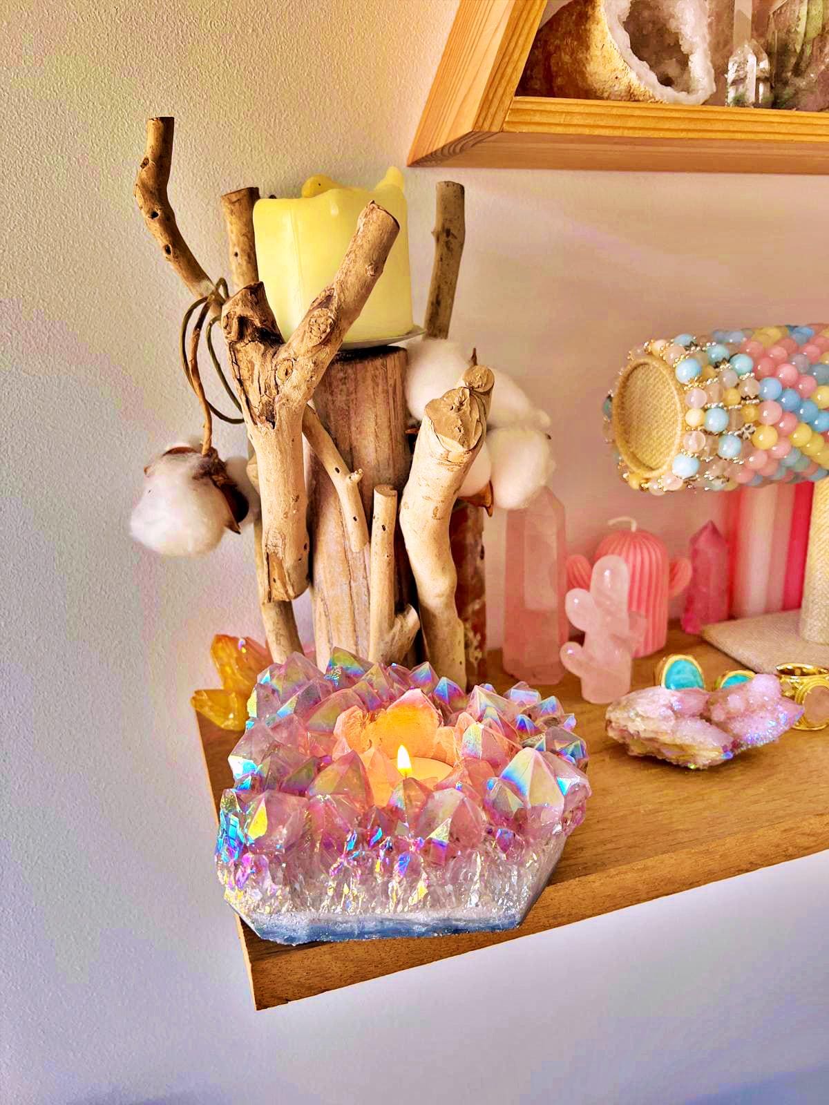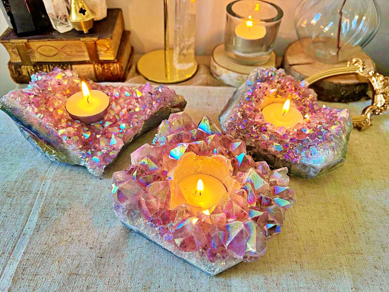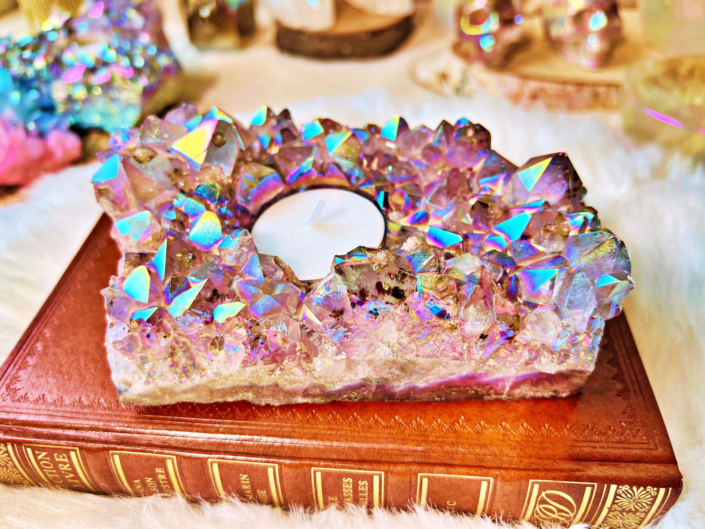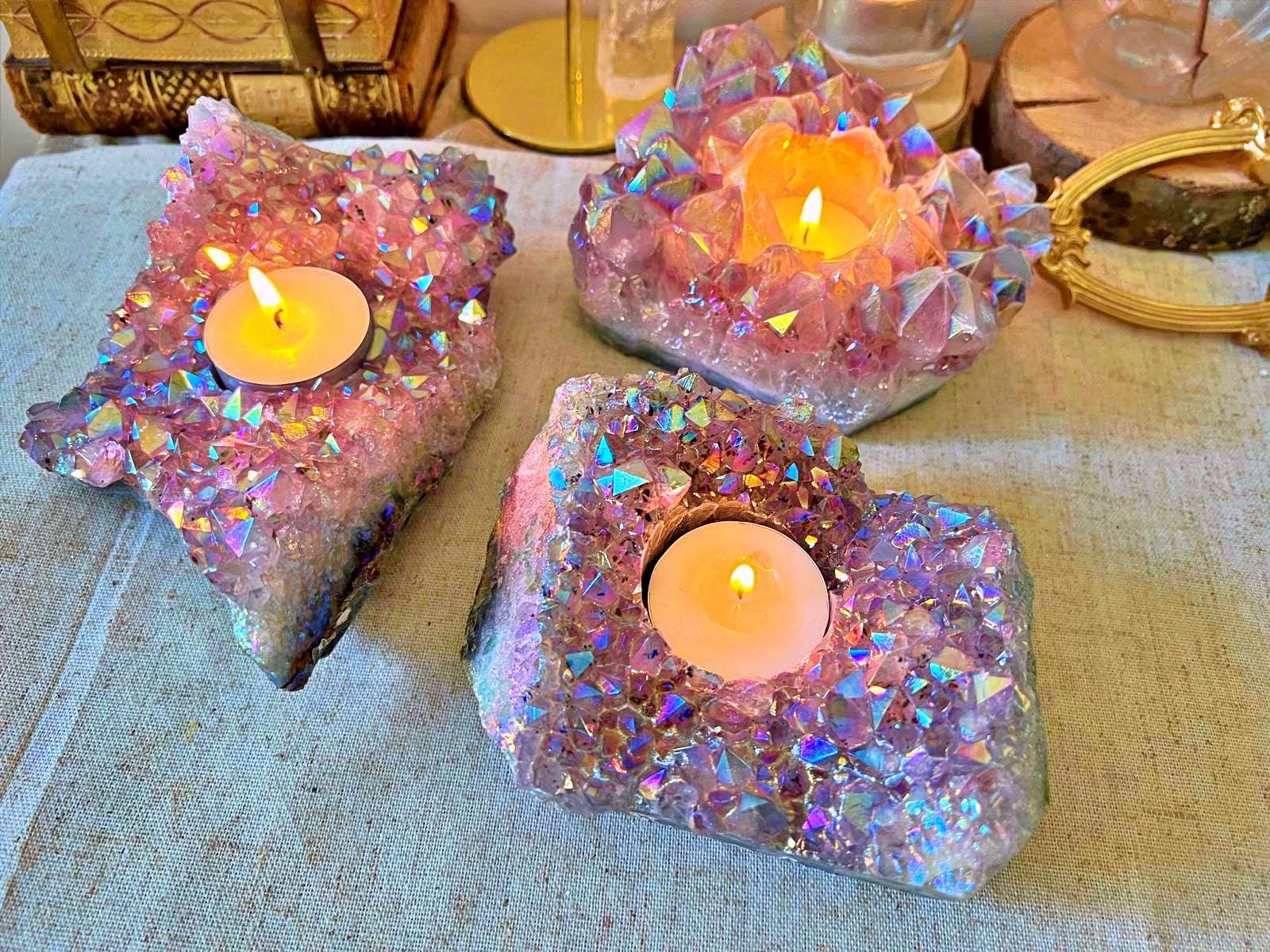 A unique candle holder, crafted from a natural amethyst geode with exceptional crystal points.