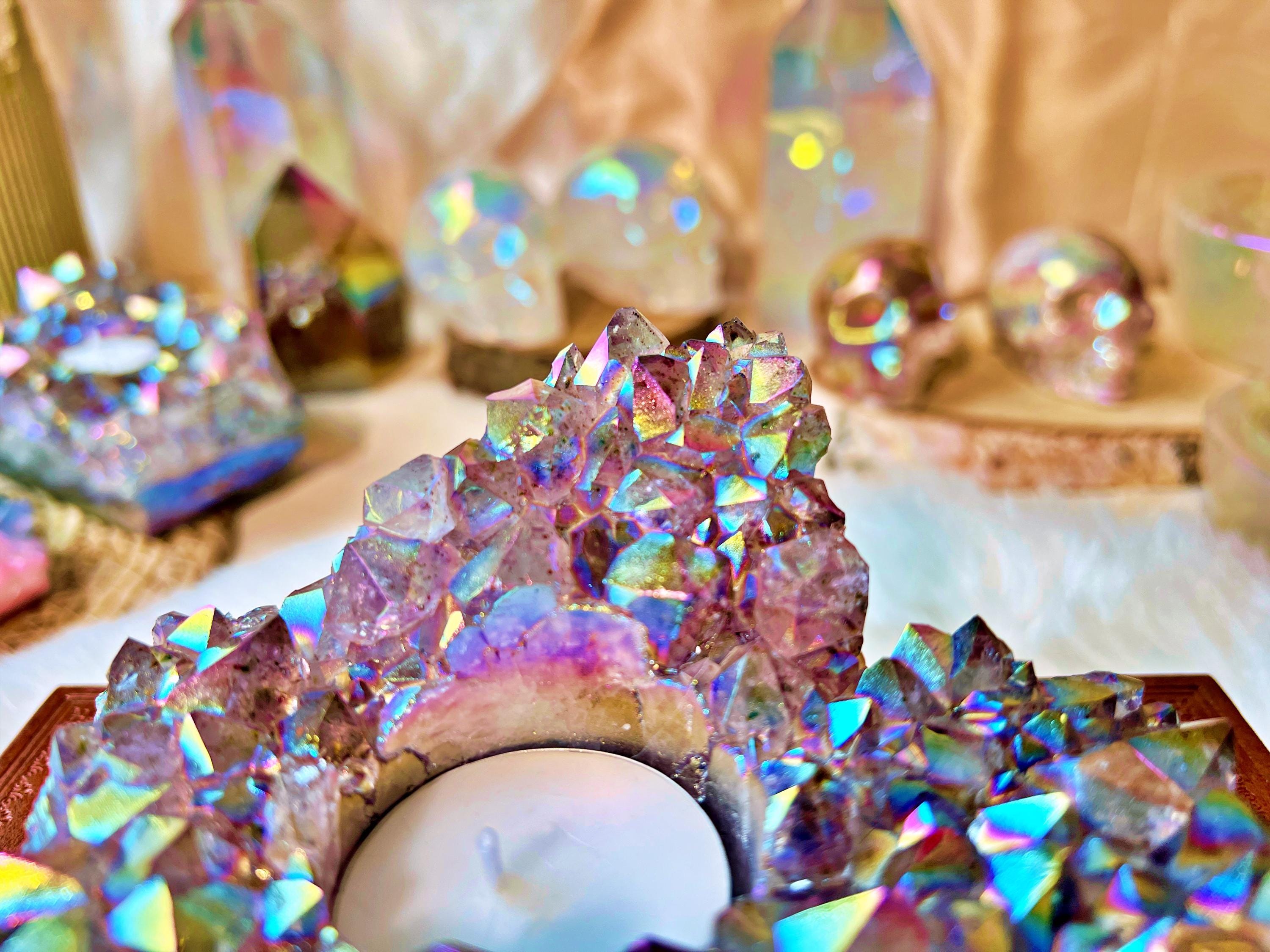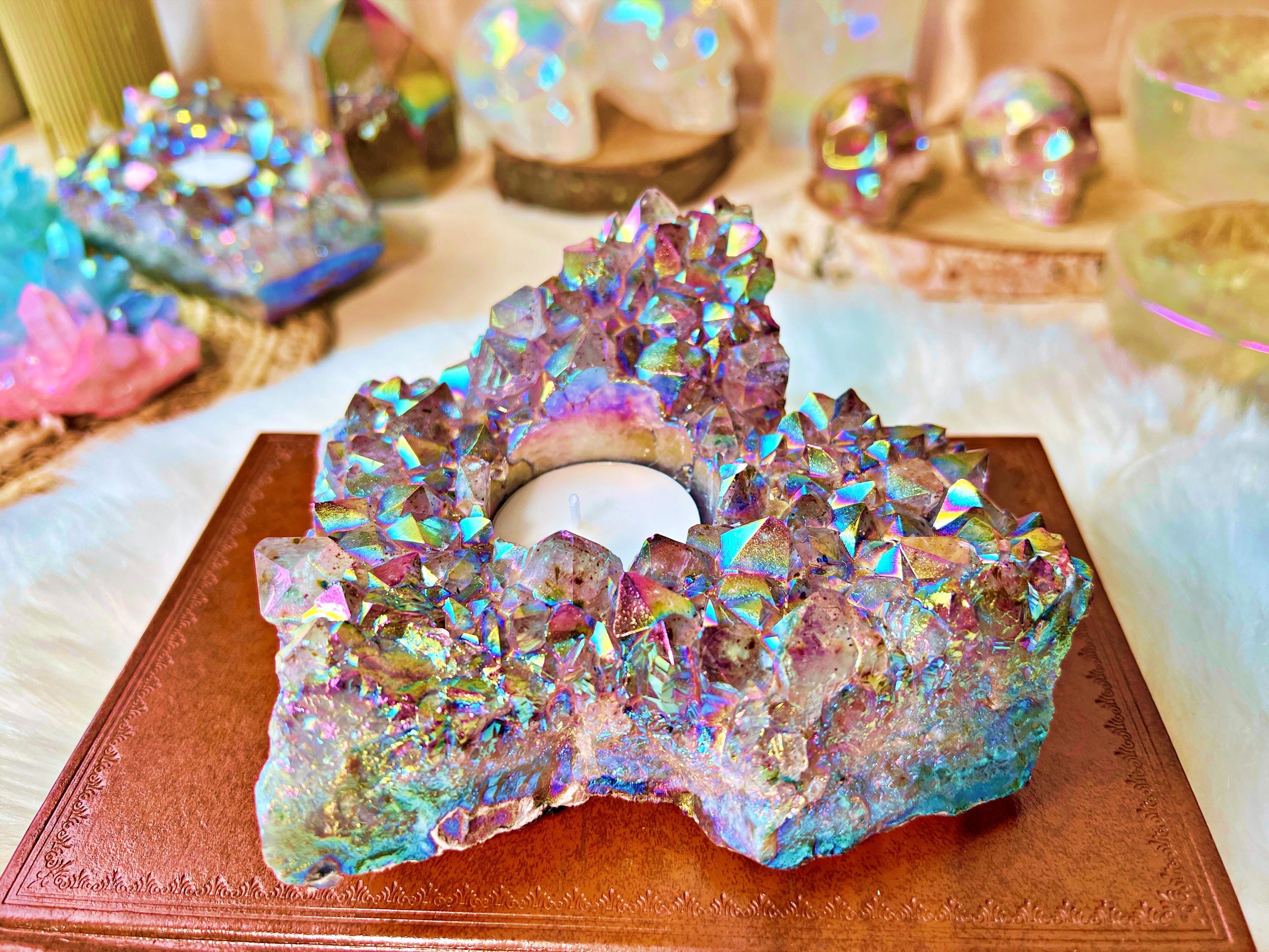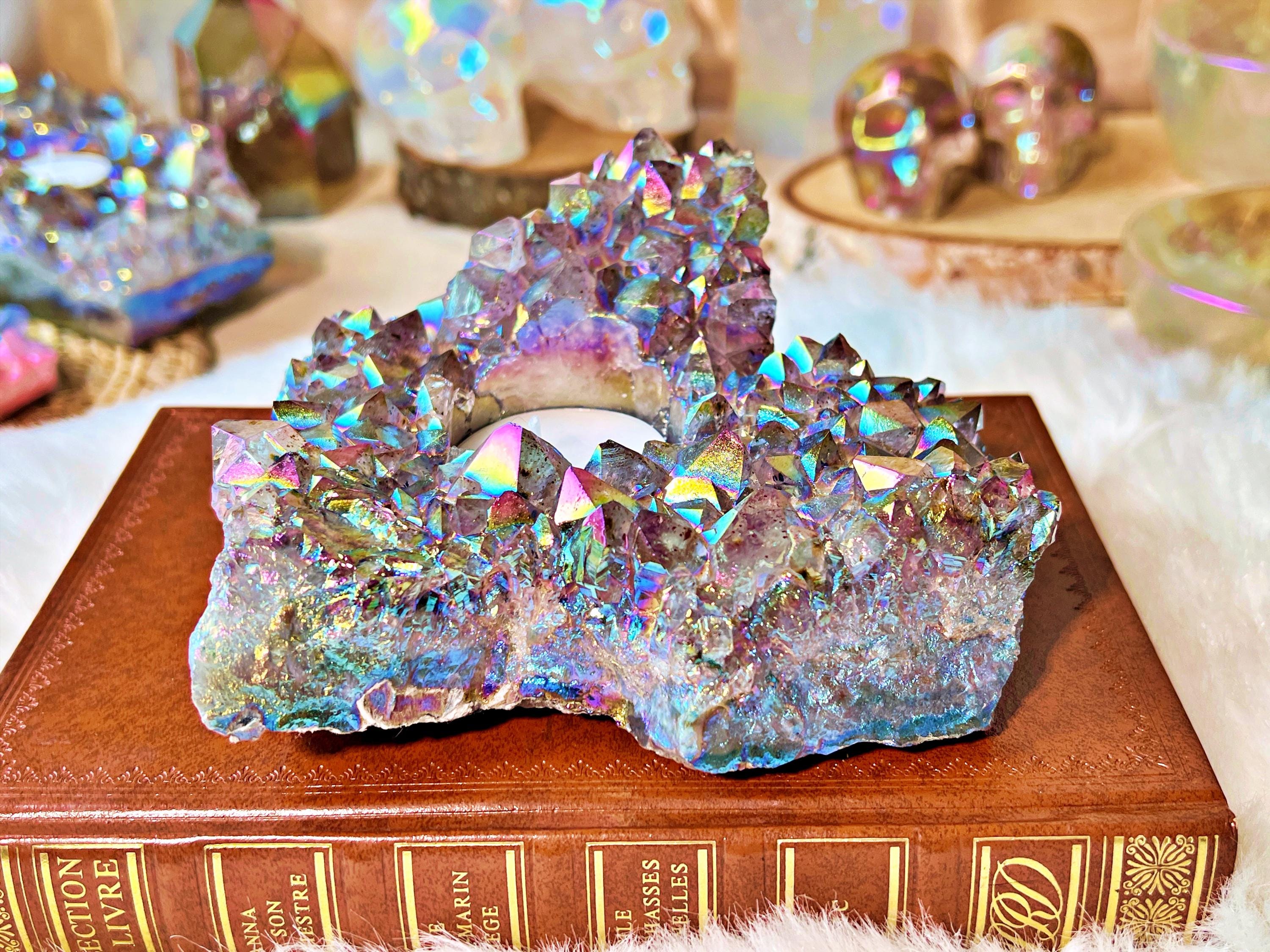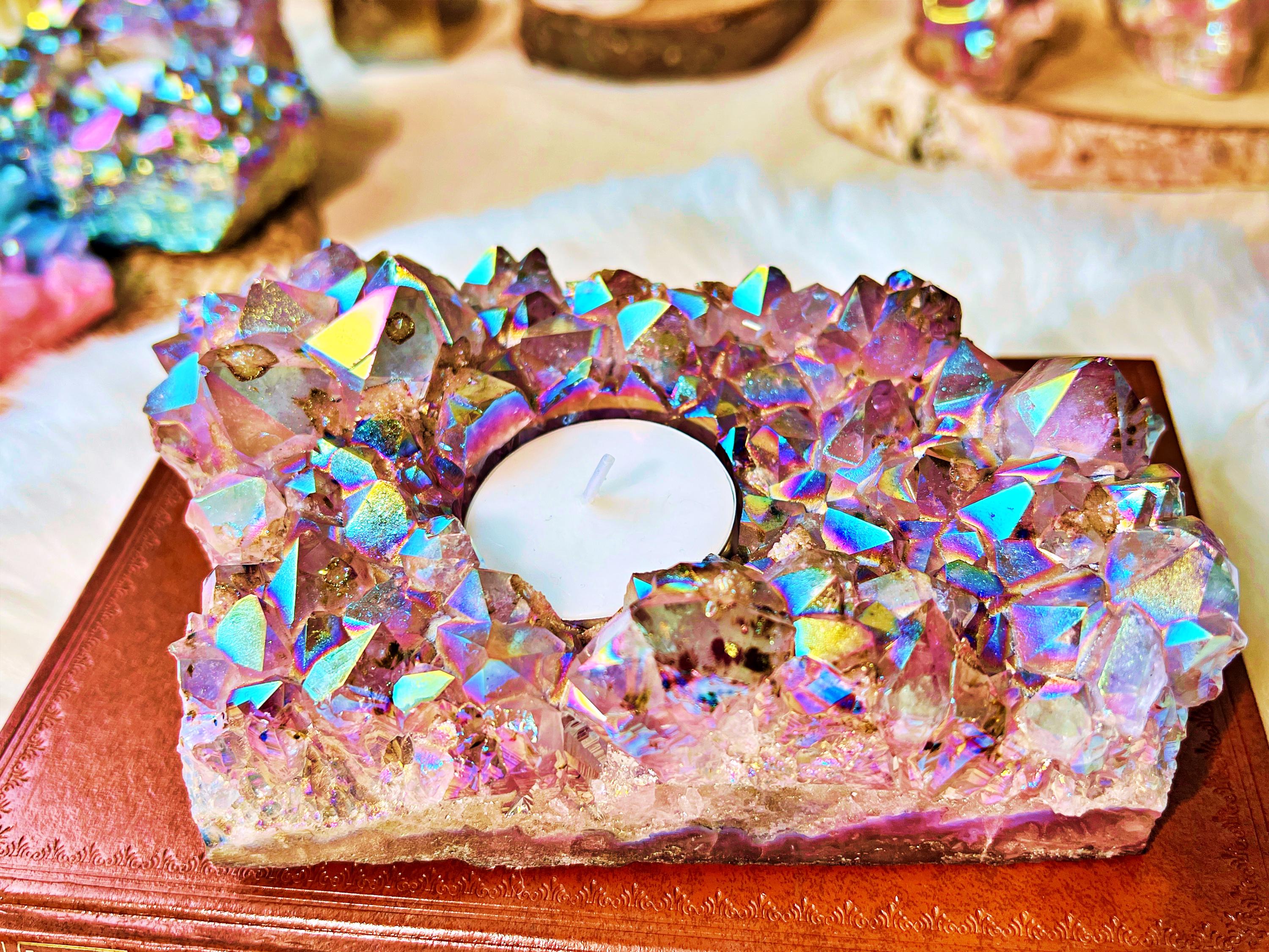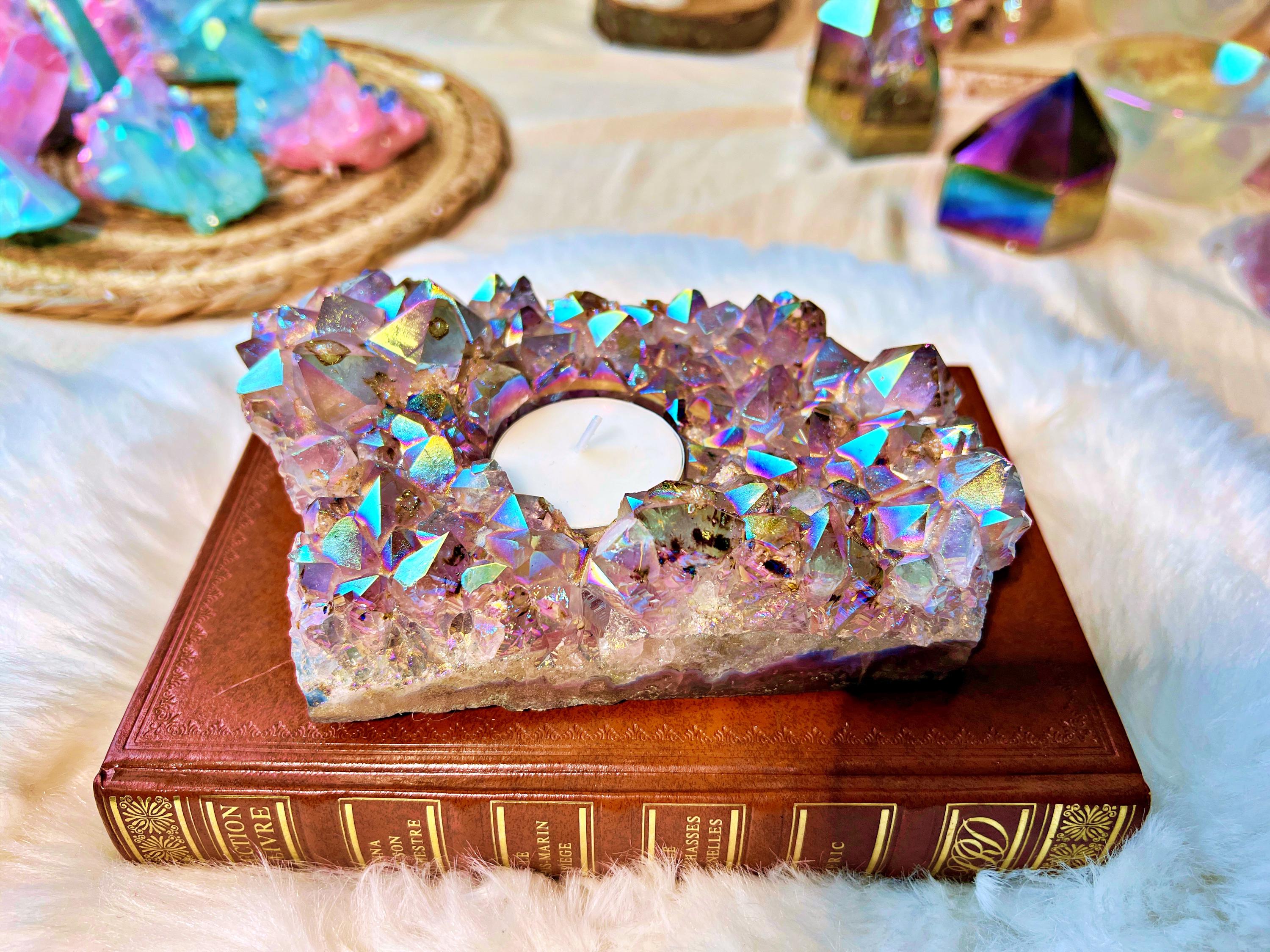 The natural deep-purple amethyst is enhanced by an aura iridescent finish, creating multicolored reflections that shimmer beautifully in the candlelight.