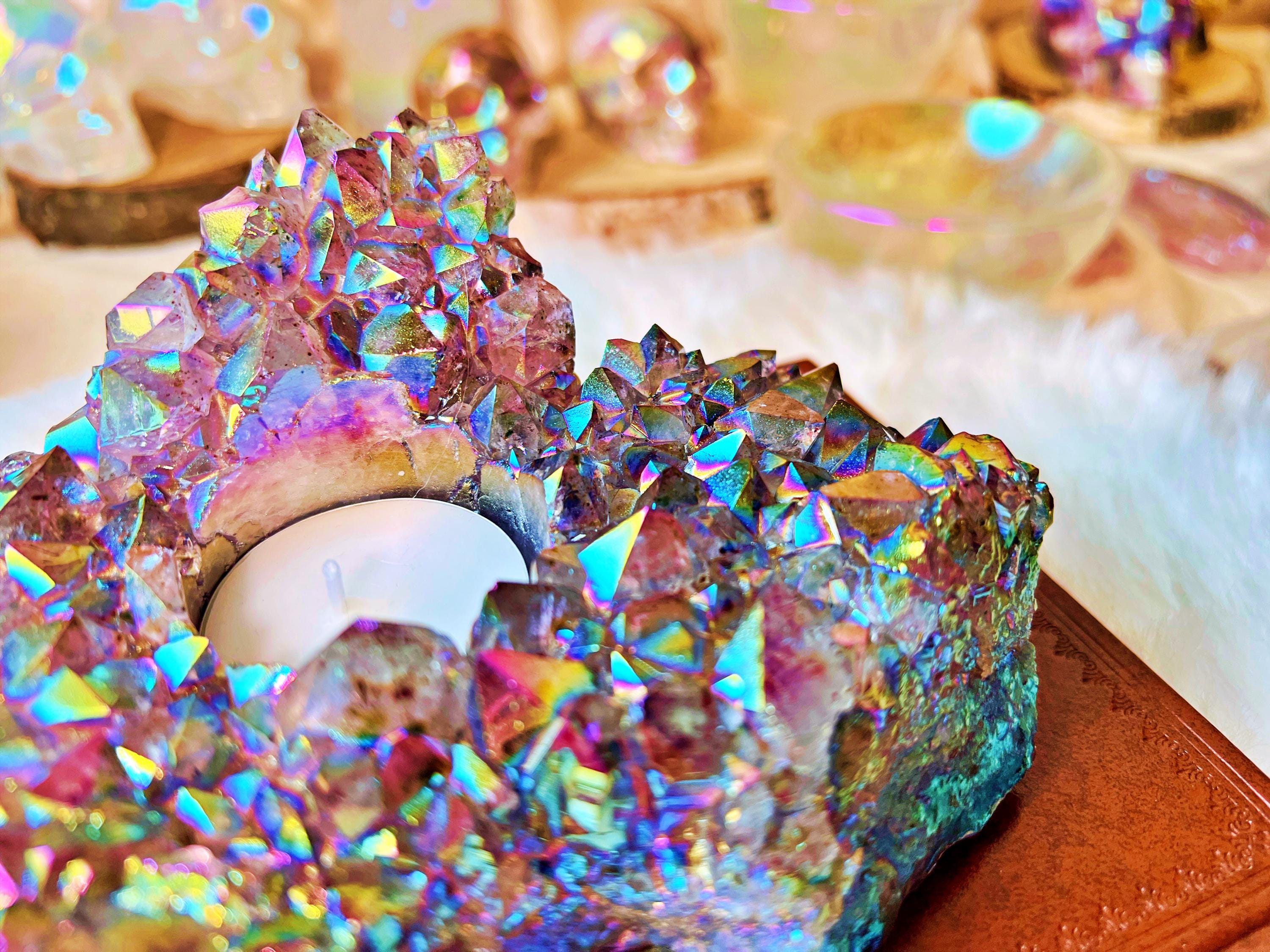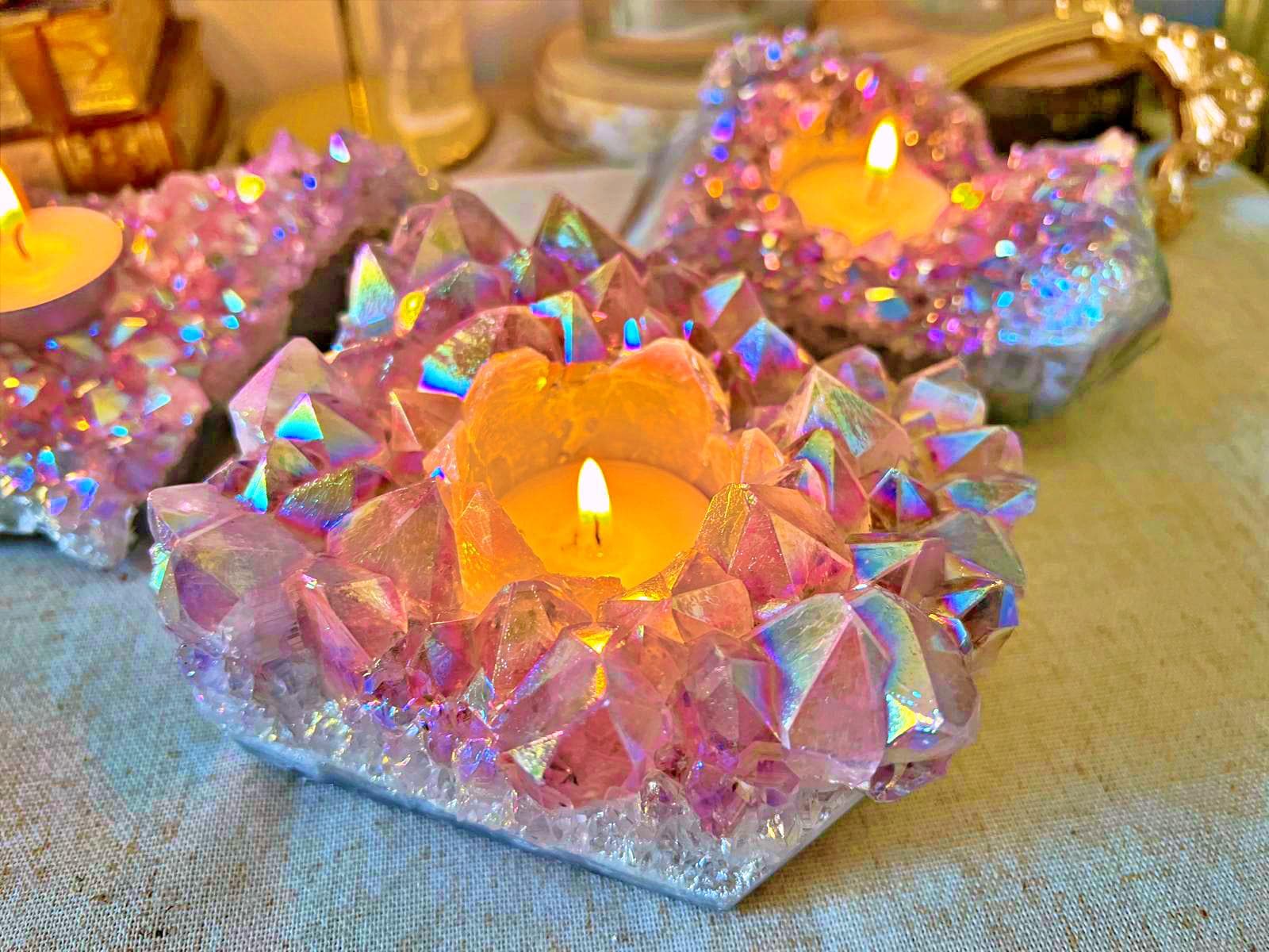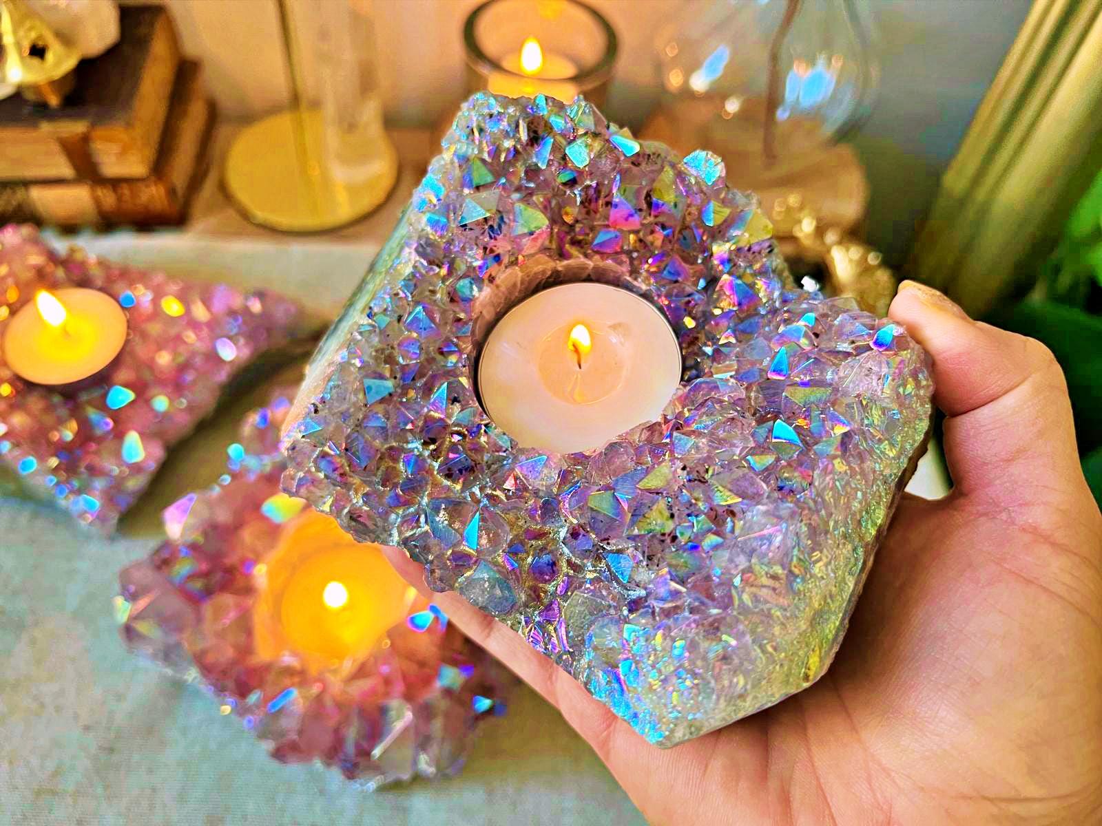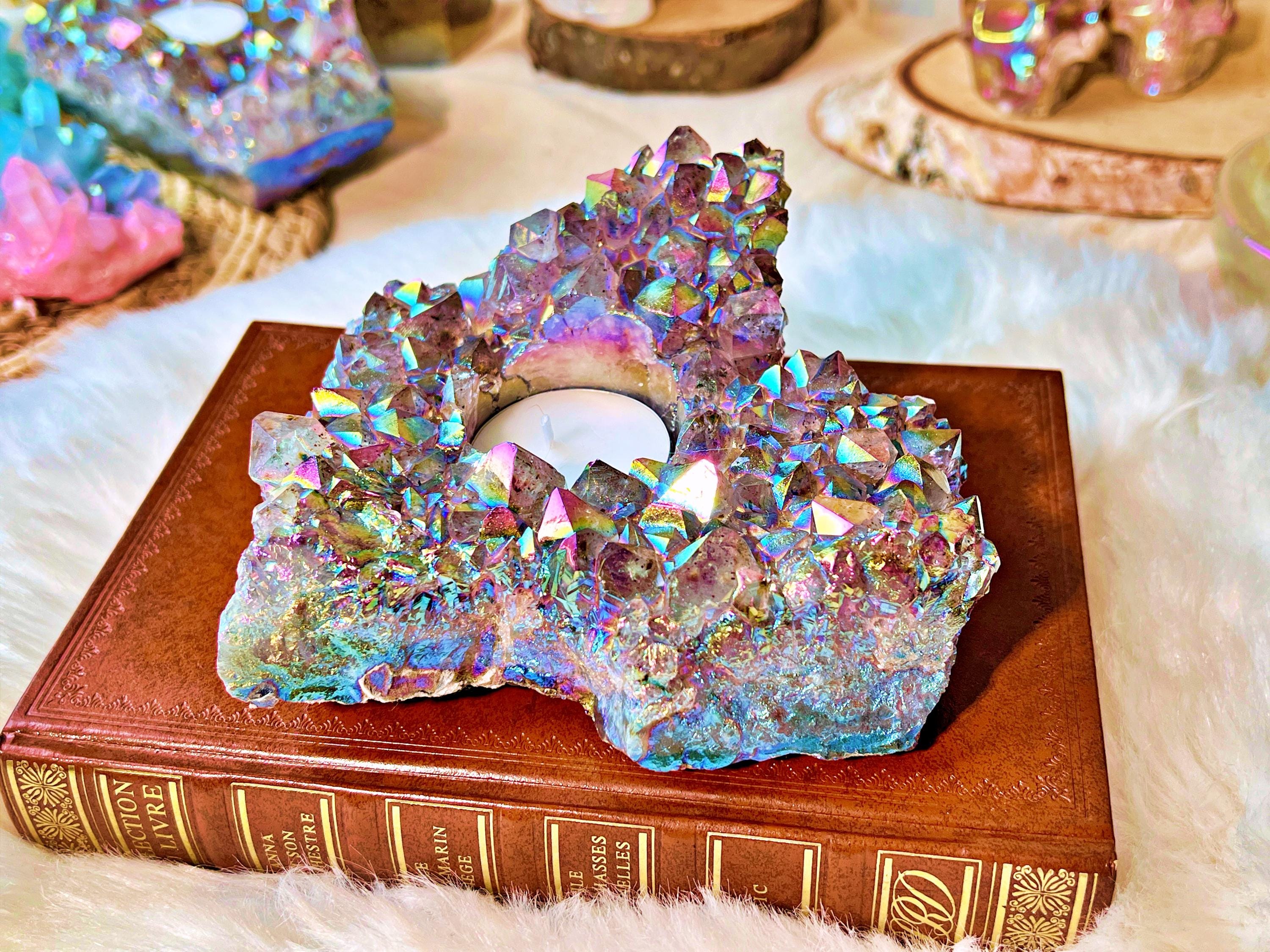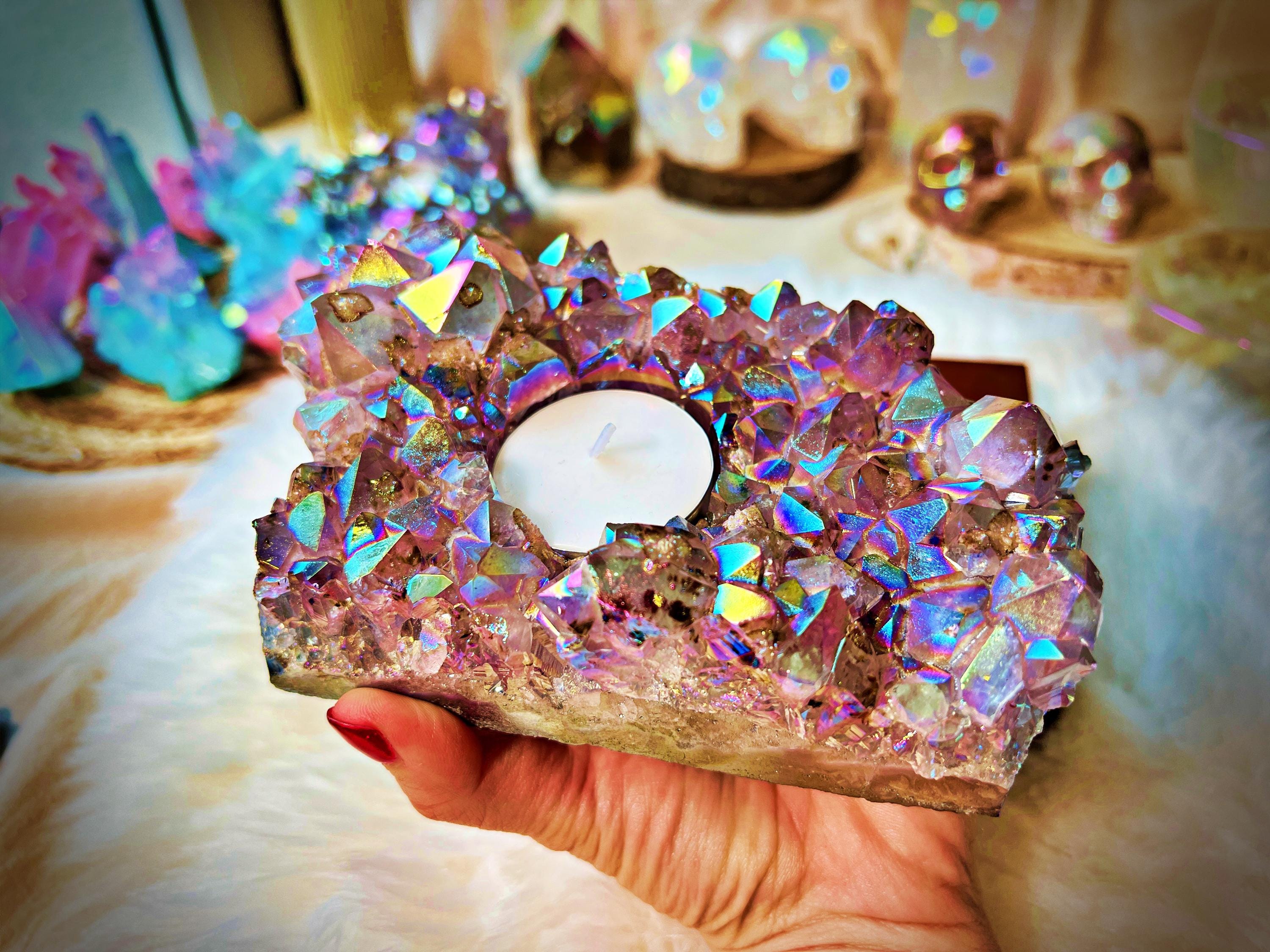 The natural deep-purple amethyst is enhanced by an aura iridescent finish, creating multicolored reflections that shimmer beautifully in the candlelight.