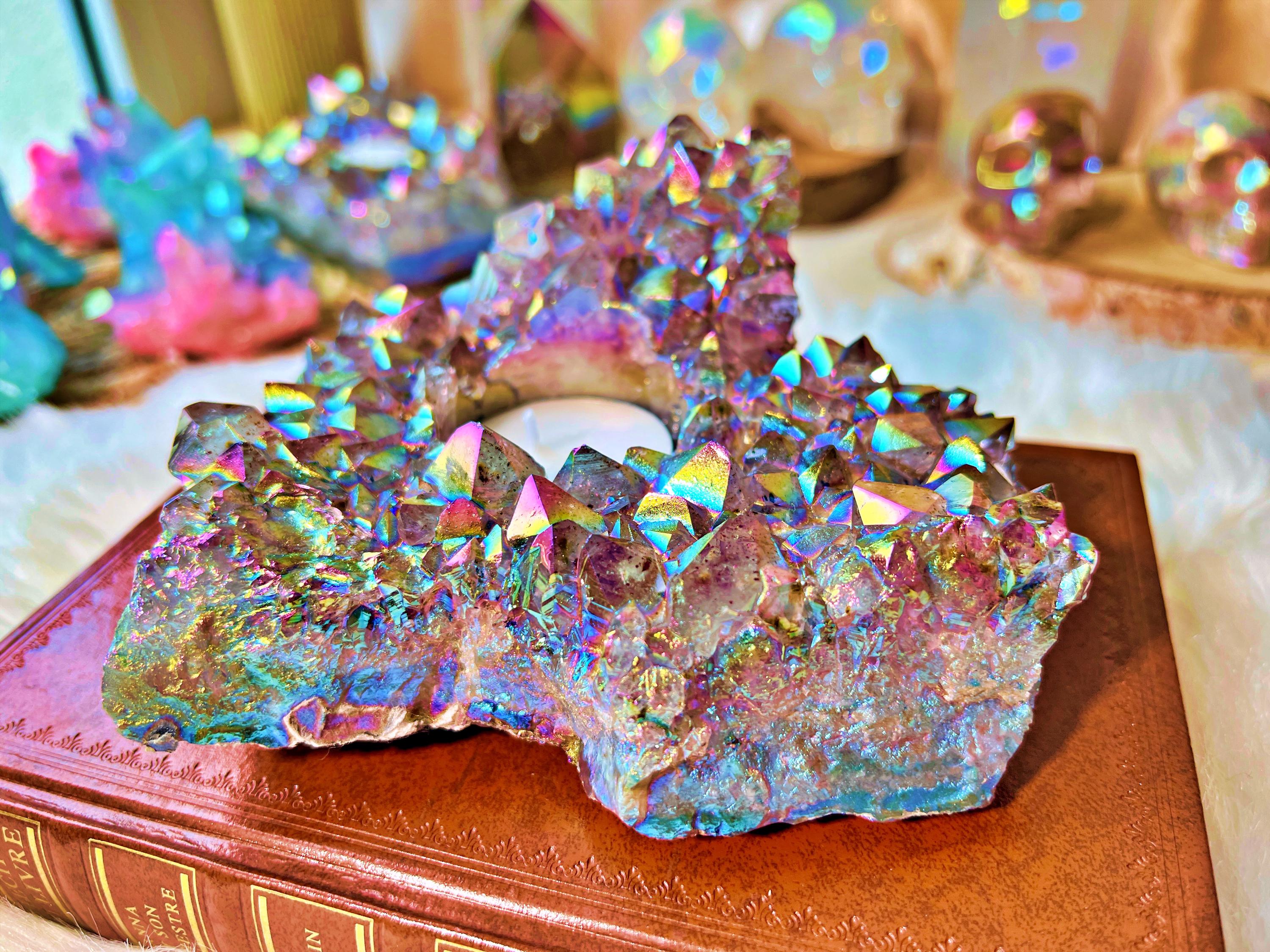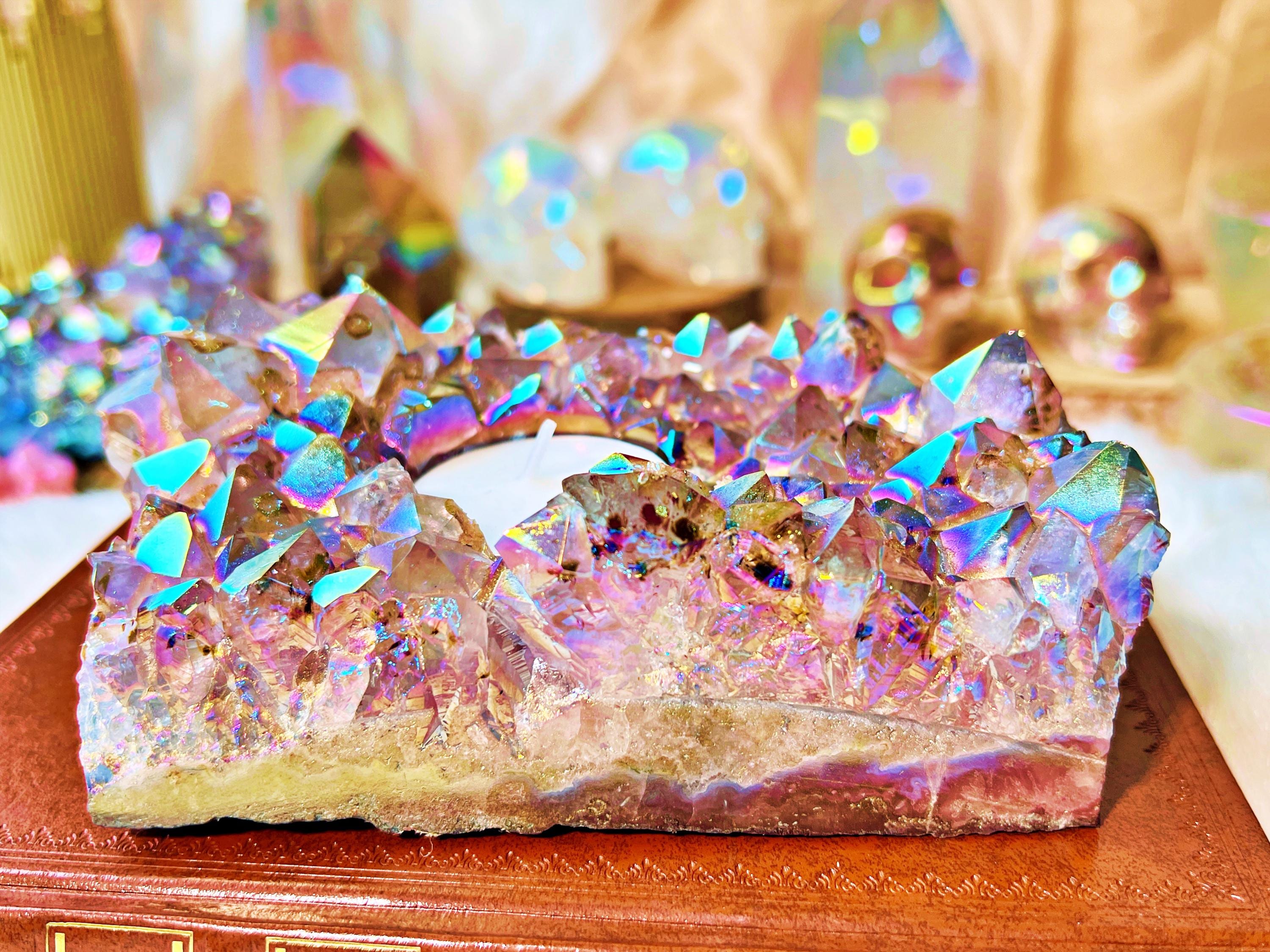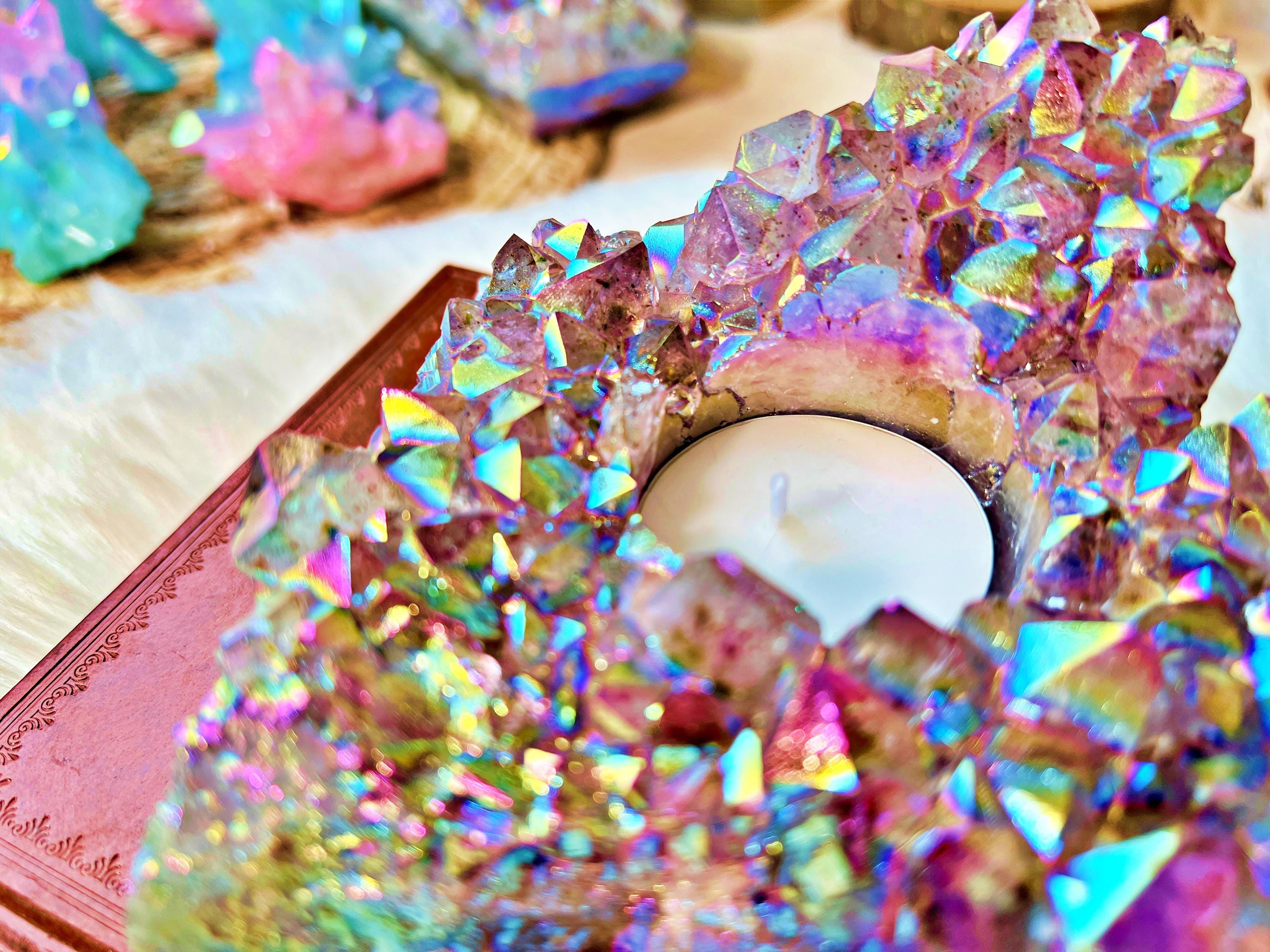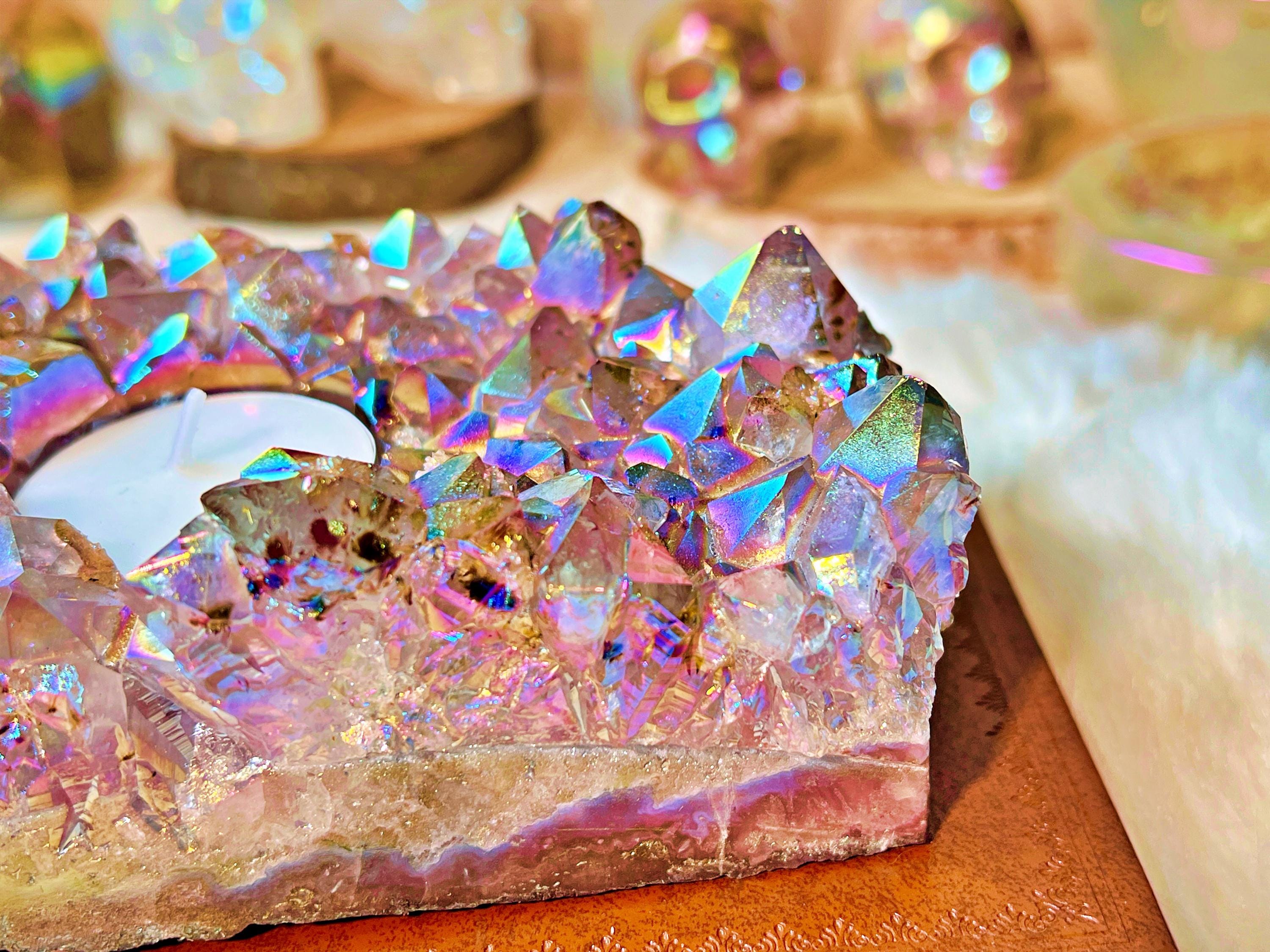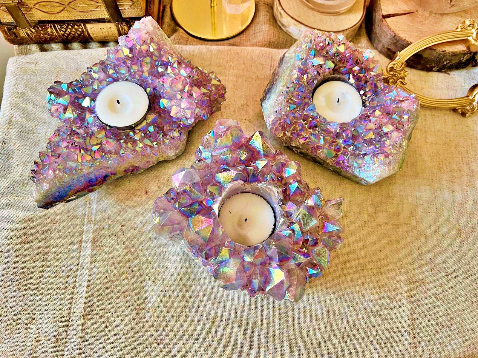 The natural deep-purple amethyst is enhanced by an aura iridescent finish, creating multicolored reflections that shimmer beautifully in the candlelight.