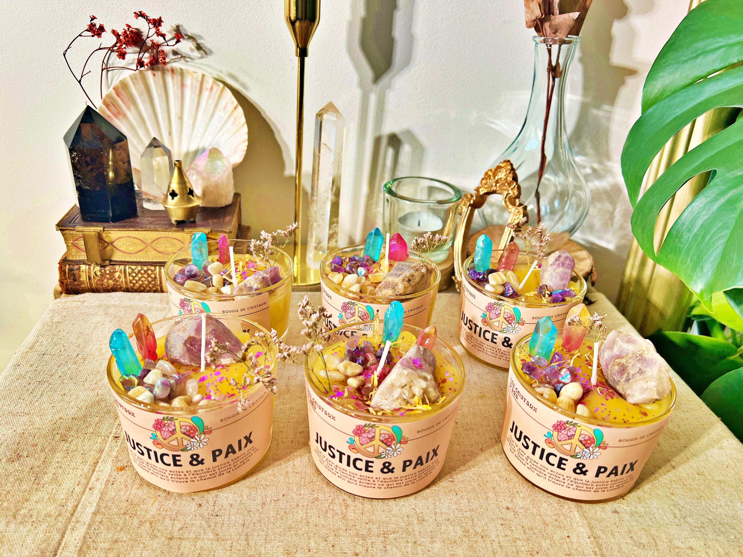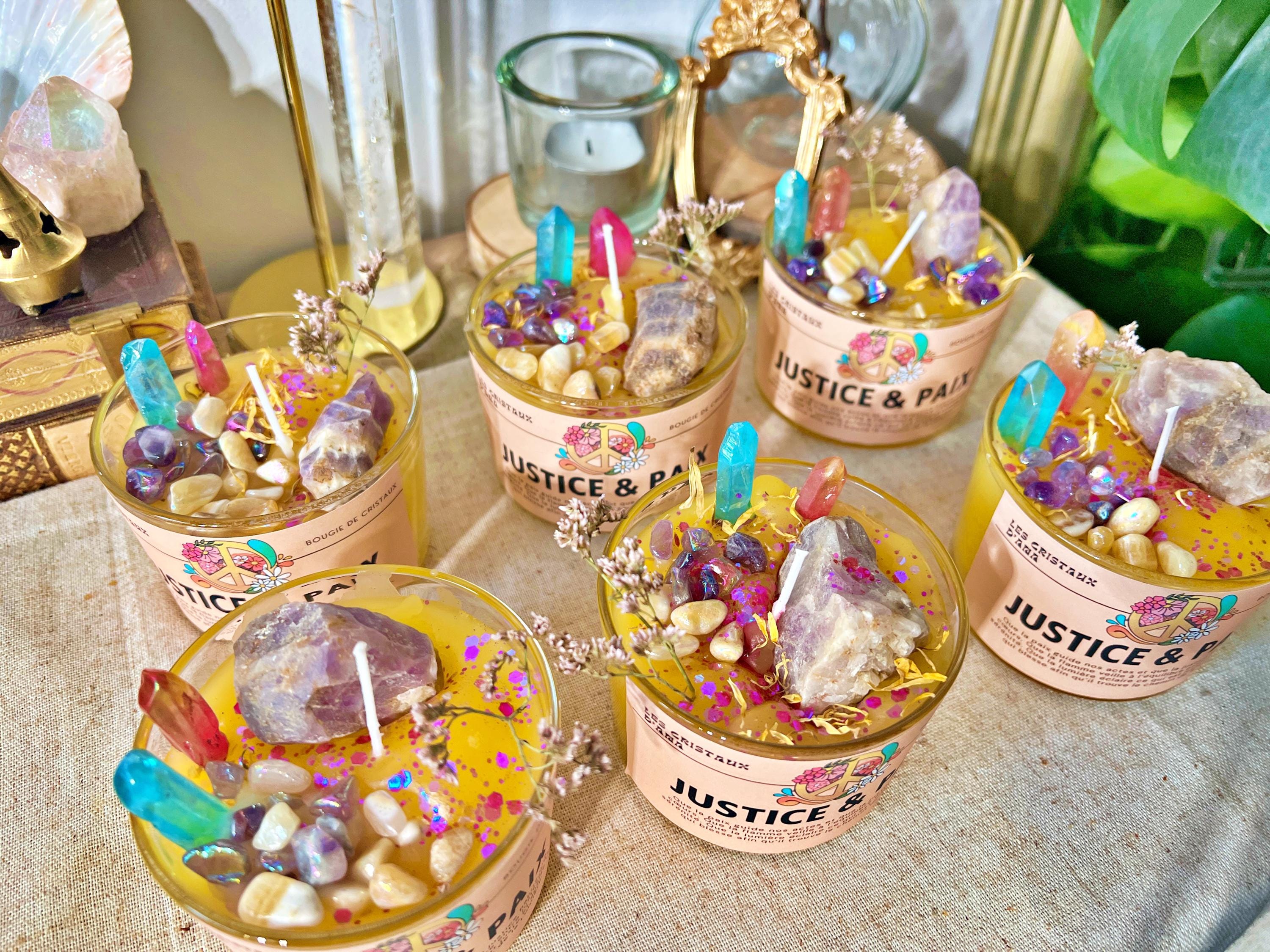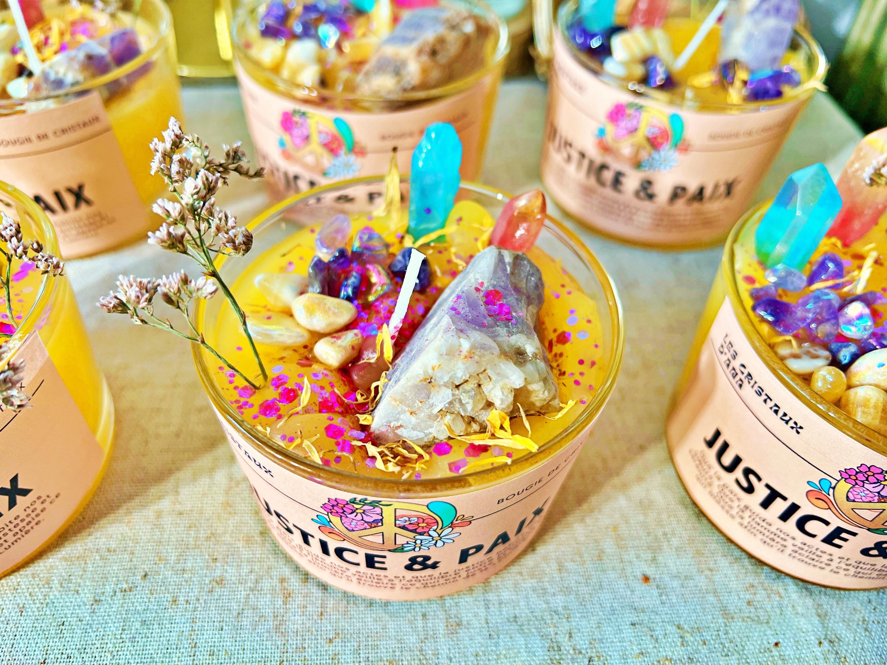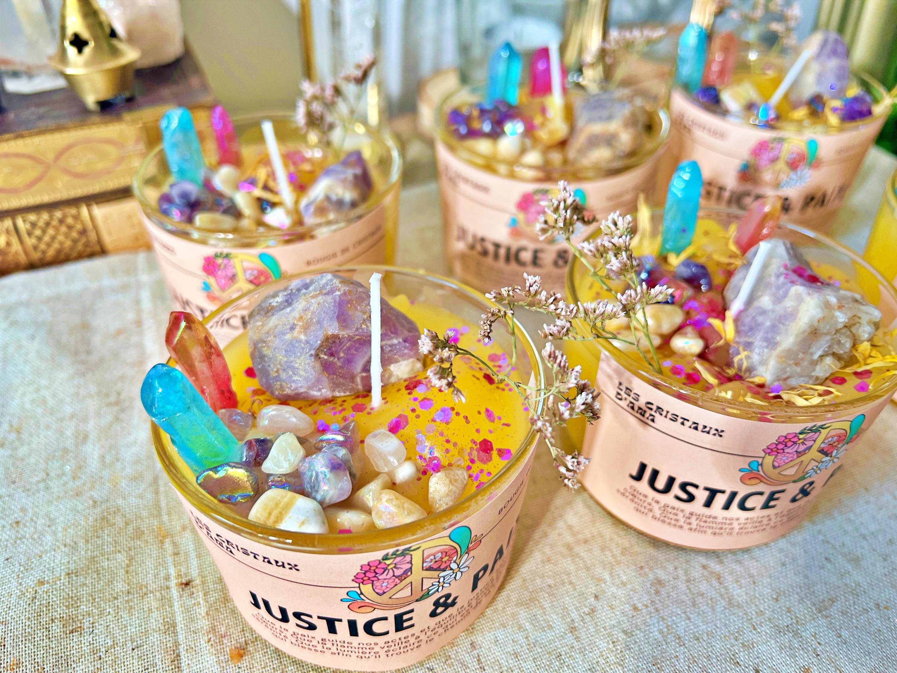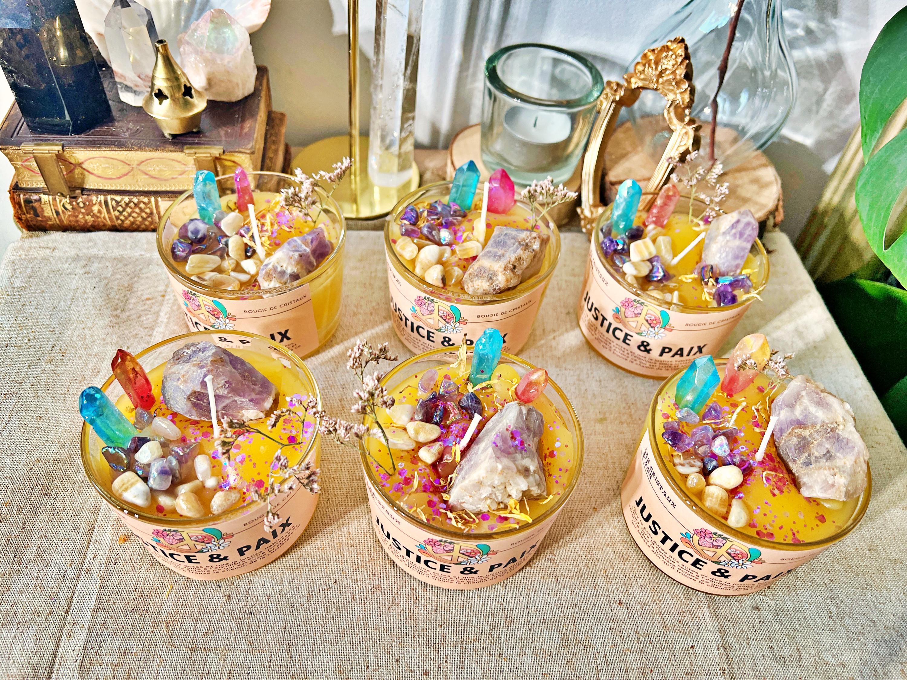 Composition : cire végétale naturelle, huiles essentielles et parfum vénusiens et mercuriens, cristaux d’Aura et d’améthyste véritables.