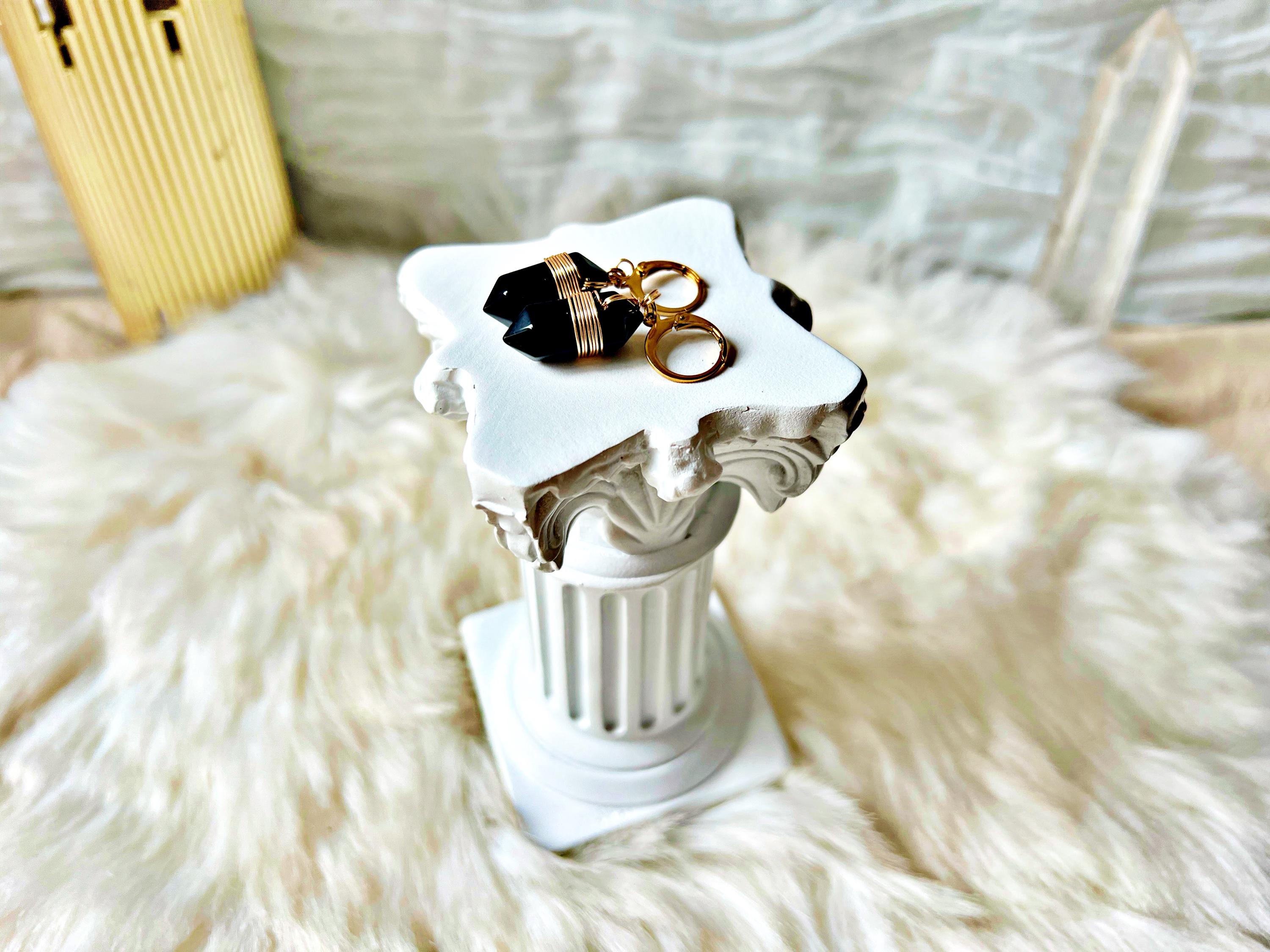 Mounted on gold-tone hoops, they blend mineral energy with timeless elegance — a piece both refined and magnetic.