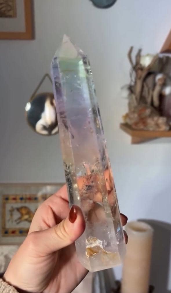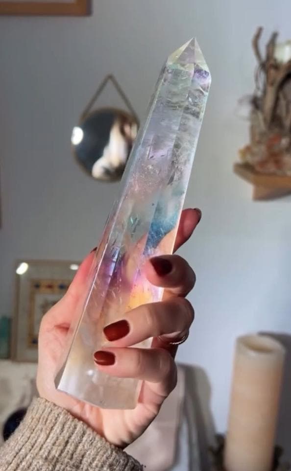 This tower weighs 700 g and stands 20 cm tall, revealing under each light a delicate play of rainbow flashes, pearly veil, and the clear purity of natural quartz beneath the Aura layer.