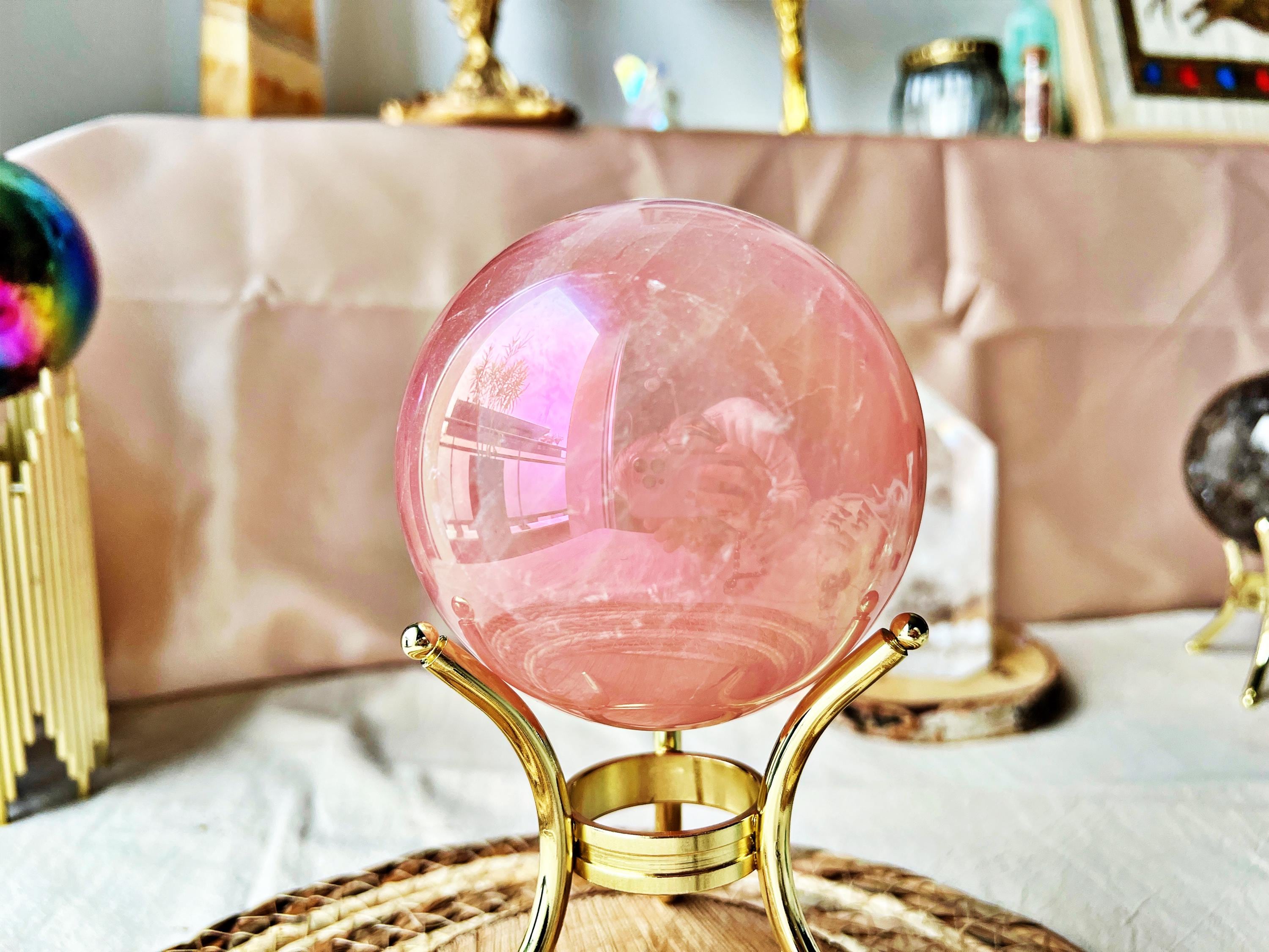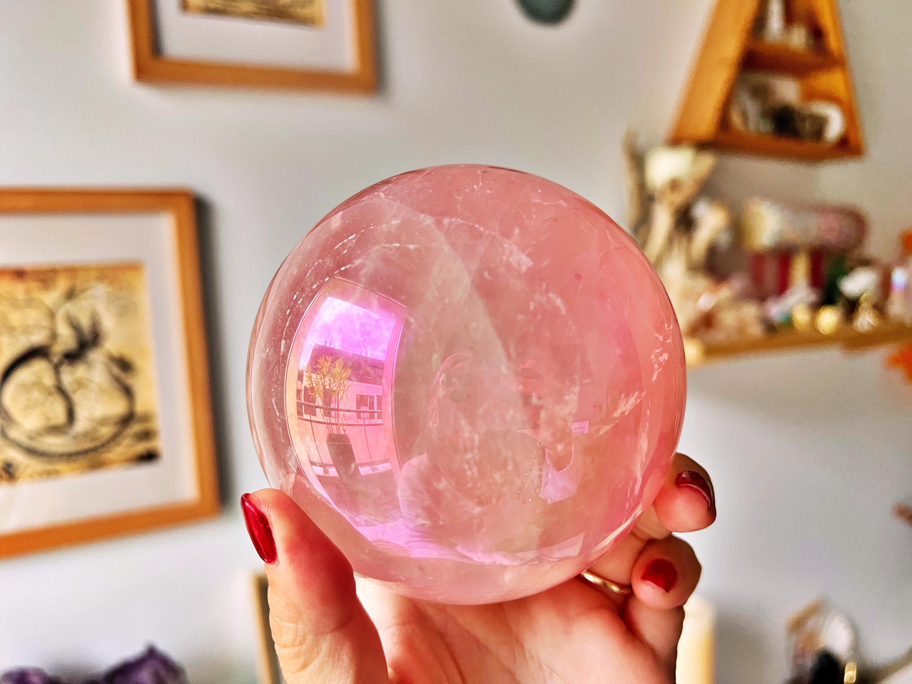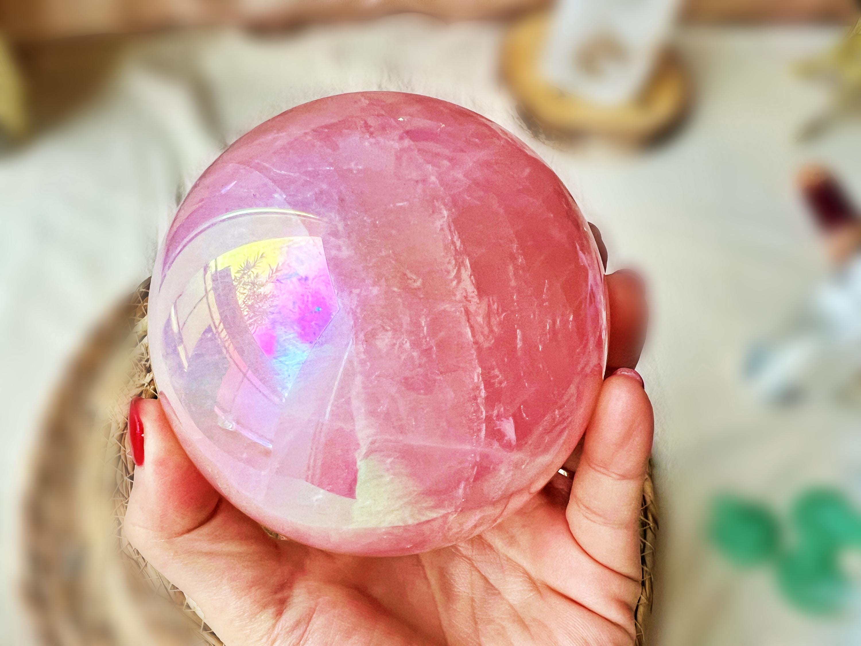 This 1.101 kg Rose Quartz sphere features an Aura finish, giving the surface subtle iridescent reflections with pink and opalescent undertones. The treatment highlights the natural translucency and internal textures of the quartz while preserving the stone’s original structure and volume.