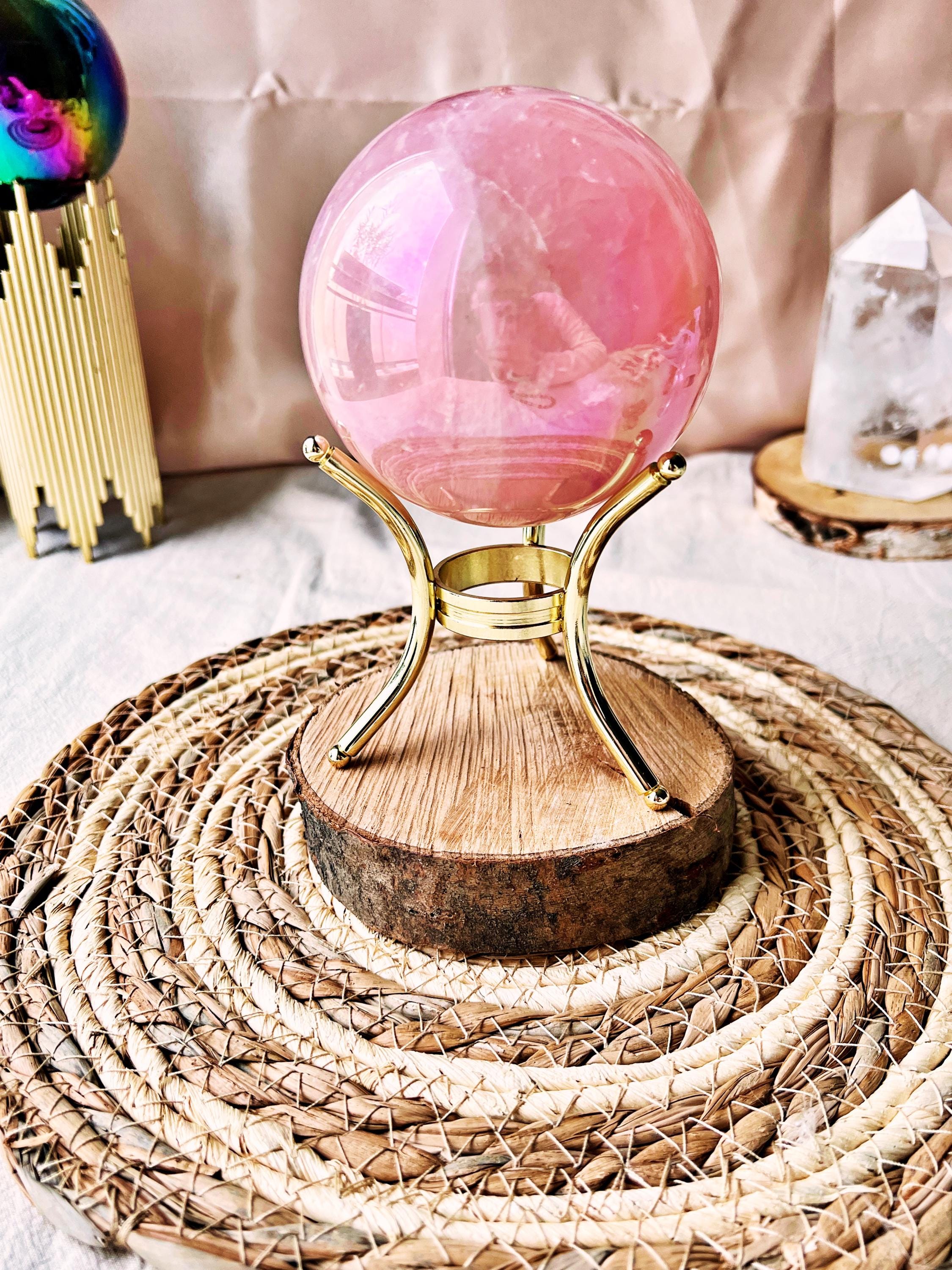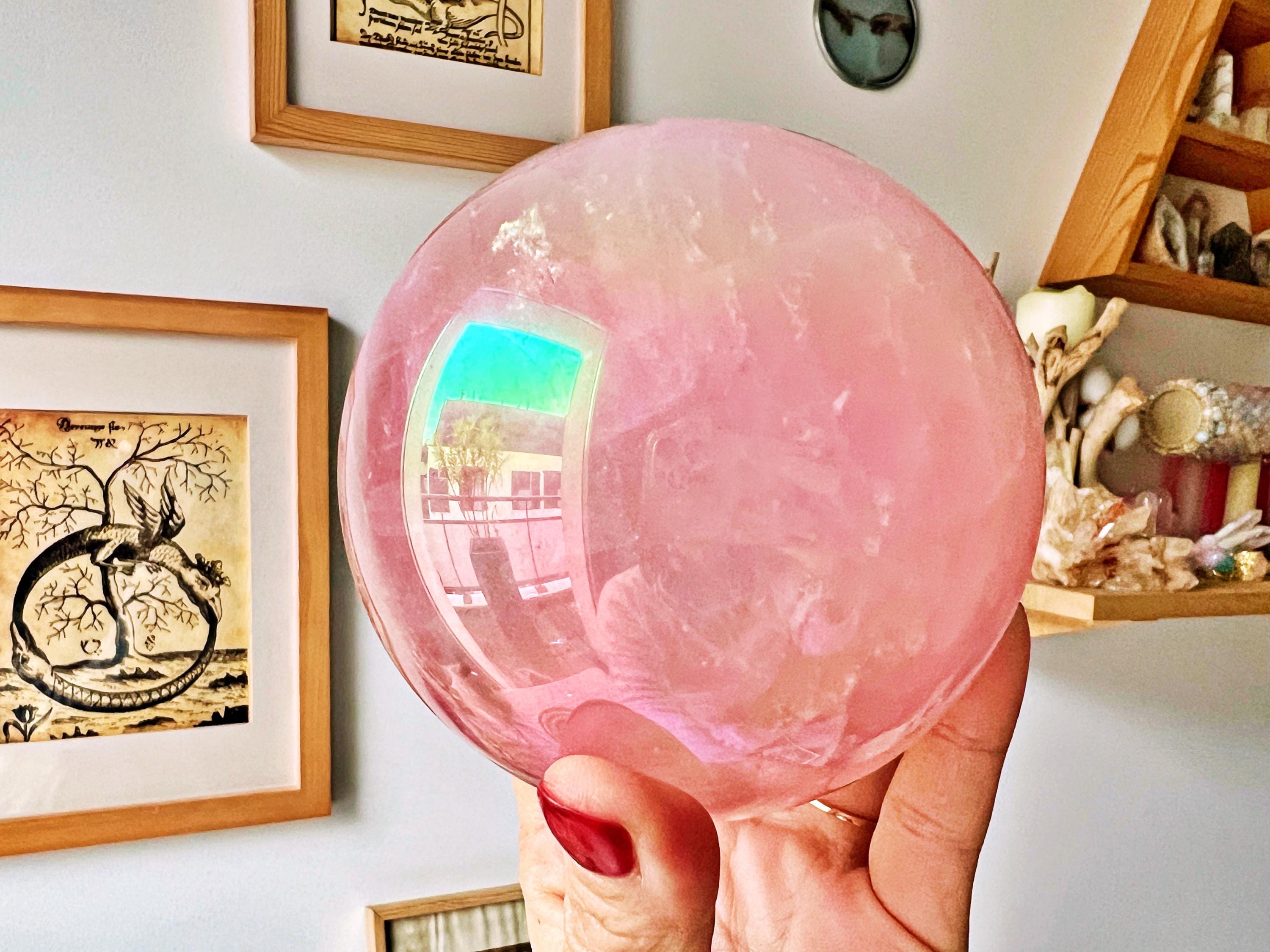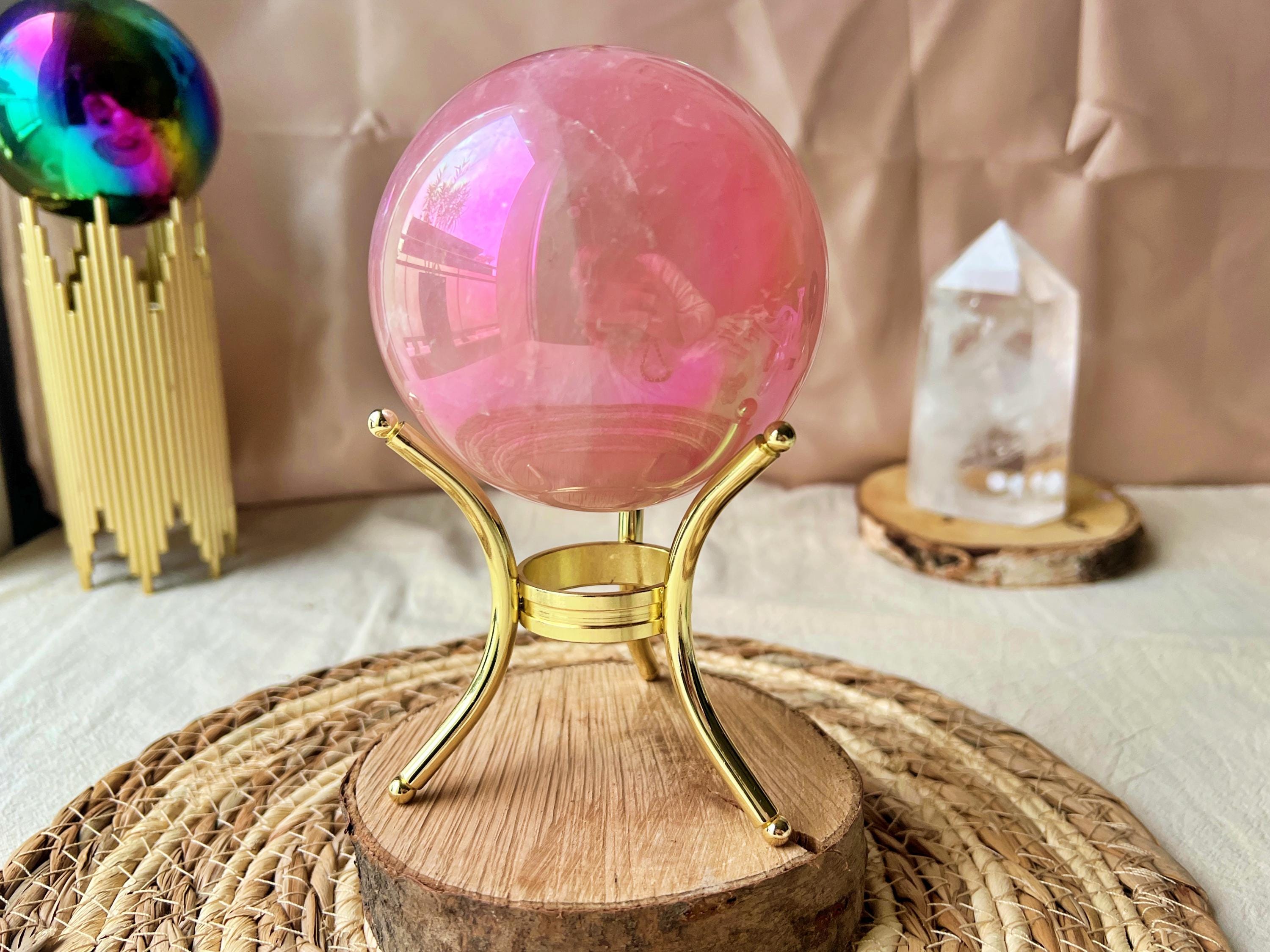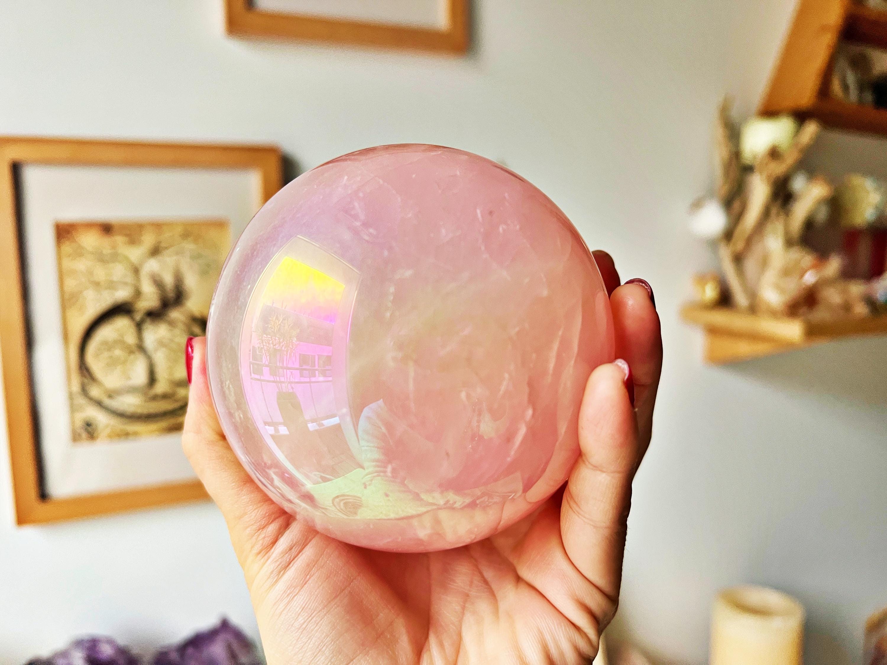 This 1.101 kg Rose Quartz sphere features an Aura finish, giving the surface subtle iridescent reflections with pink and opalescent undertones. The treatment highlights the natural translucency and internal textures of the quartz while preserving the stone’s original structure and volume.