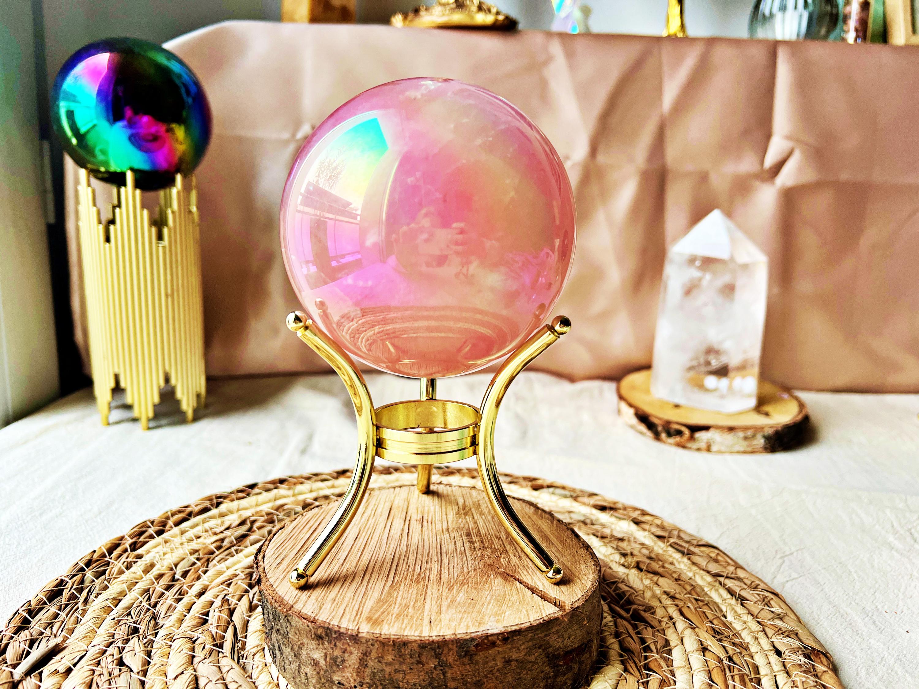 The sphere is displayed on a gold-tone brass tripod stand, providing stable support and enhancing the visual impact of the piece. The combination of the iridescent surface and the warm metallic stand creates a luminous, decorative object suitable for shelves, desks, or curated interior displays.