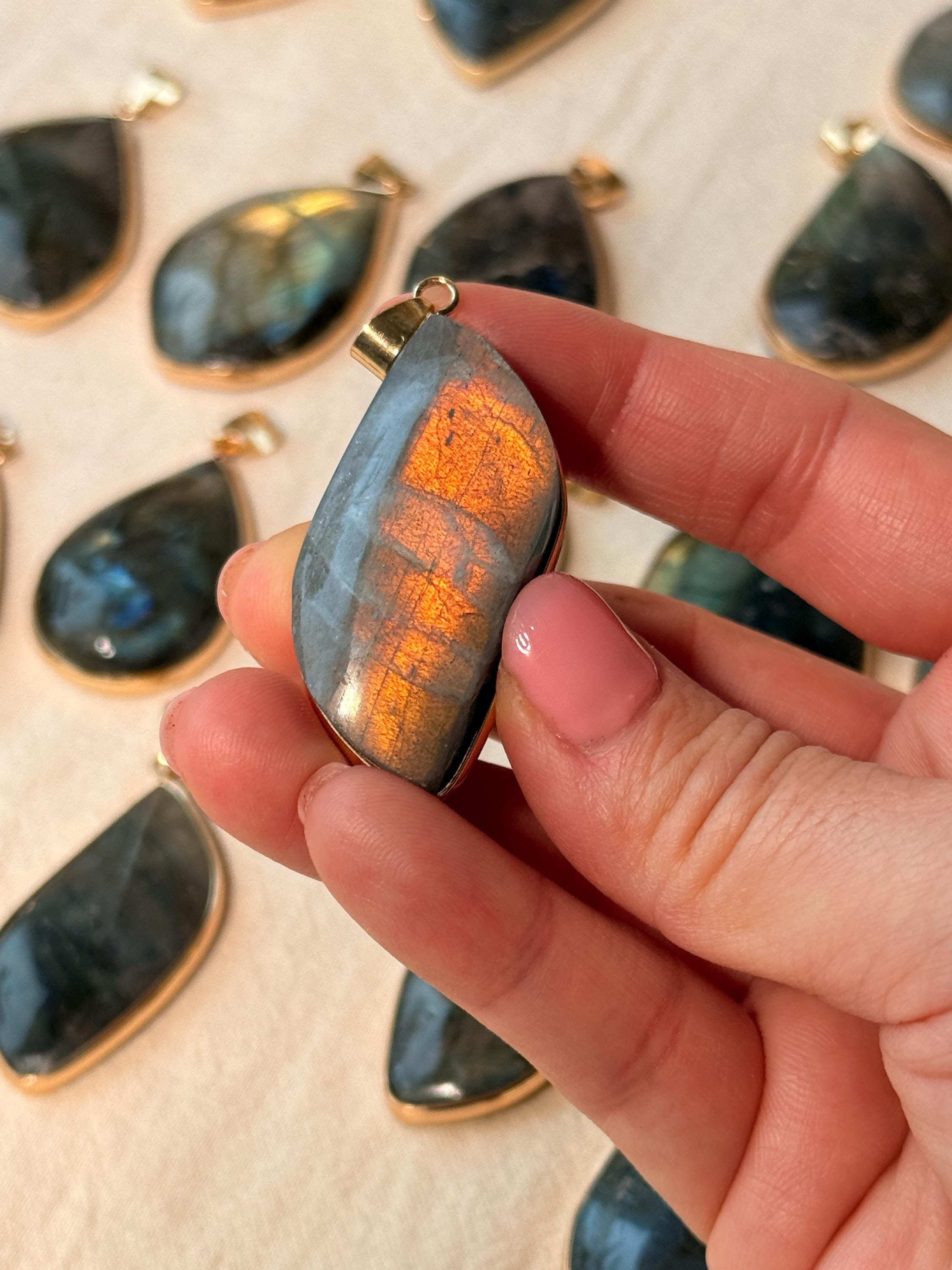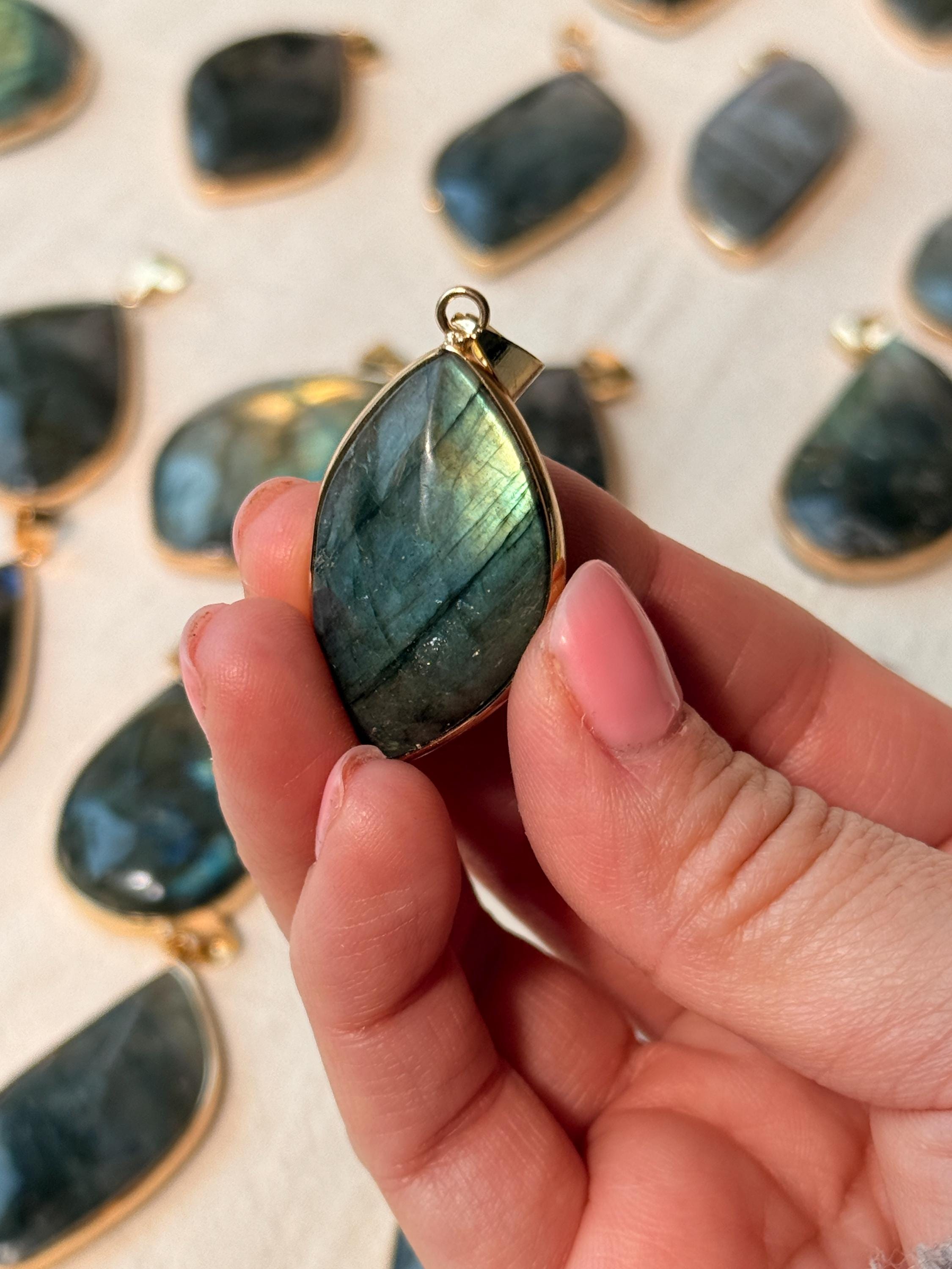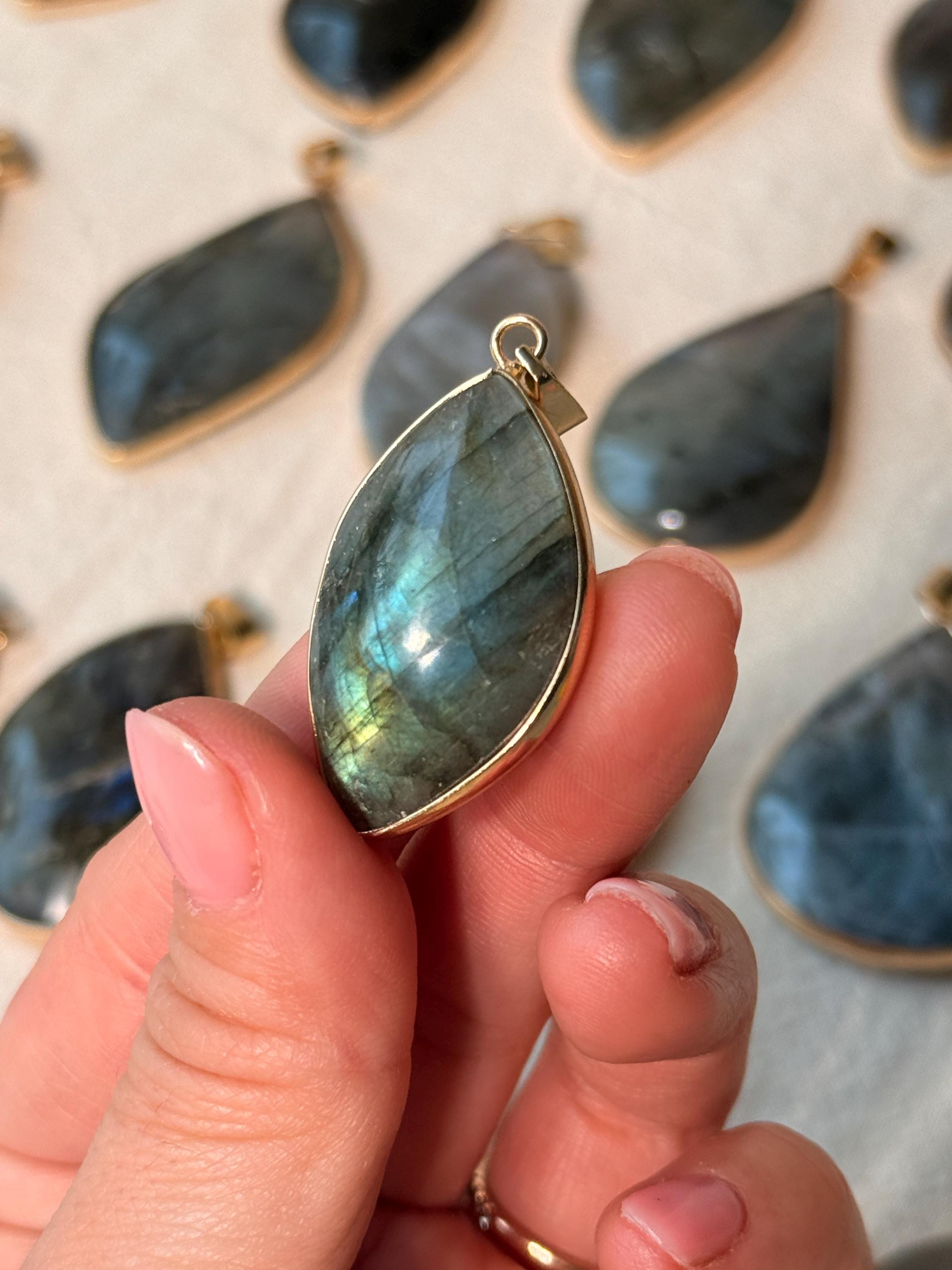Shapes may vary (oval, teardrop, rectangular), as well as size and thickness, since every pendant is individually crafted.