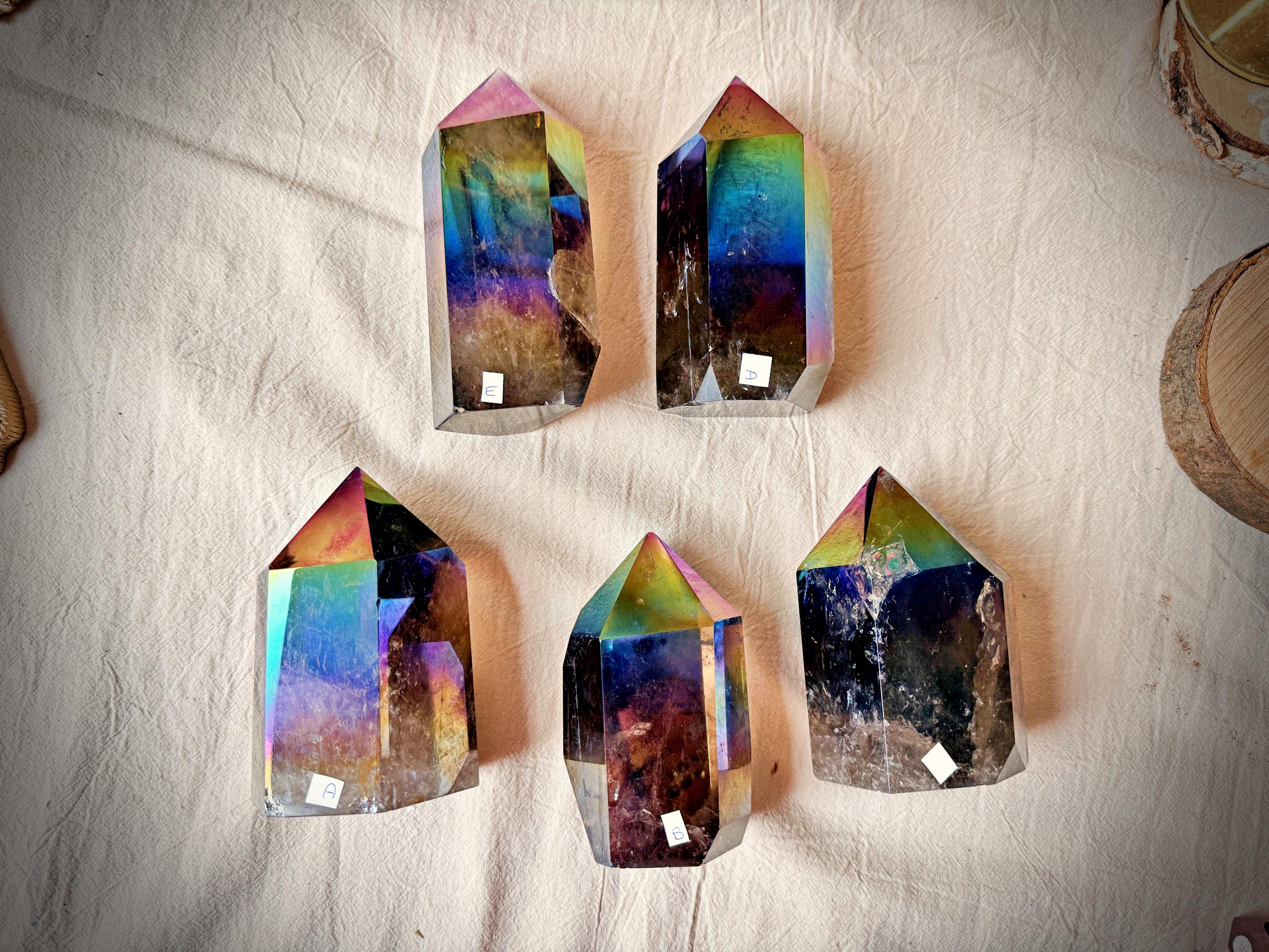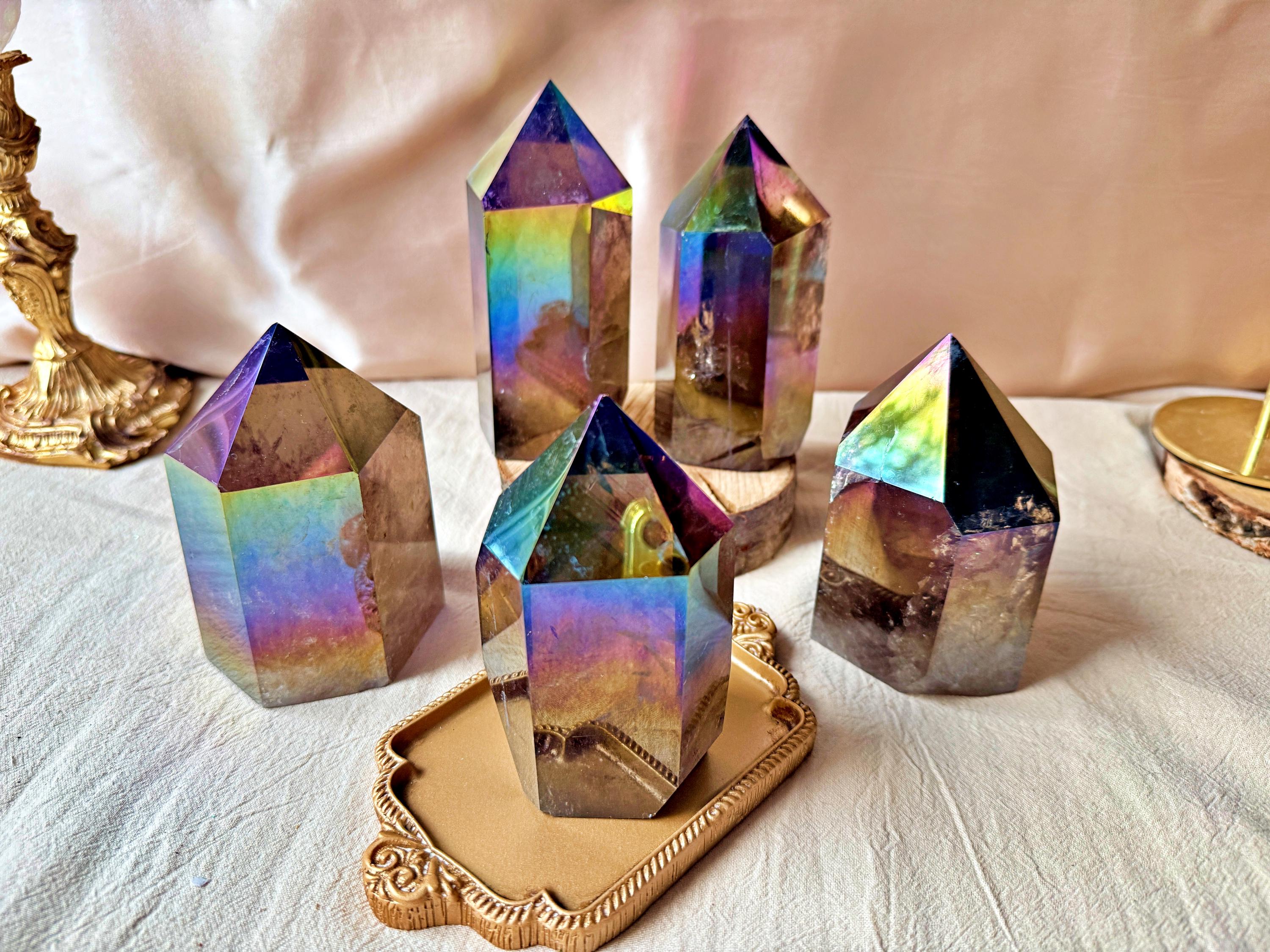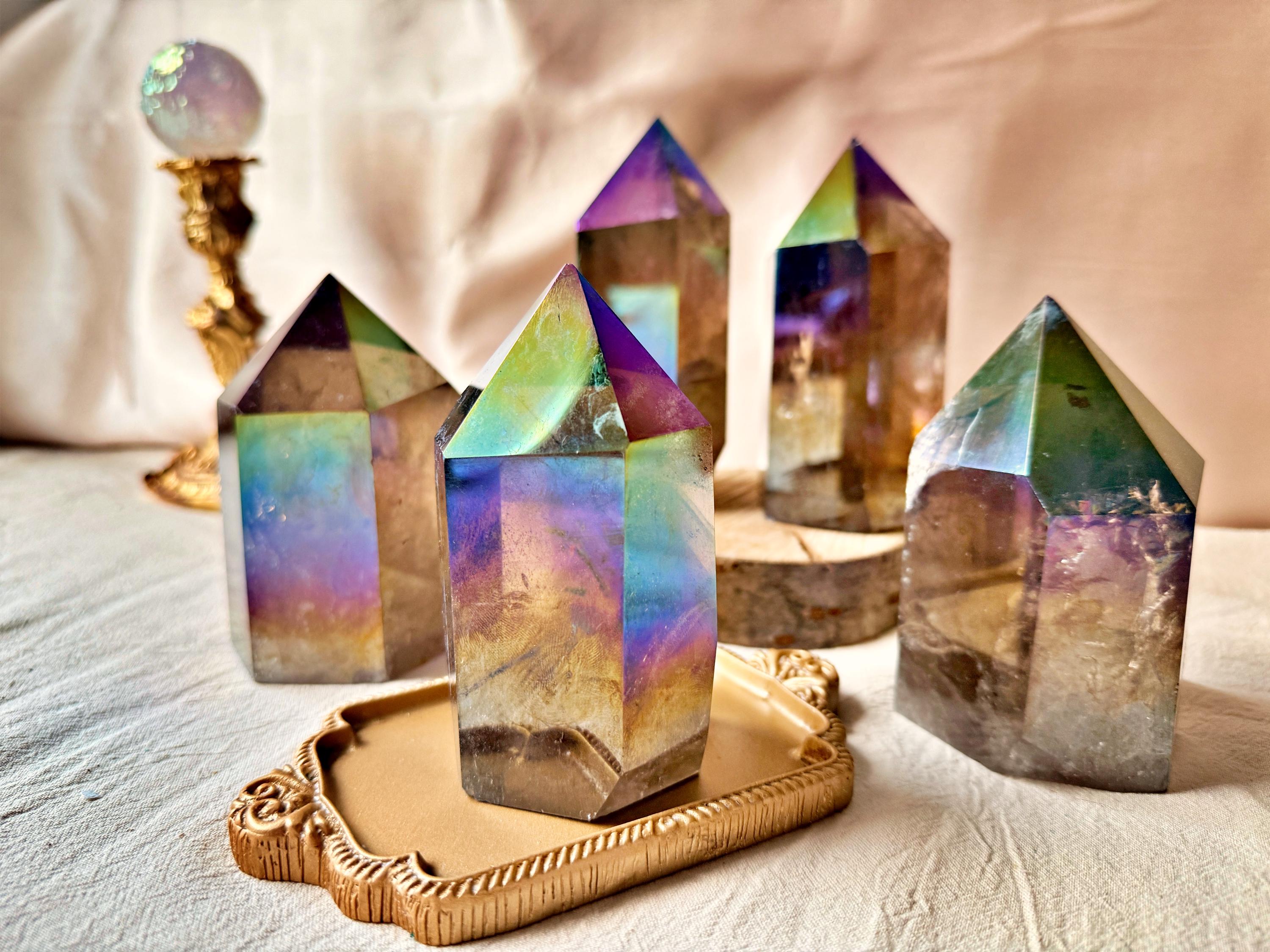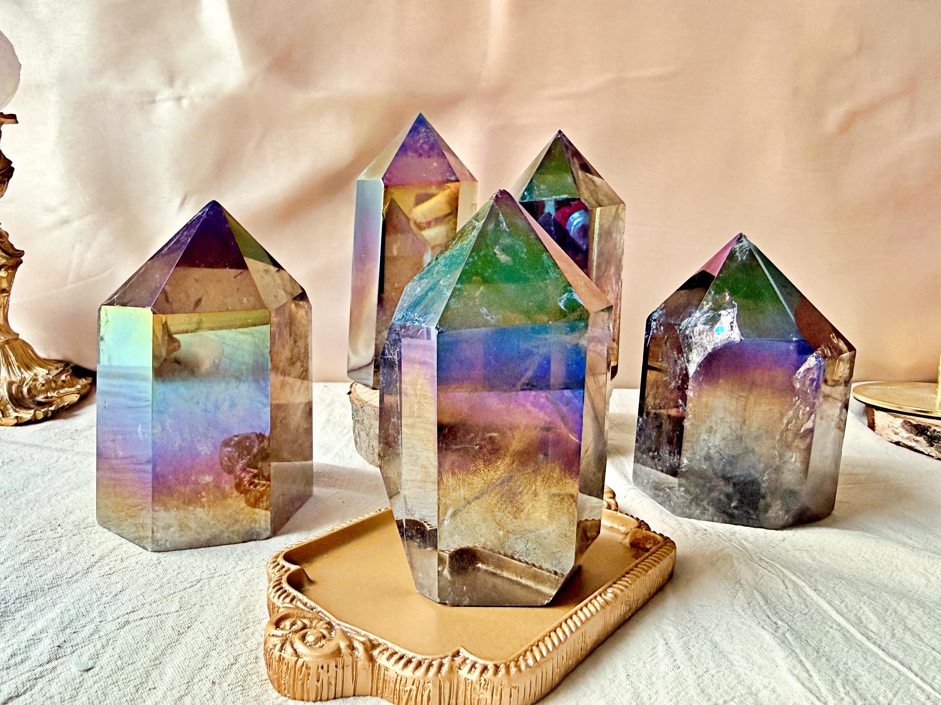 Each piece displays natural smoky quartz tones combined with permanent iridescent reflections, ranging from violet and blue to rainbow hues. The Aura treatment highlights the geometry of the crystal without concealing its internal structure, inclusions or natural layers.