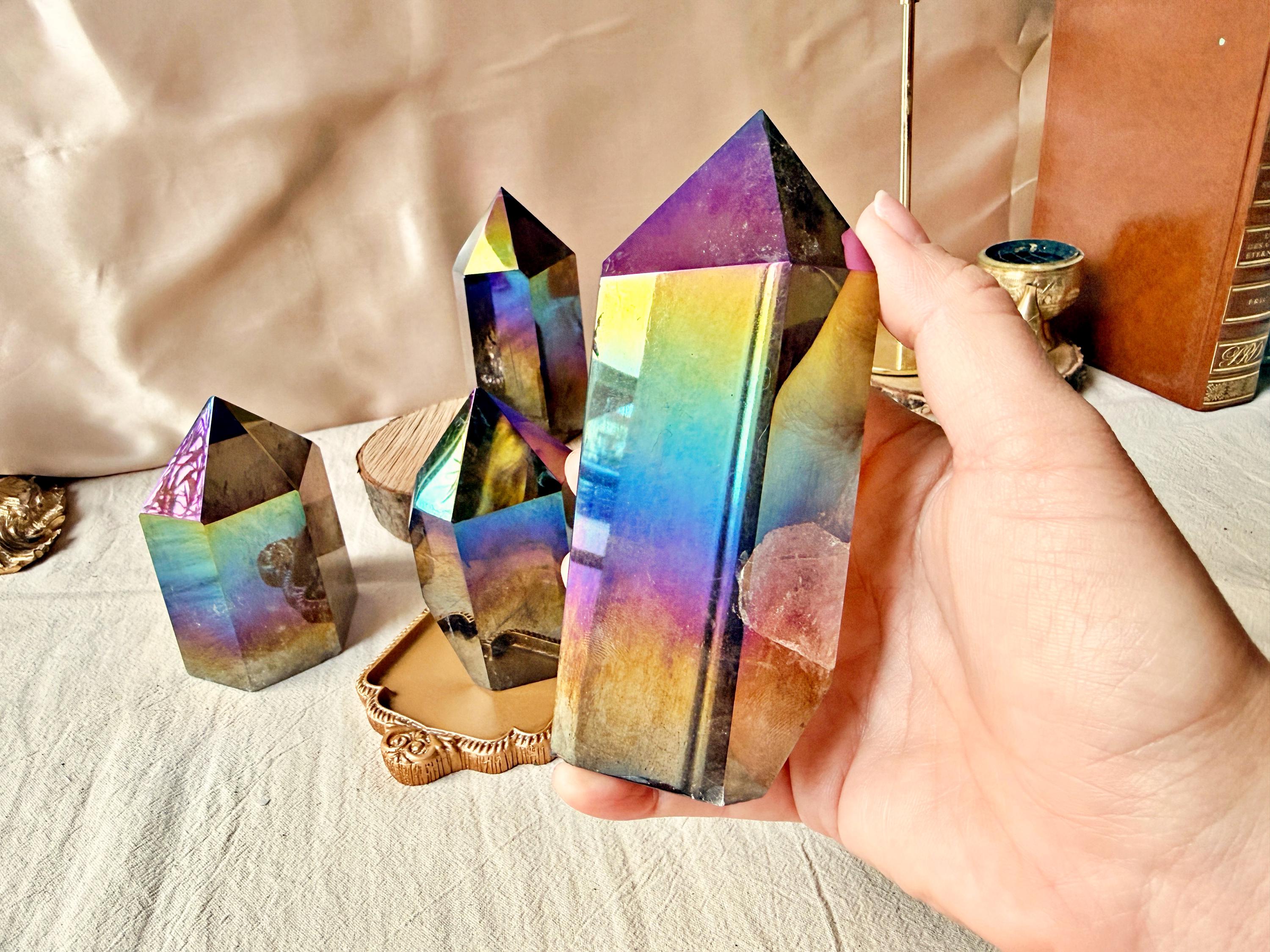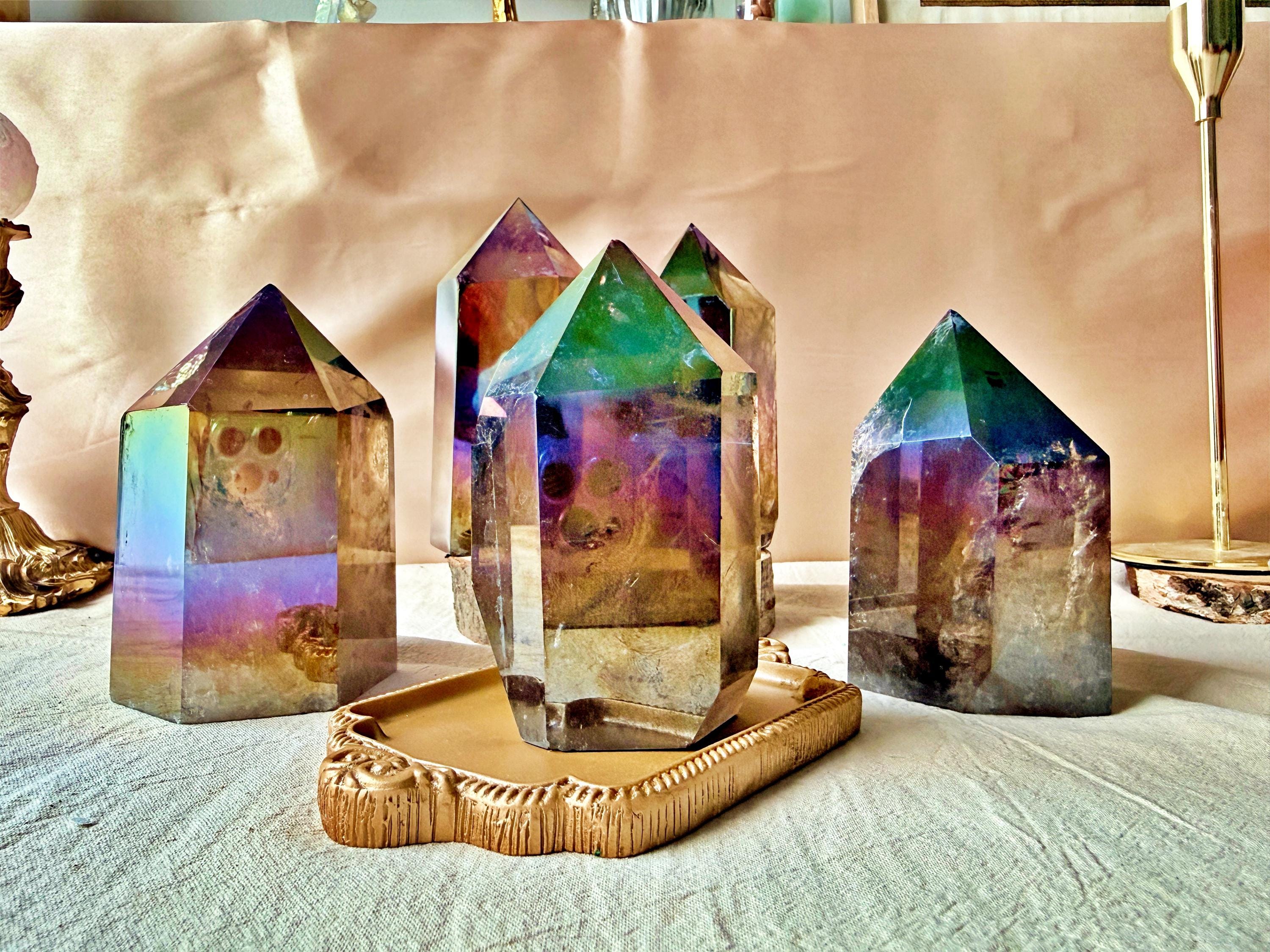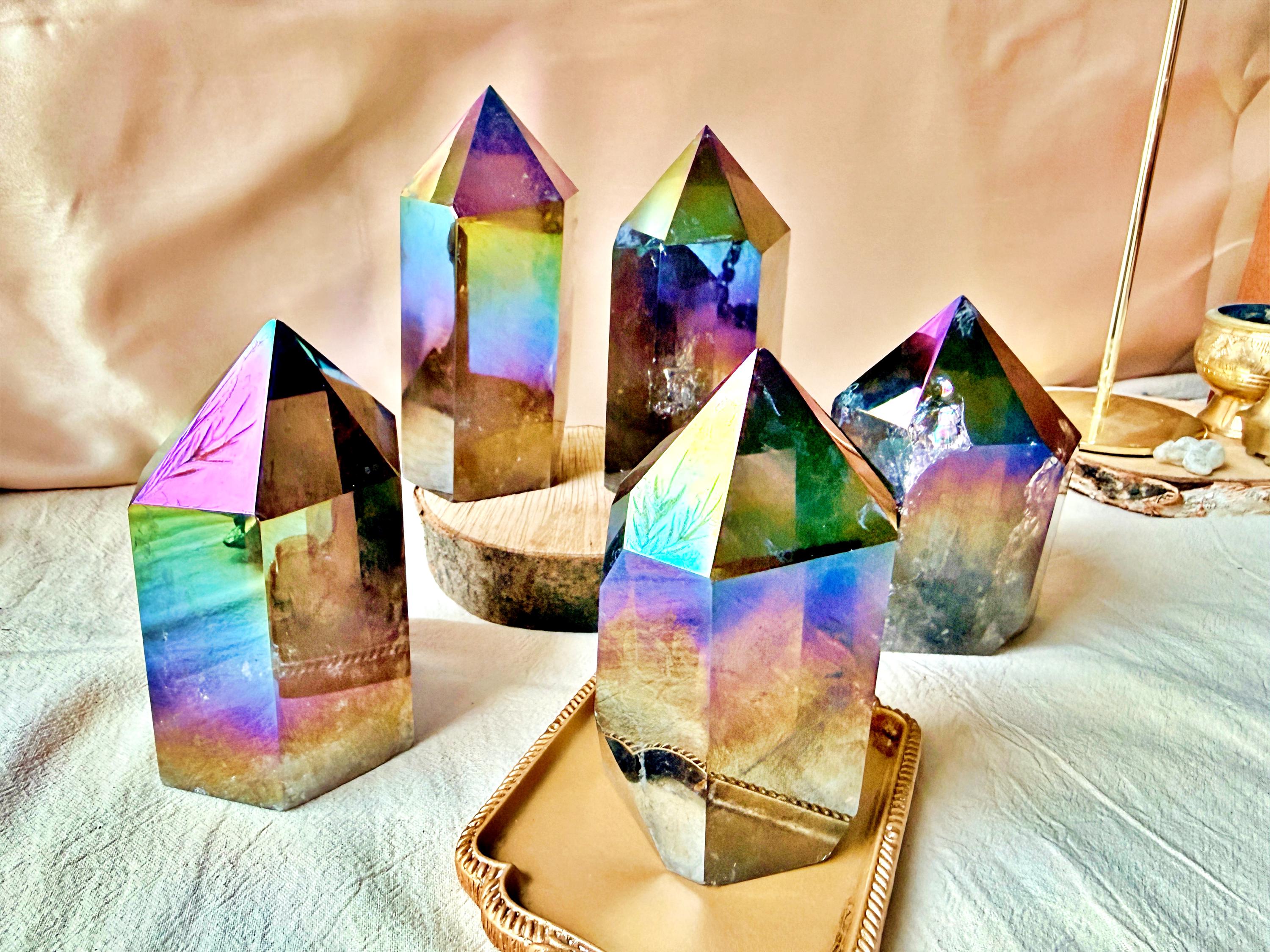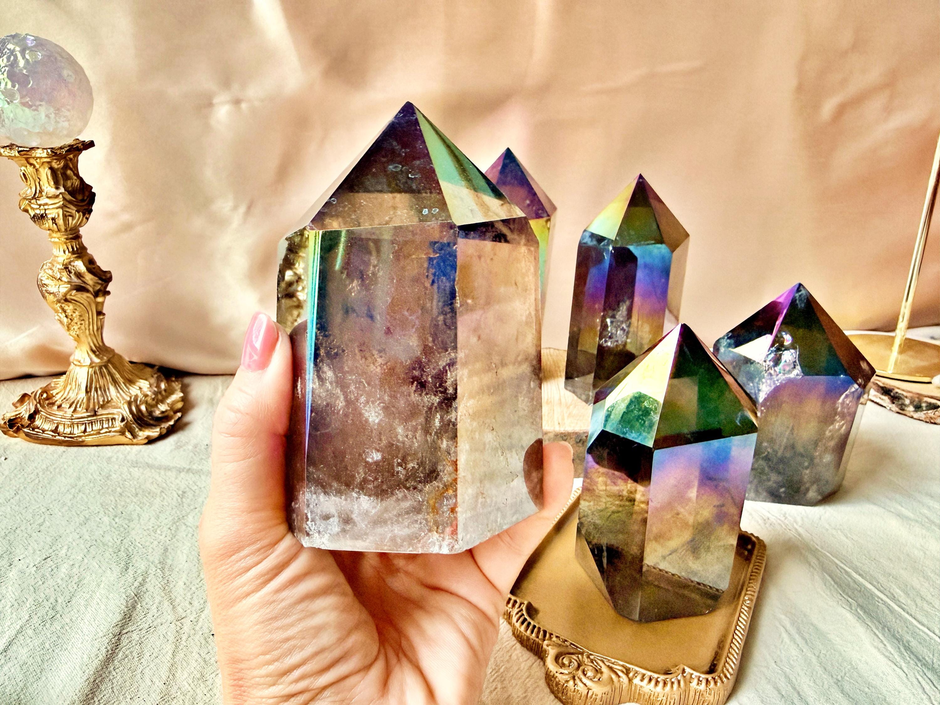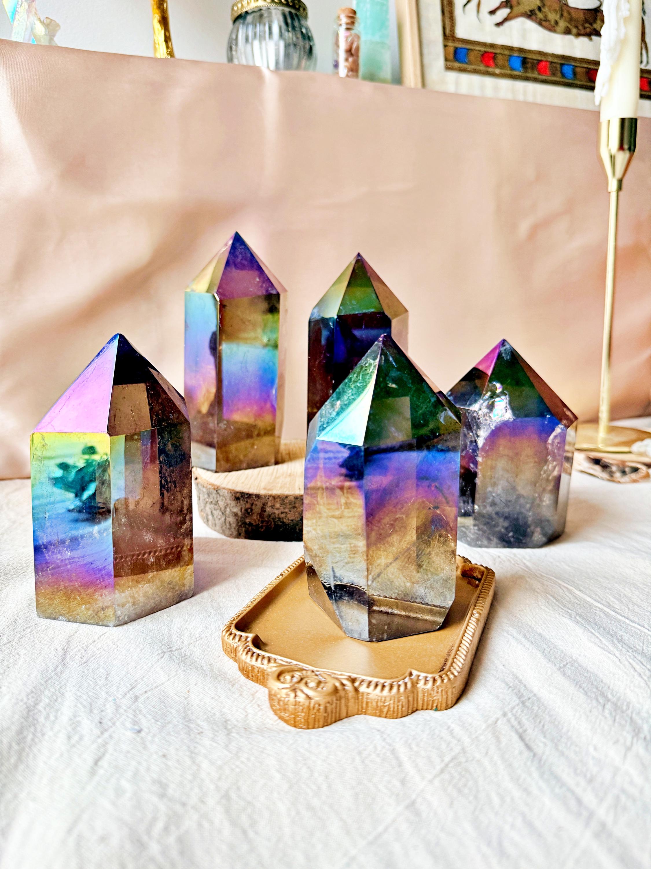 Each piece displays natural smoky quartz tones combined with permanent iridescent reflections, ranging from violet and blue to rainbow hues. The Aura treatment highlights the geometry of the crystal without concealing its internal structure, inclusions or natural layers.