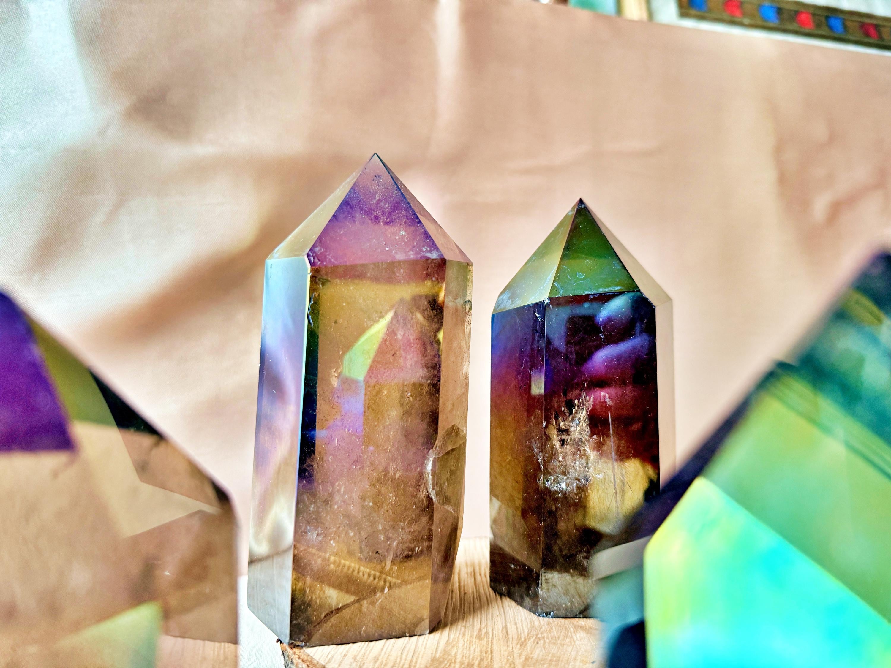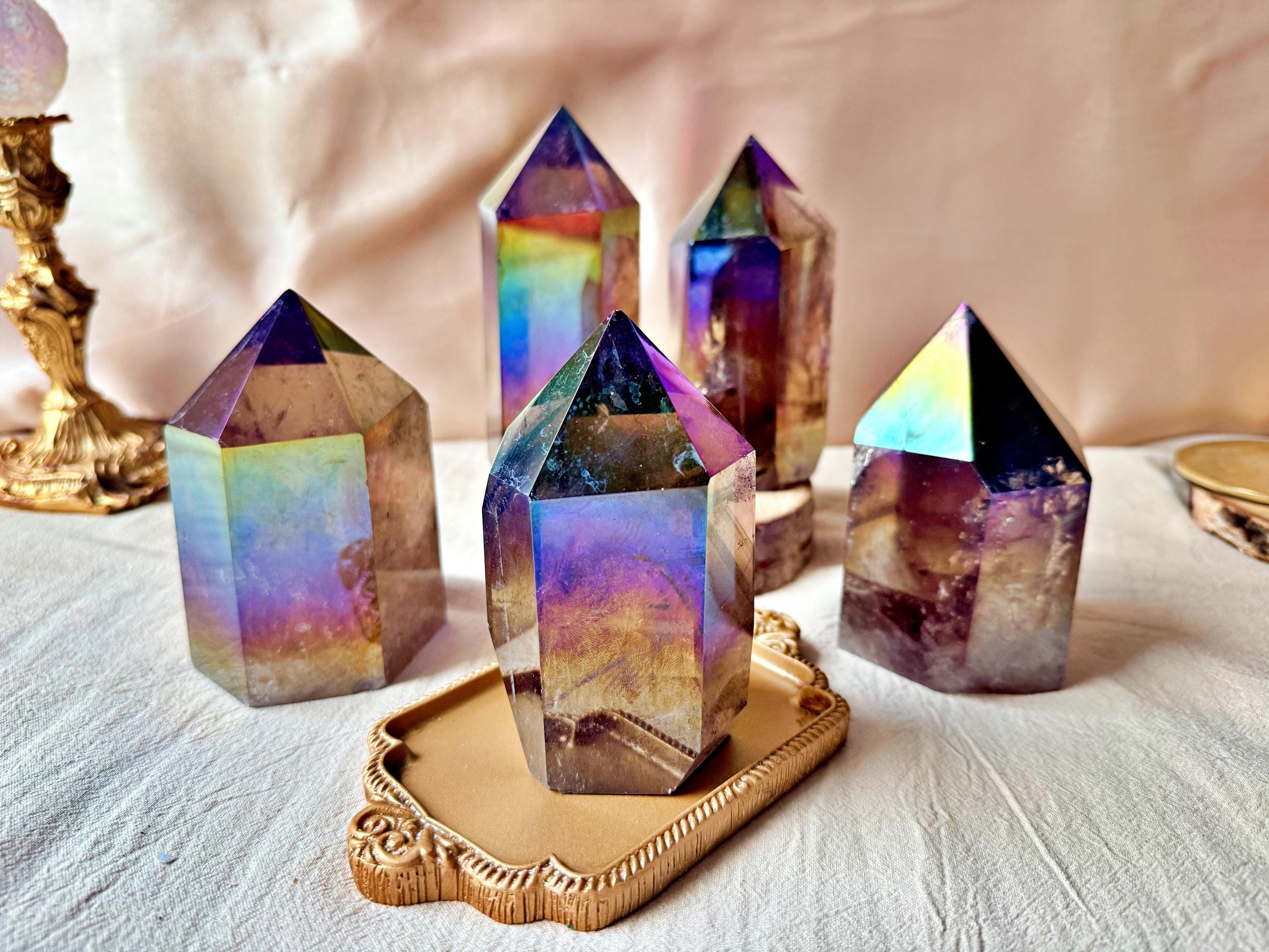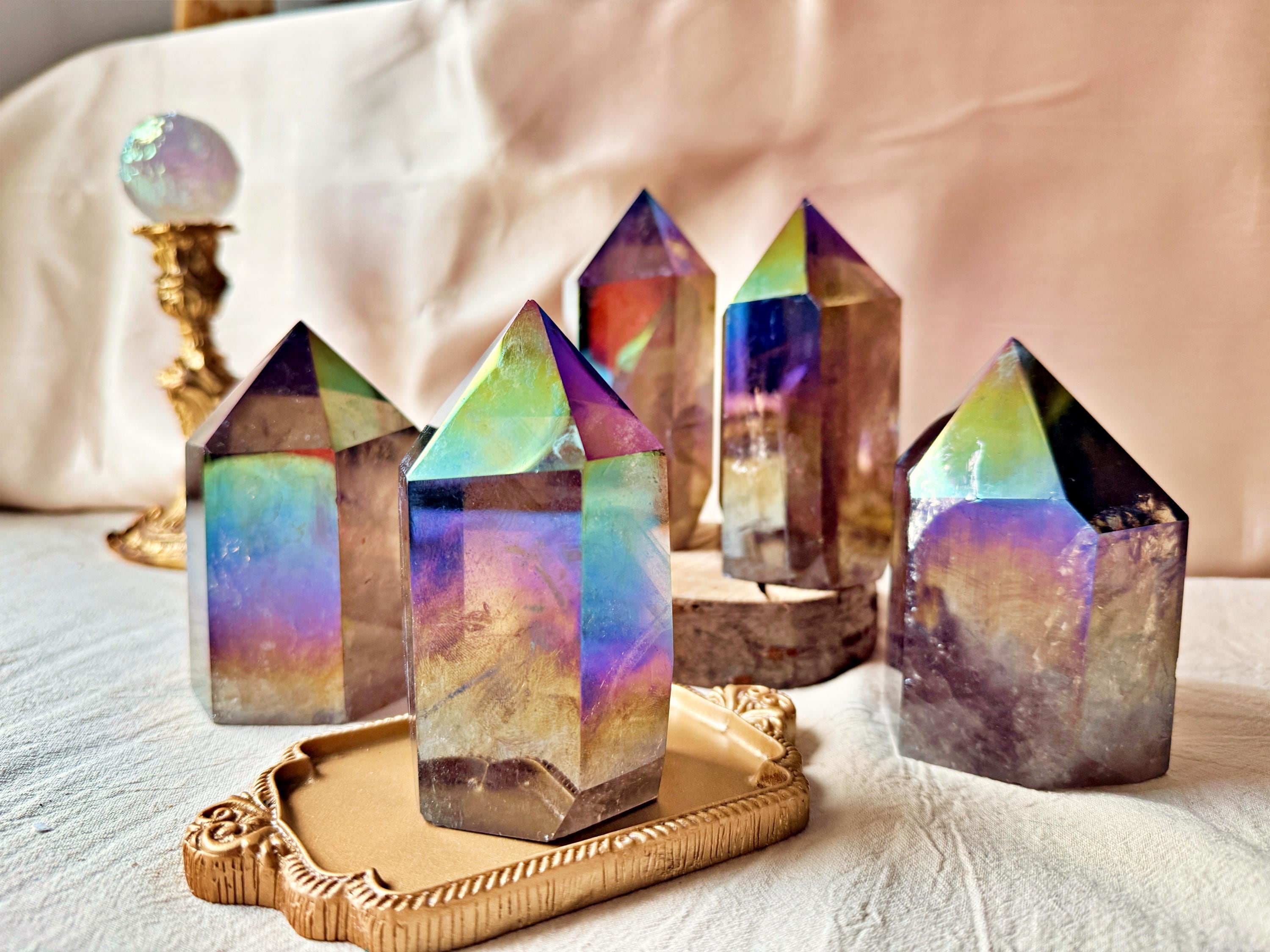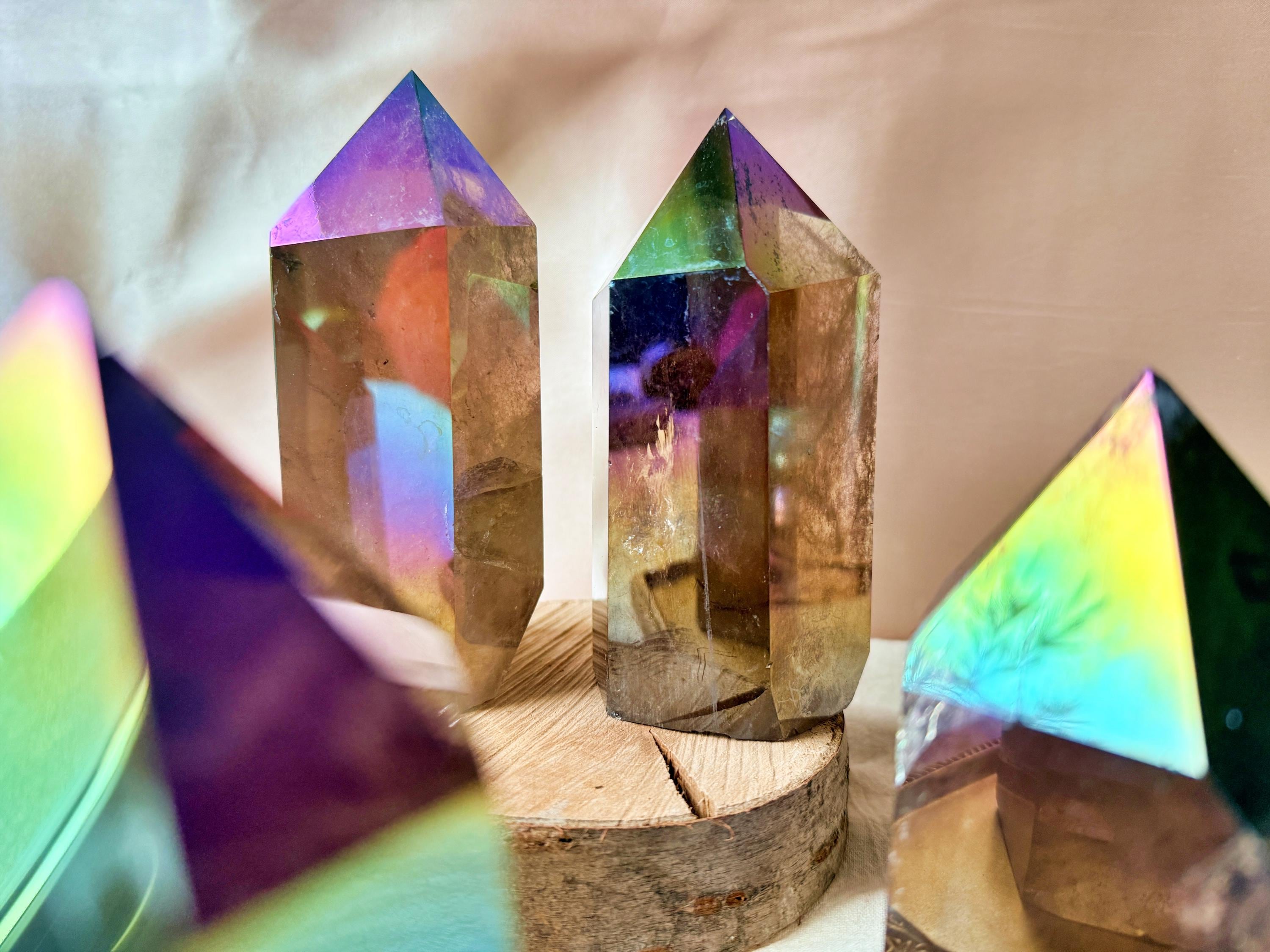 Each piece displays natural smoky quartz tones combined with permanent iridescent reflections, ranging from violet and blue to rainbow hues. The Aura treatment highlights the geometry of the crystal without concealing its internal structure, inclusions or natural layers.