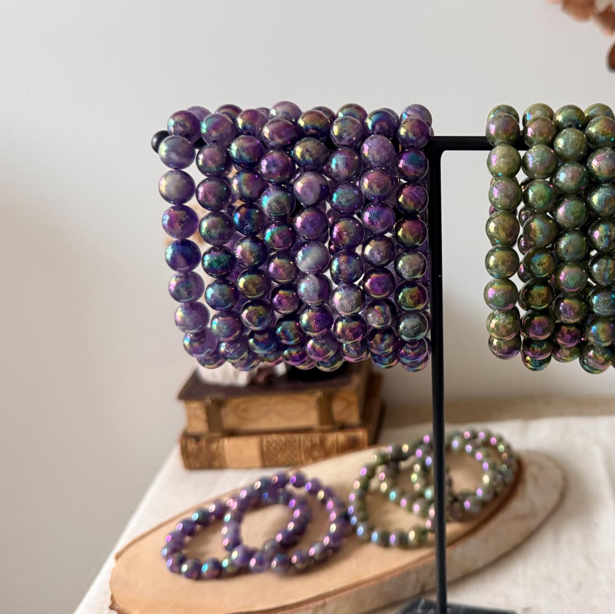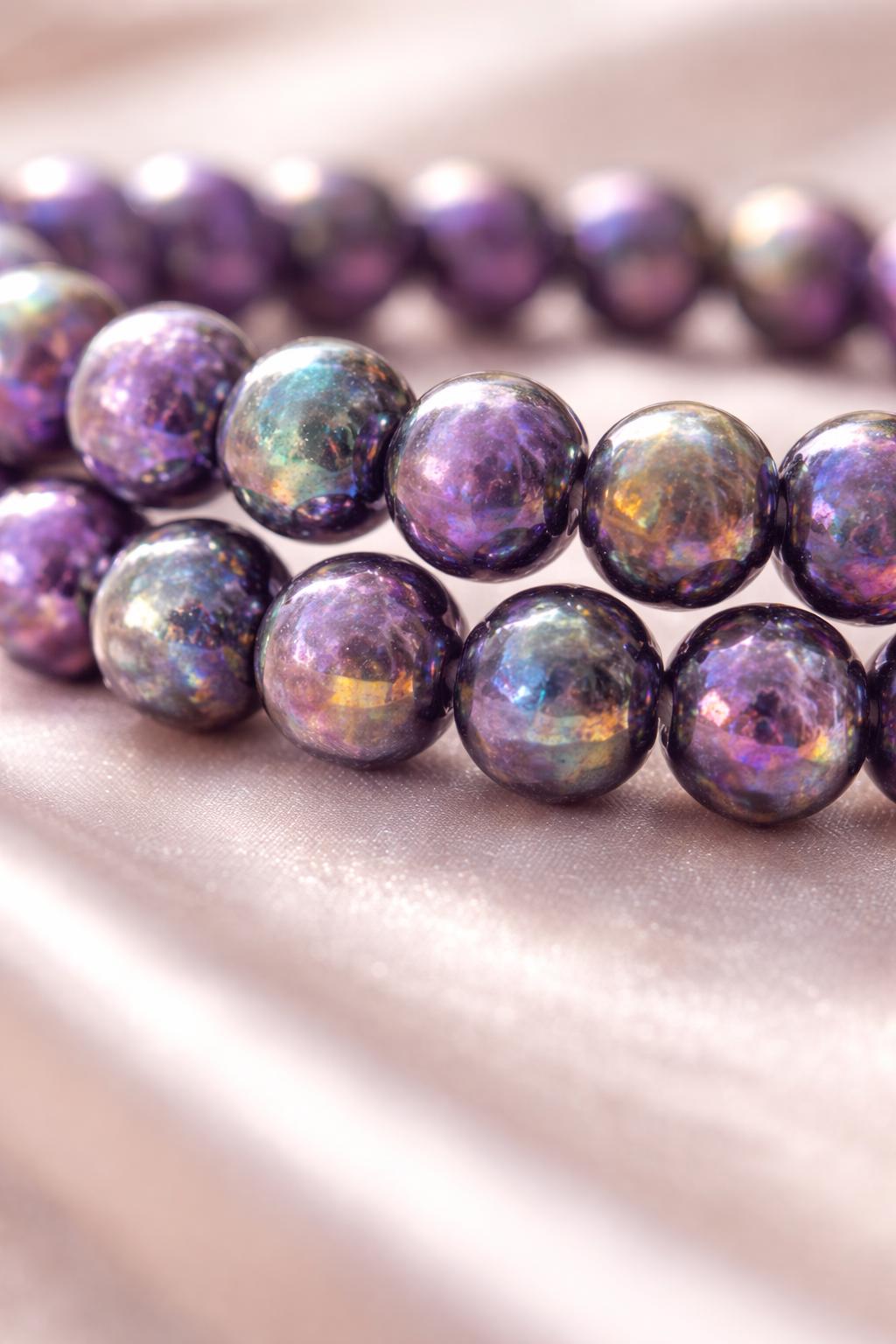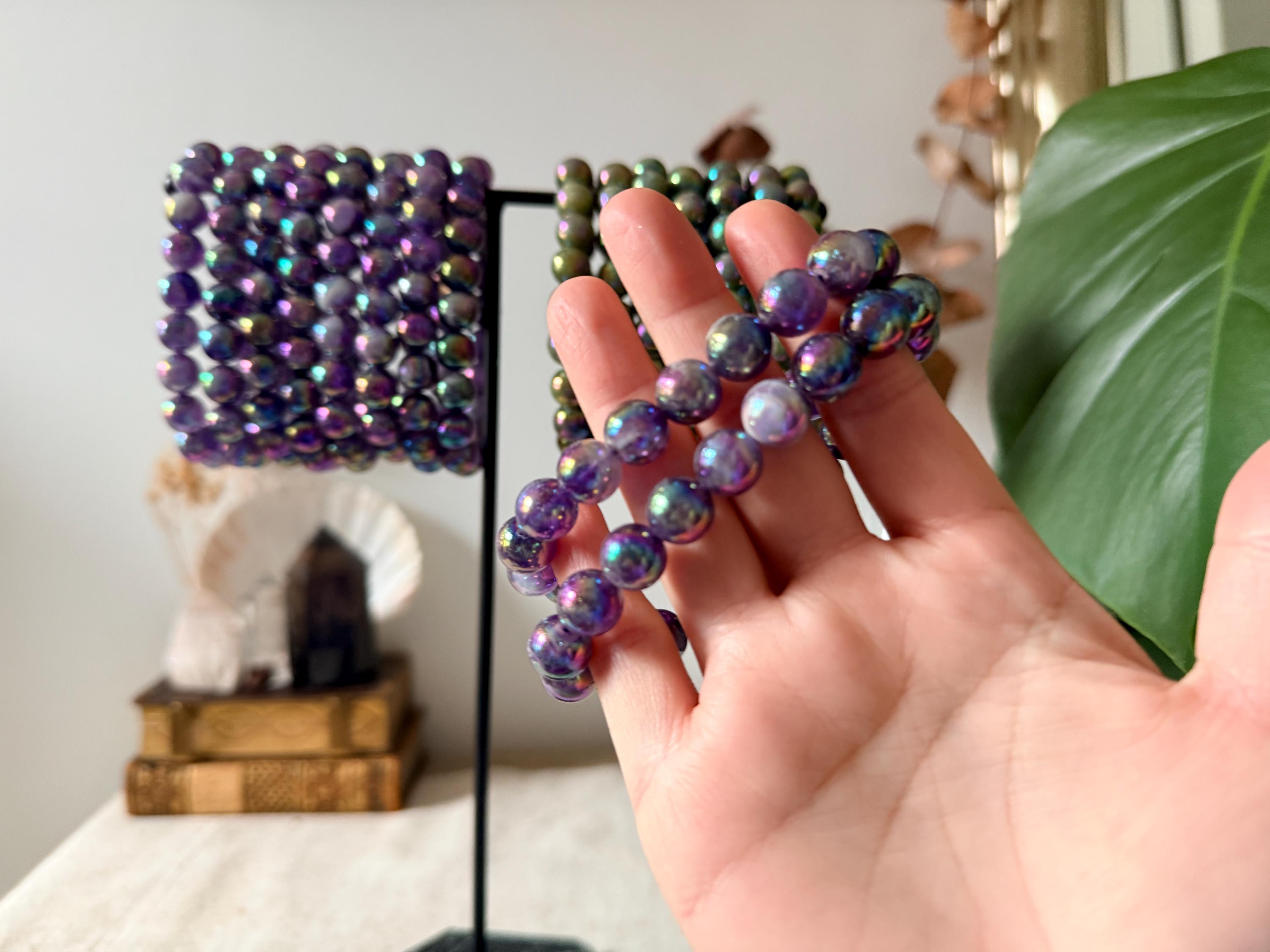 Bracelet made from natural chevron amethyst beads (10 mm), displaying characteristic purple and white banding, enhanced with a laboratory Aura surface treatment for permanent iridescent reflections.