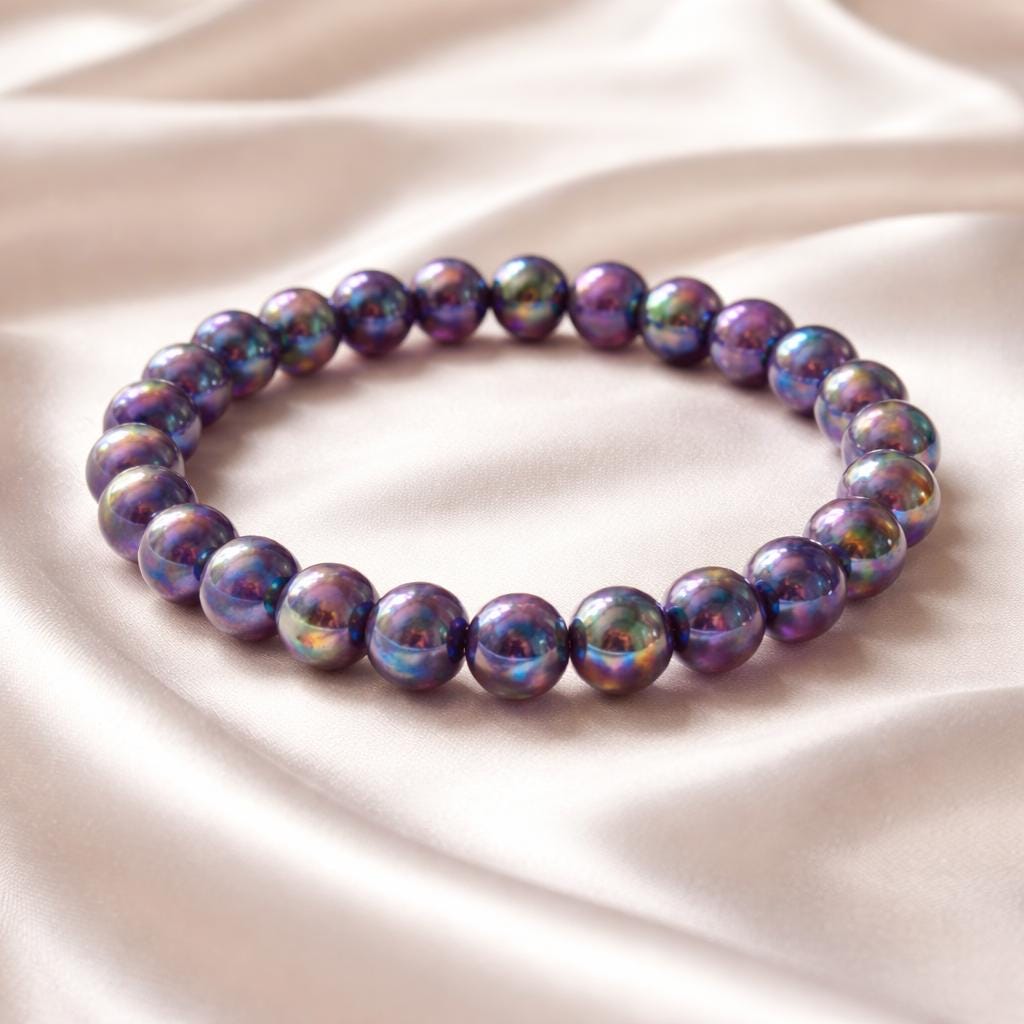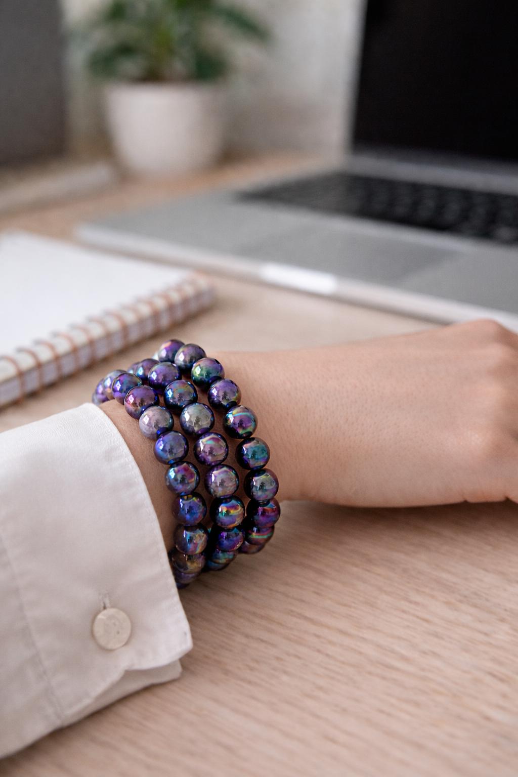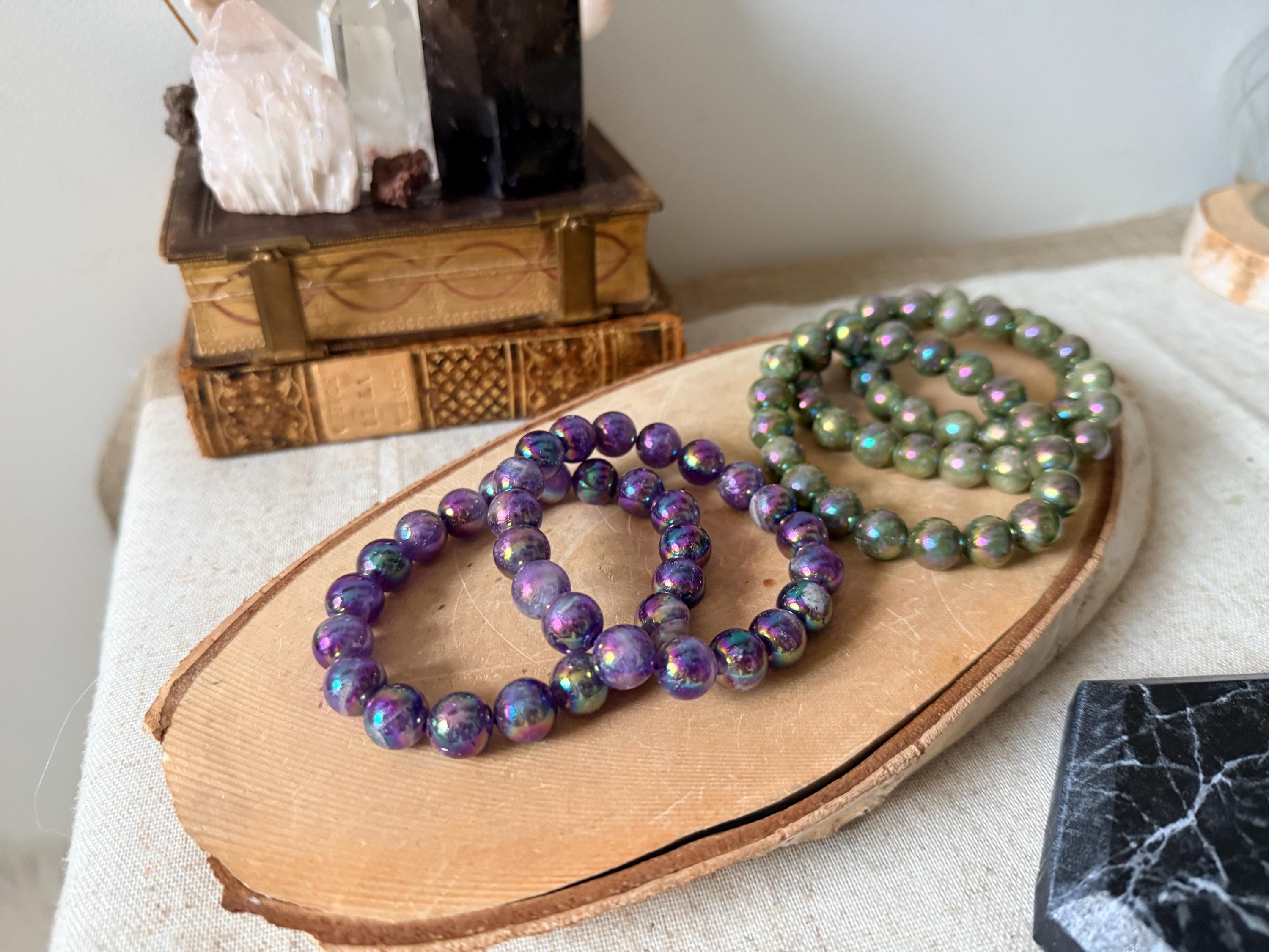Bracelet made from natural chevron amethyst beads (10 mm), displaying characteristic purple and white banding, enhanced with a laboratory Aura surface treatment for permanent iridescent reflections.
