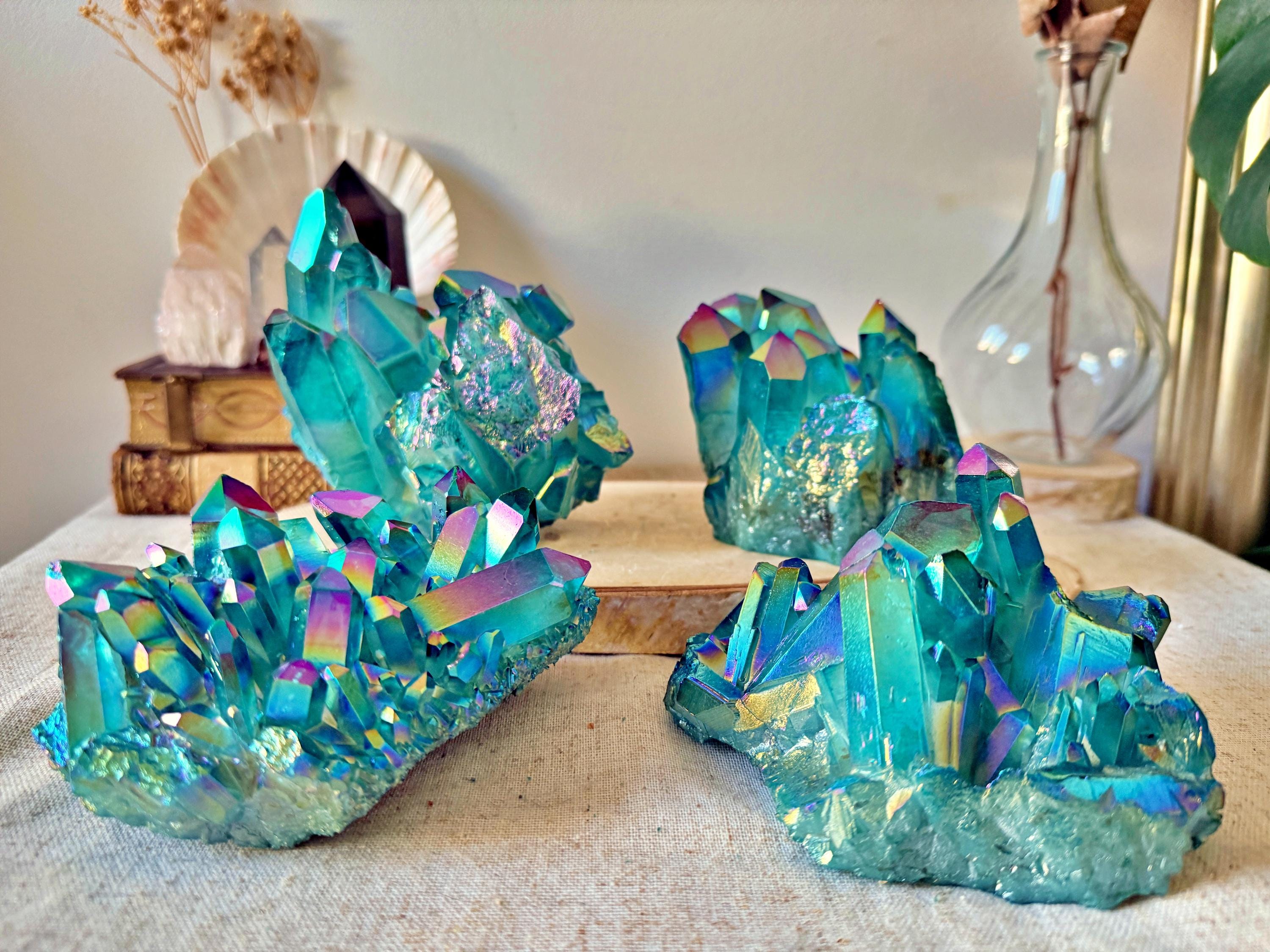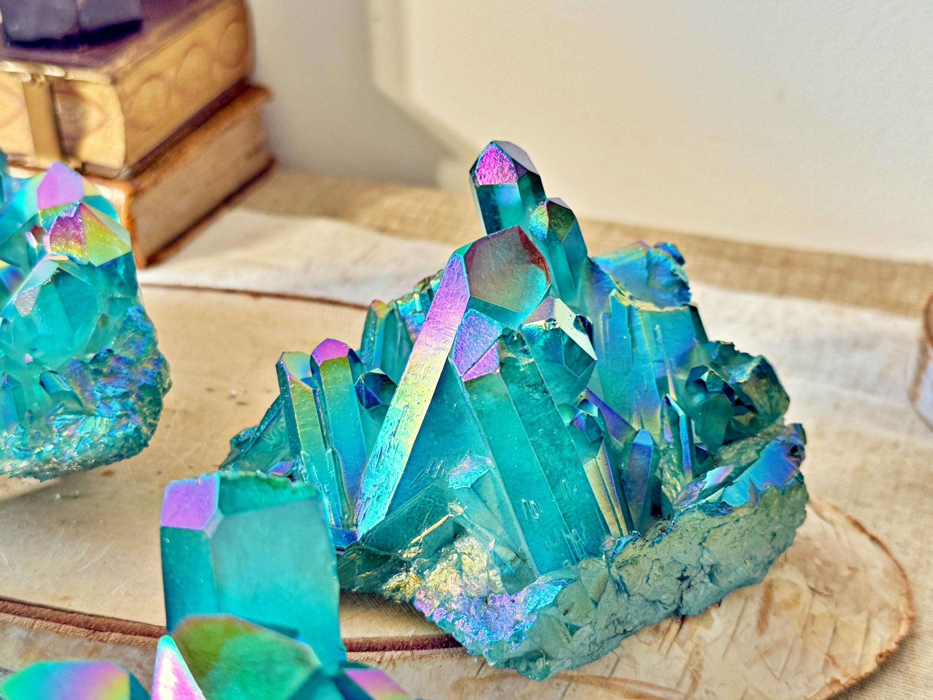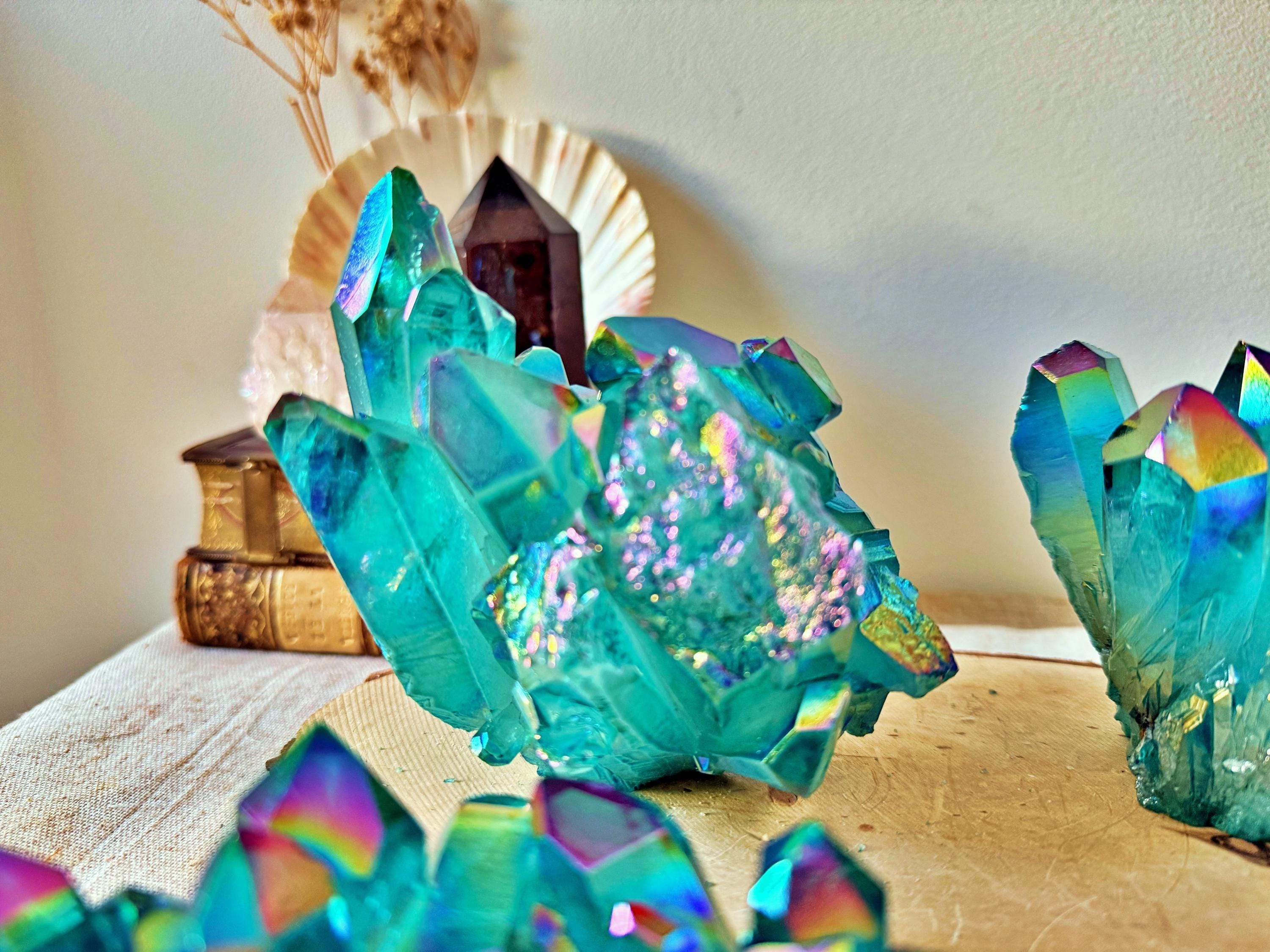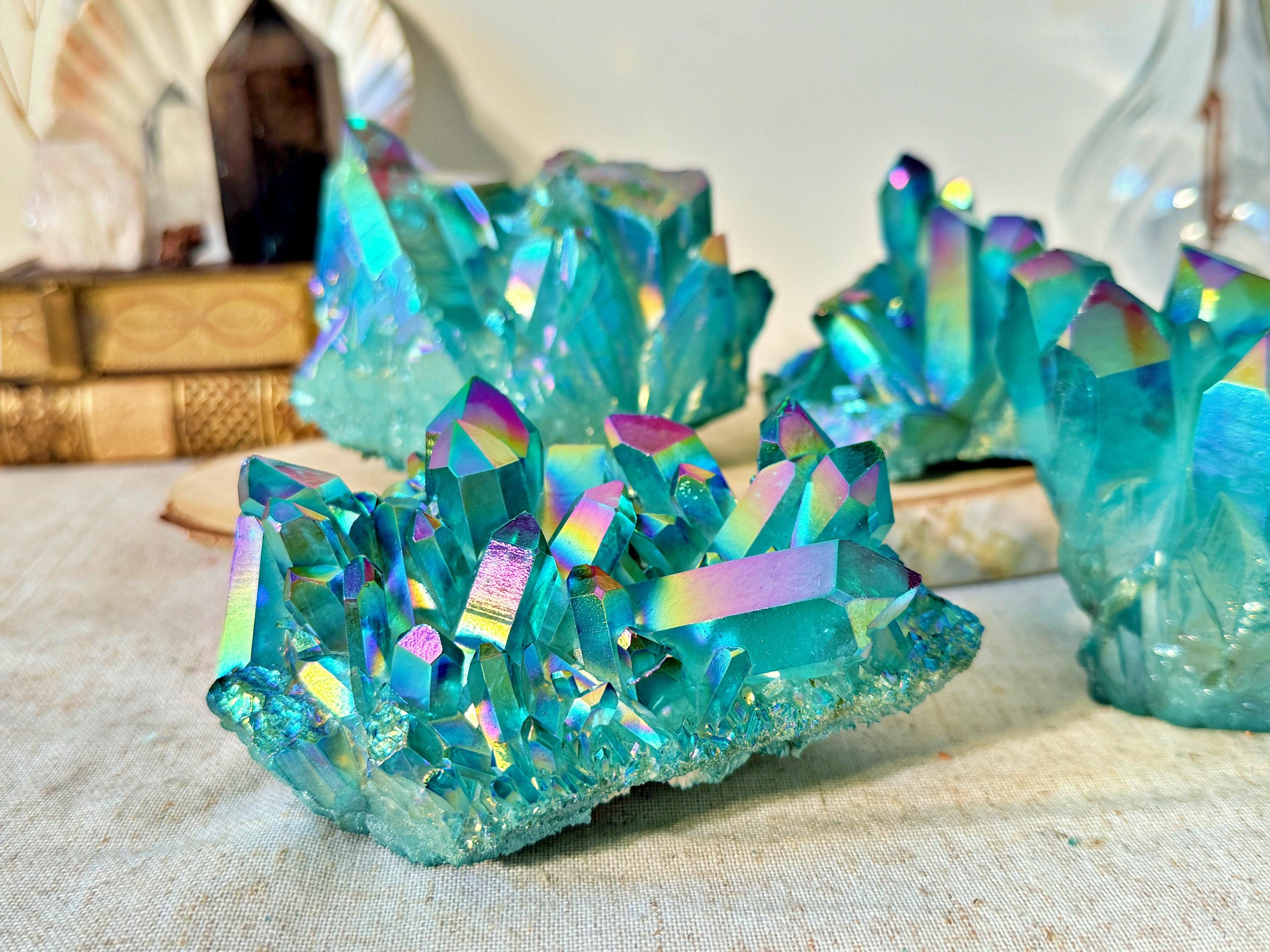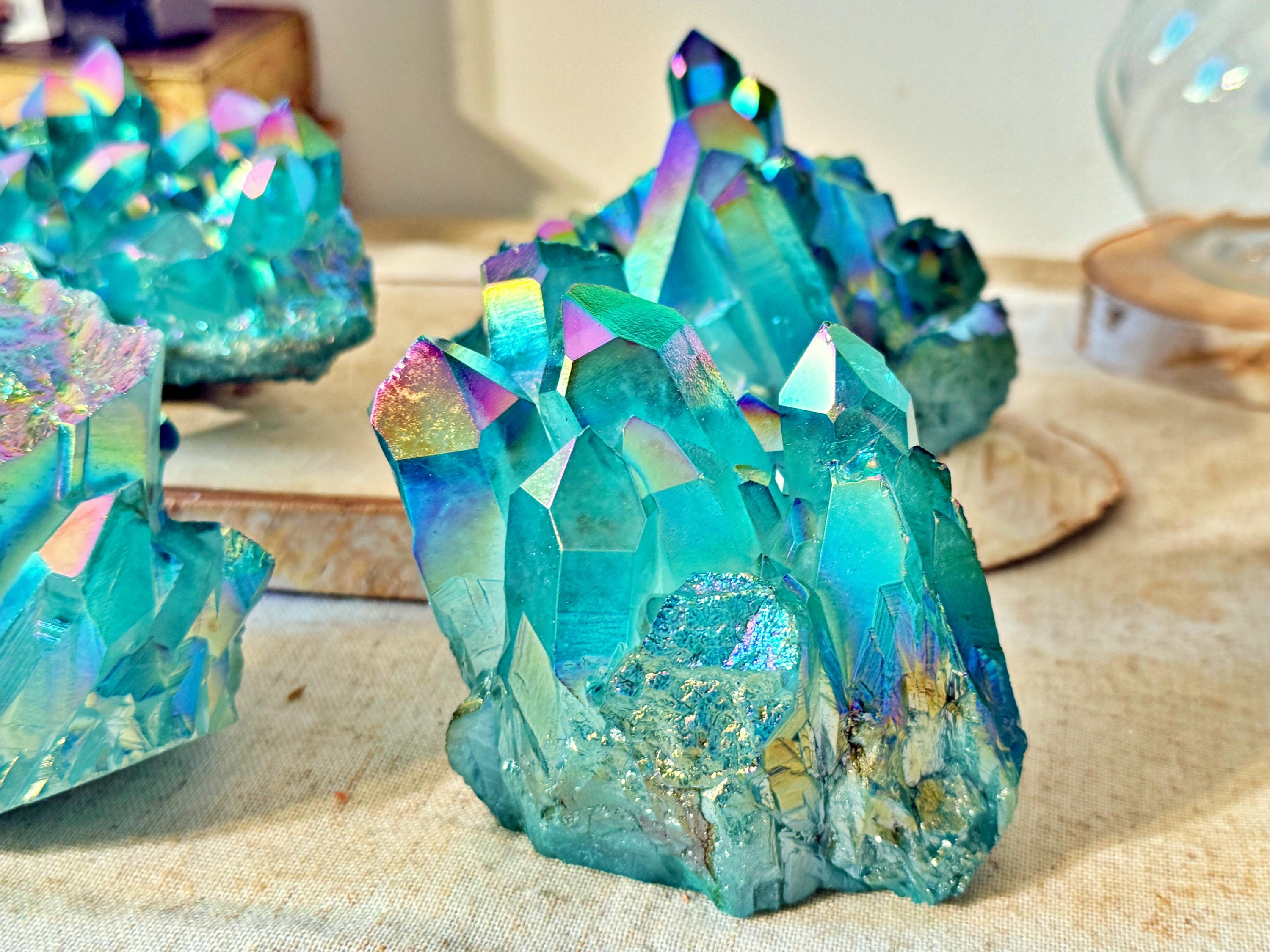 XXL natural quartz clusters, enhanced with a laboratory Aqua Aura surface treatment, creating intense turquoise-blue and iridescent reflections across the crystal points.