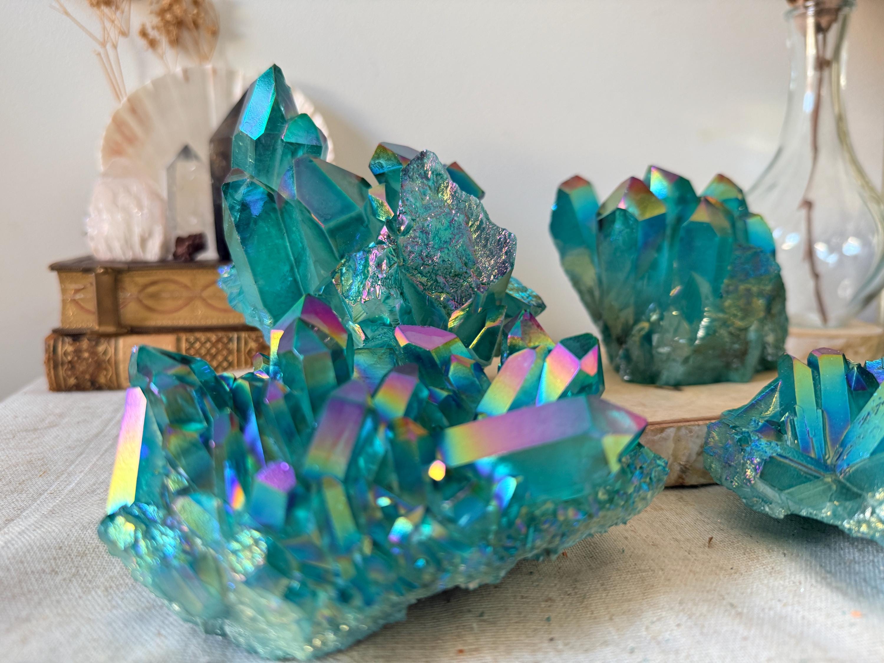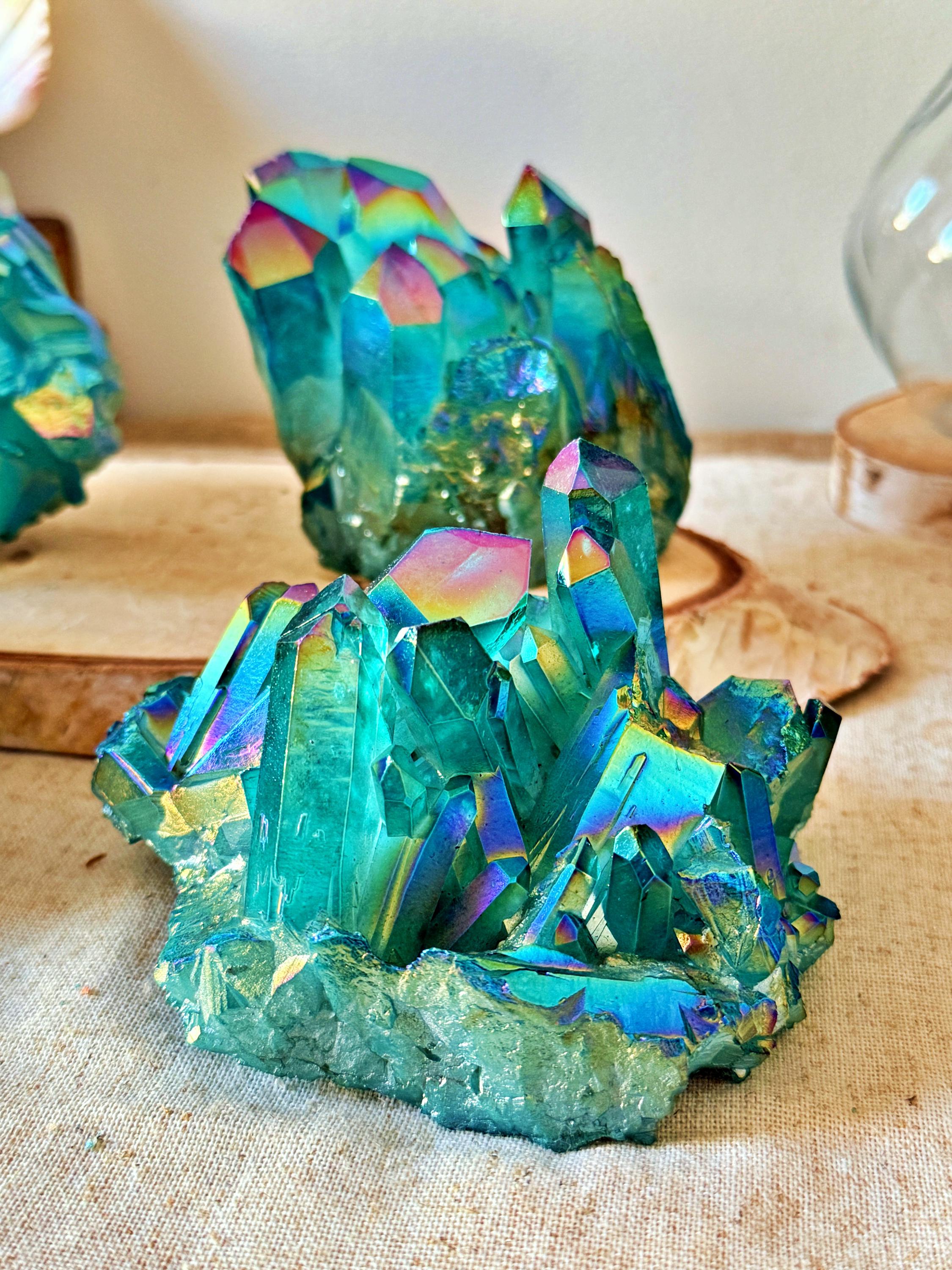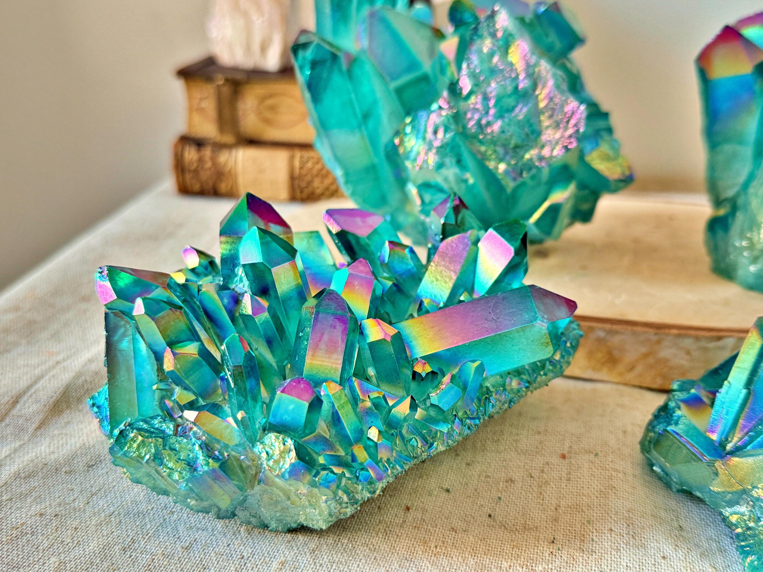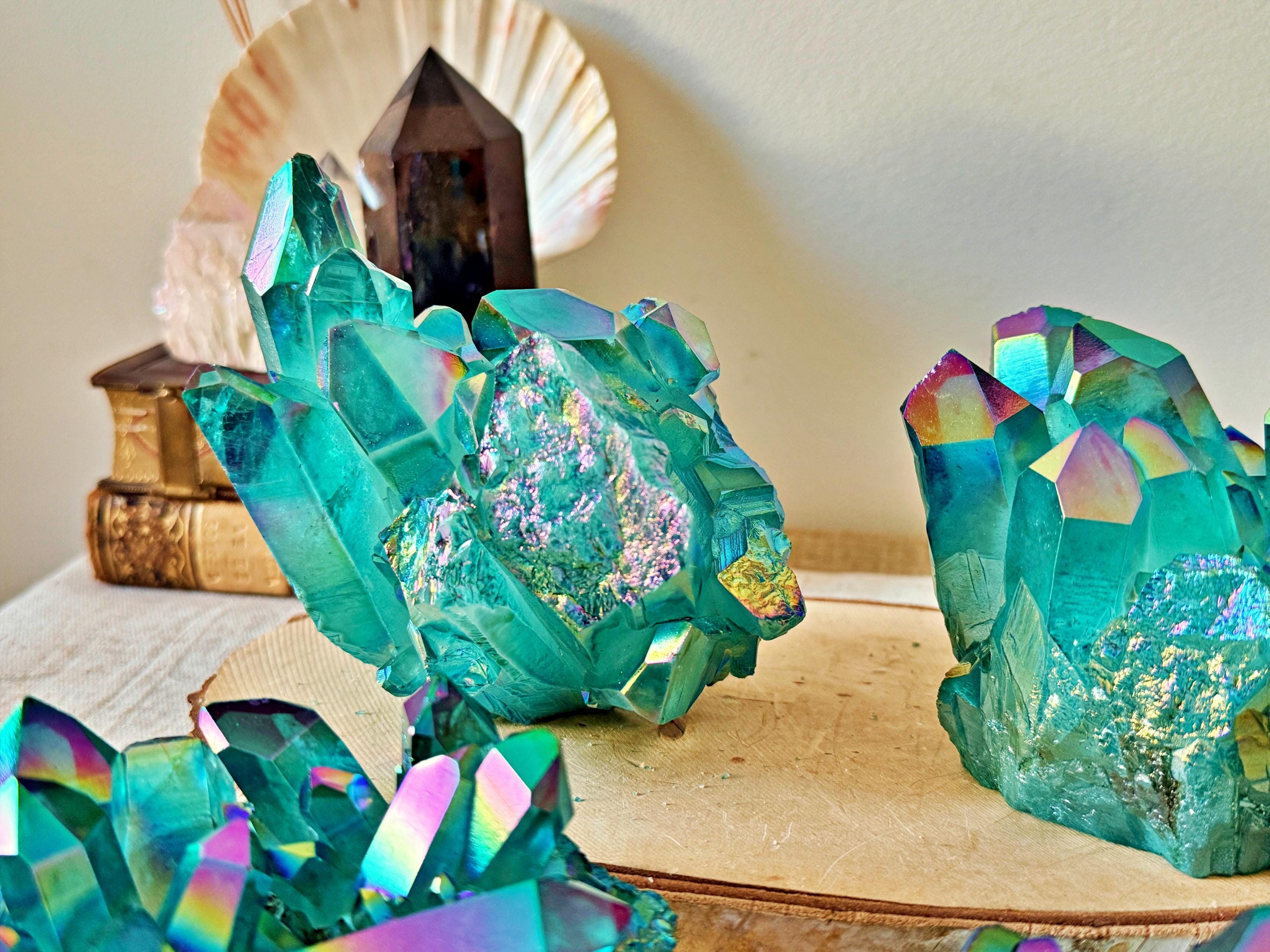 XXL natural quartz clusters, enhanced with a laboratory Aqua Aura surface treatment, creating intense turquoise-blue and iridescent reflections across the crystal points.