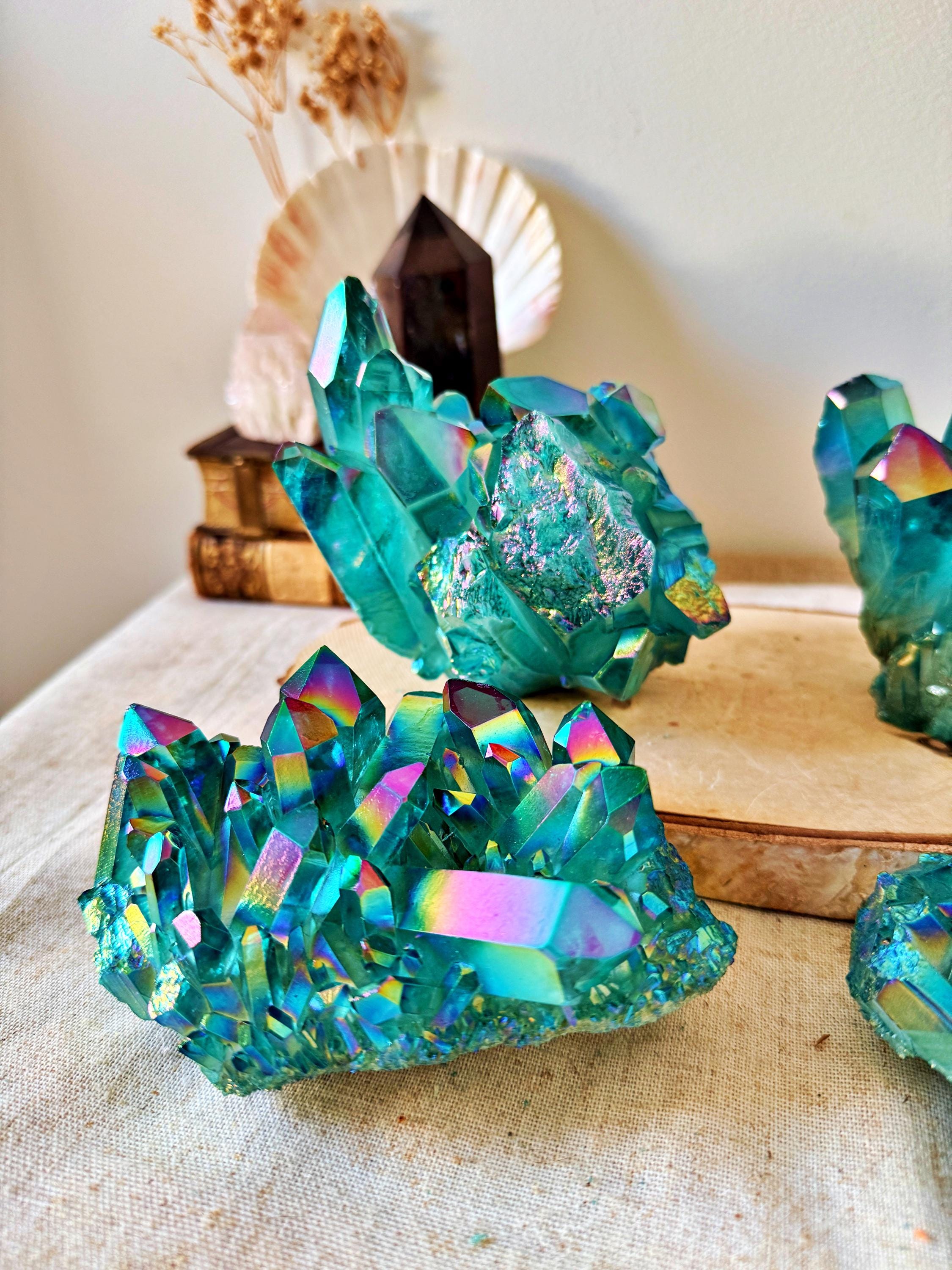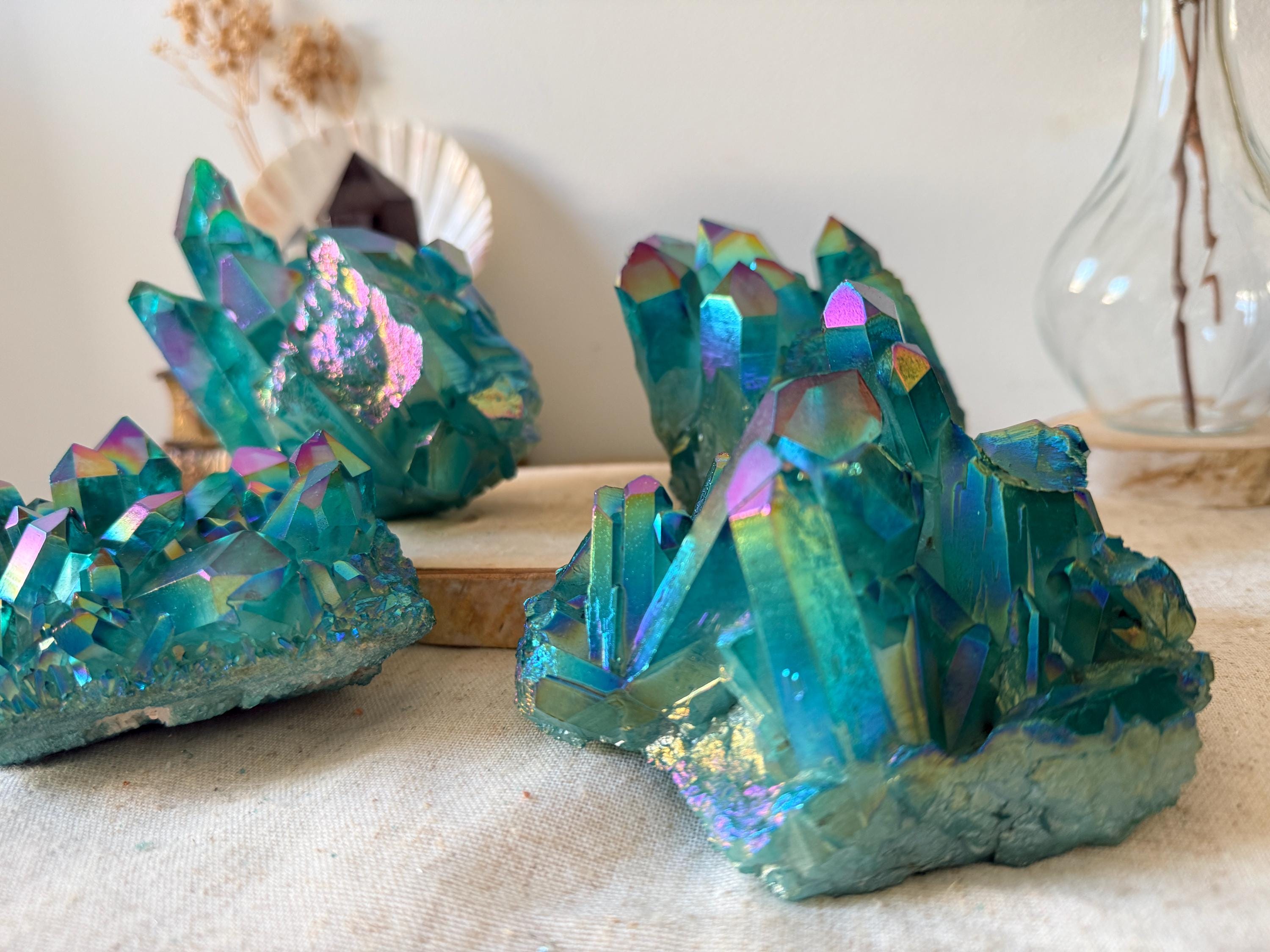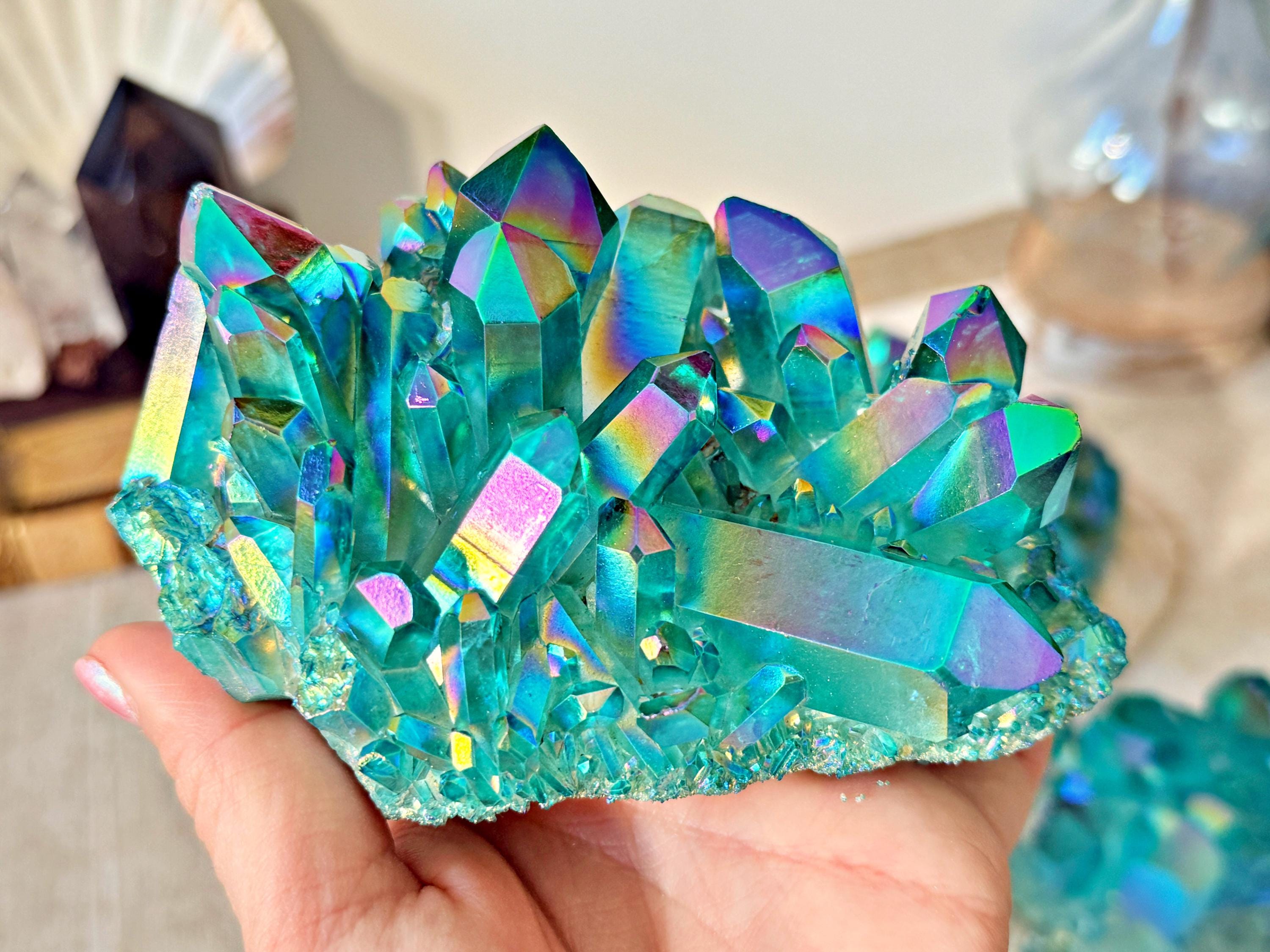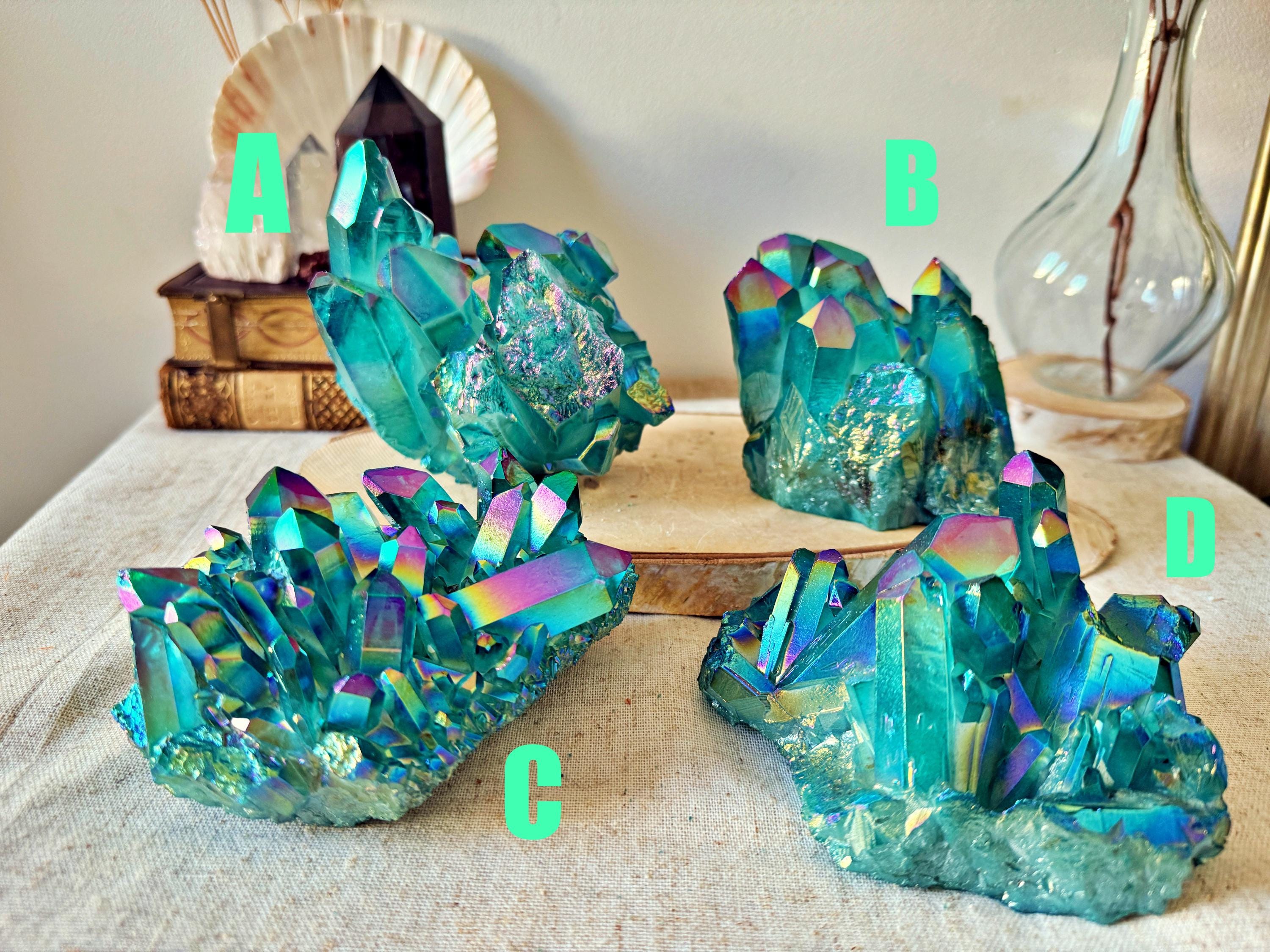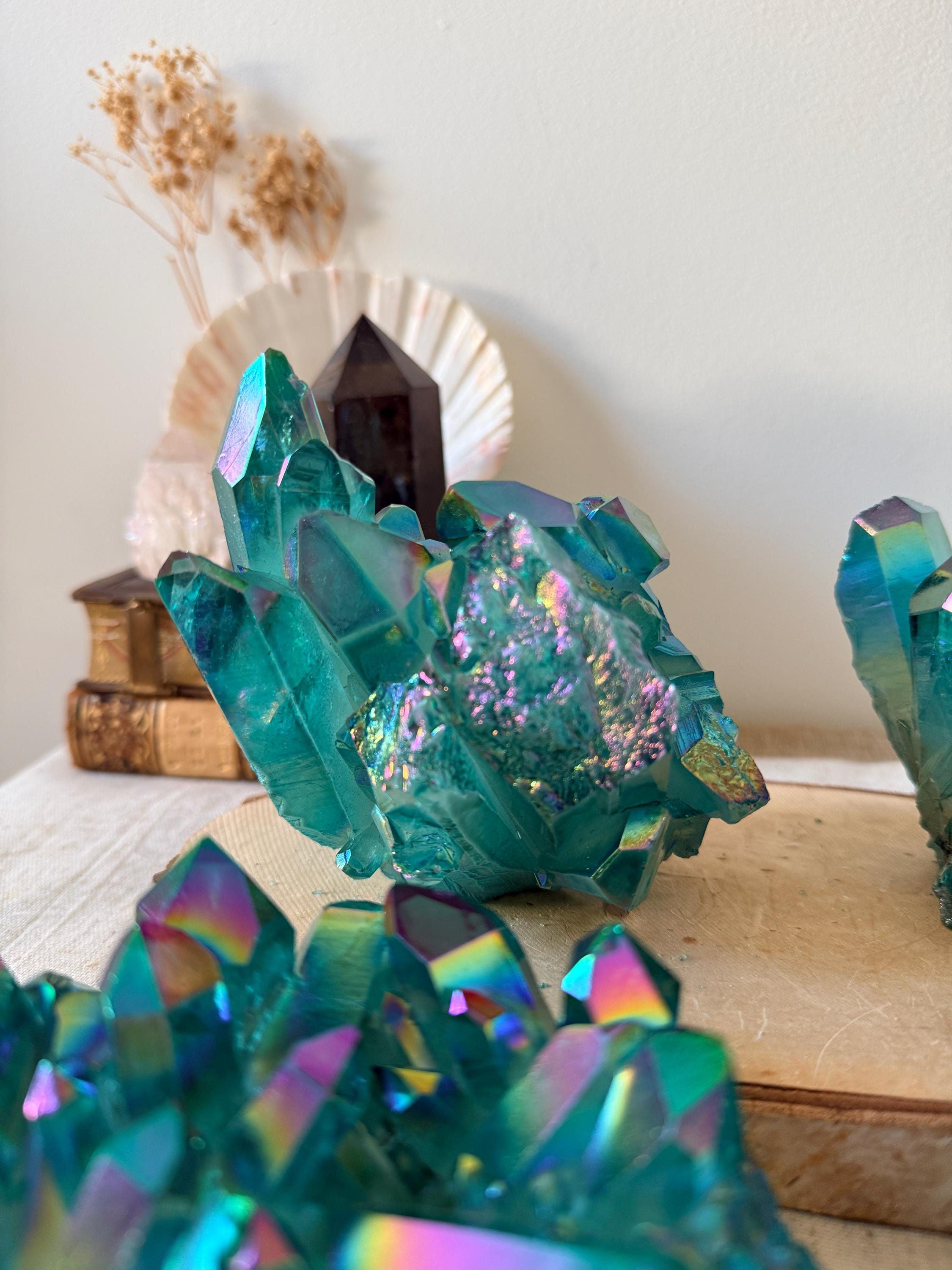 XXL natural quartz clusters, enhanced with a laboratory Aqua Aura surface treatment, creating intense turquoise-blue and iridescent reflections across the crystal points.