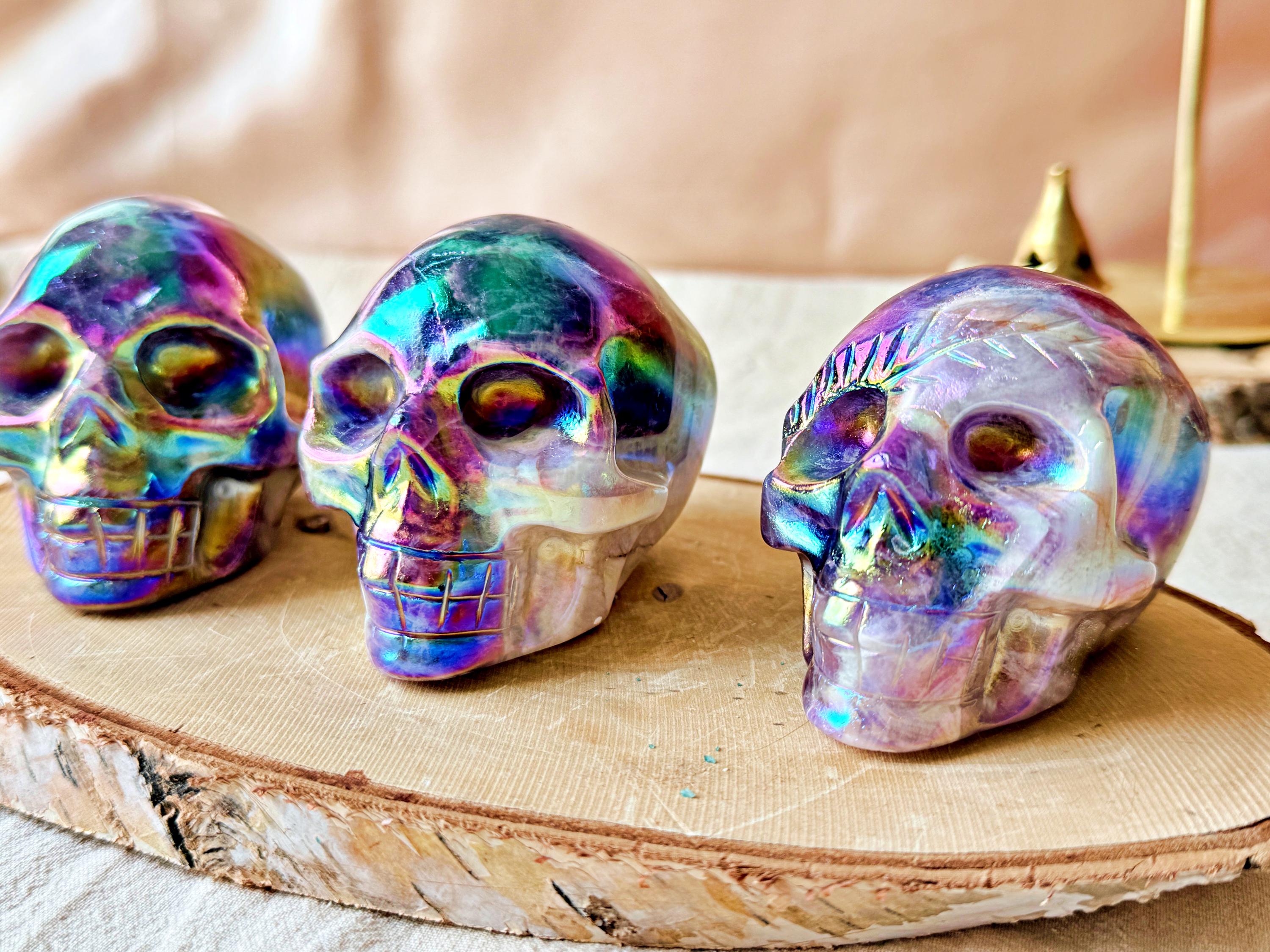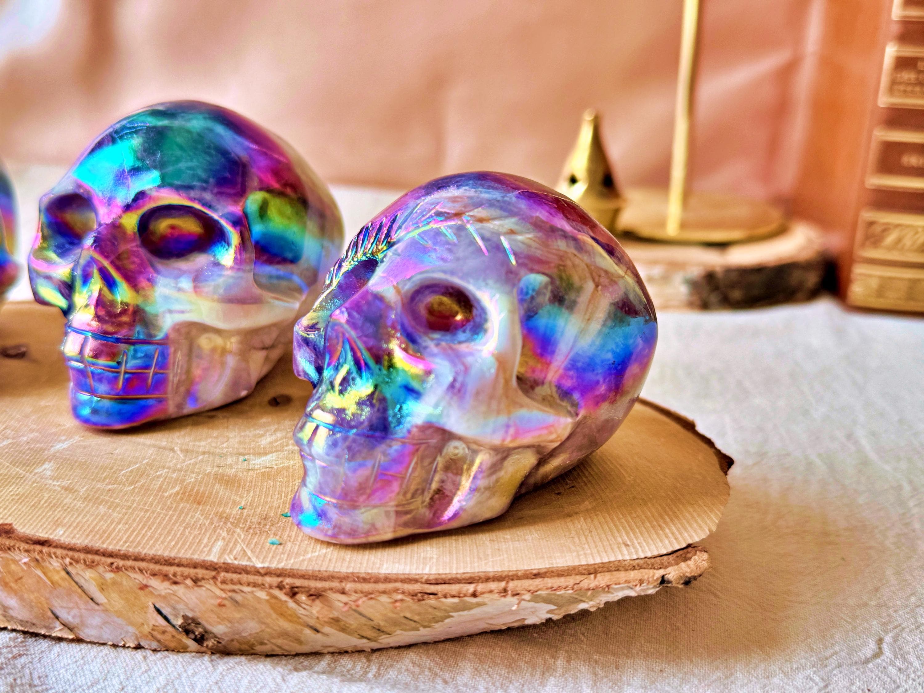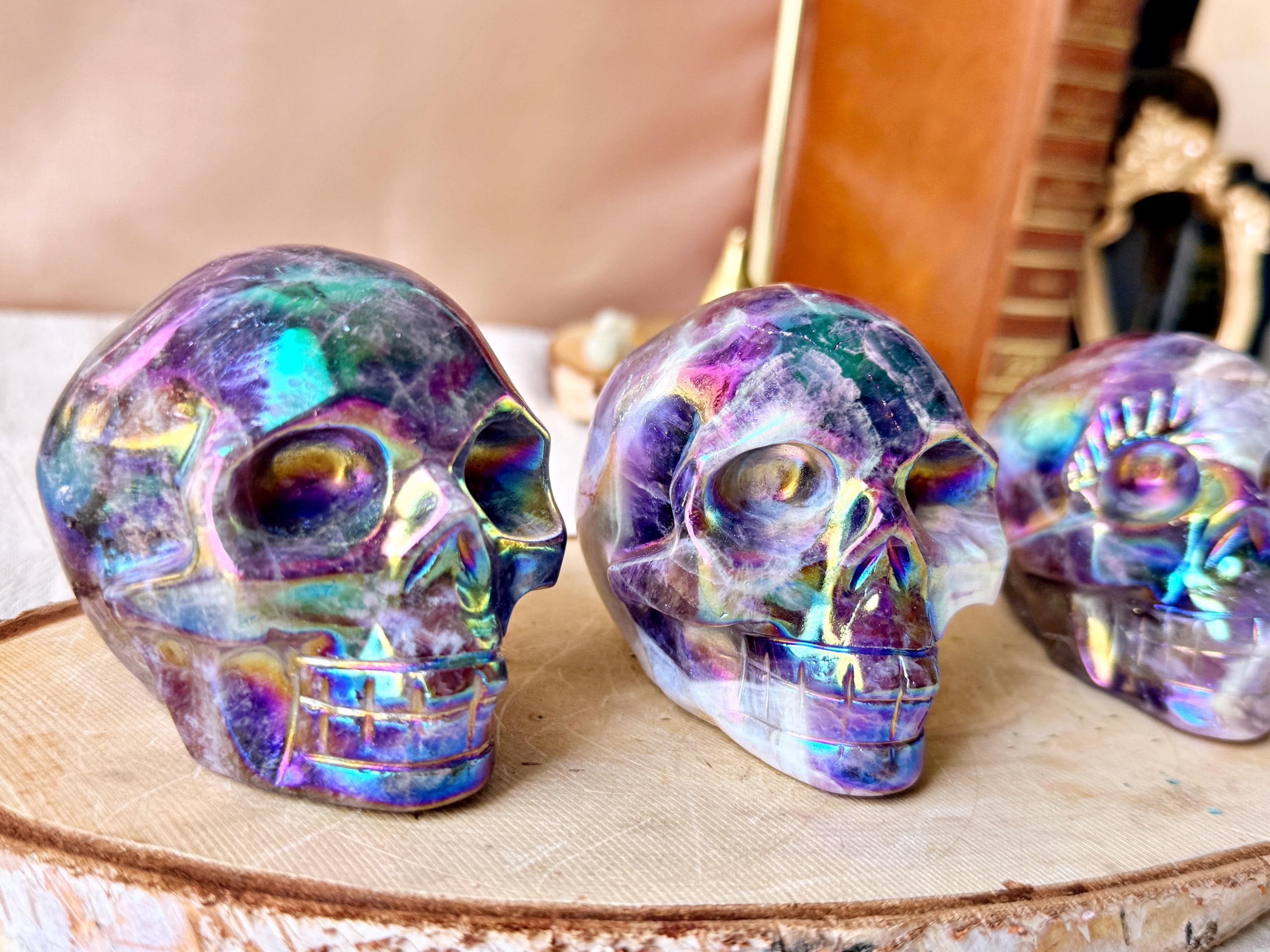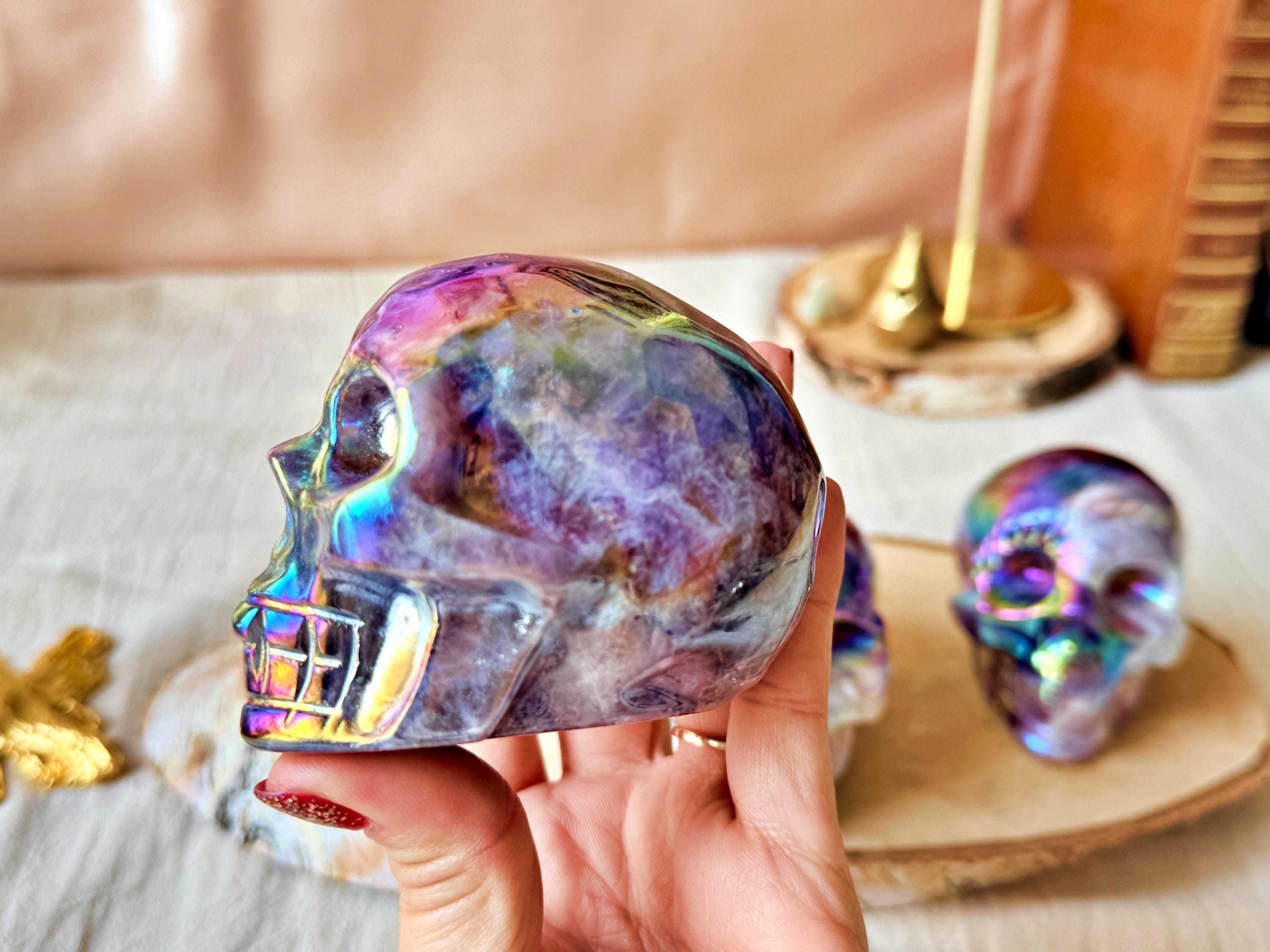 Carved from natural chevron amethyst (distinctive purple and white banding), then enhanced with a laboratory Aura surface treatment, creating permanent iridescent reflections across the crystal.