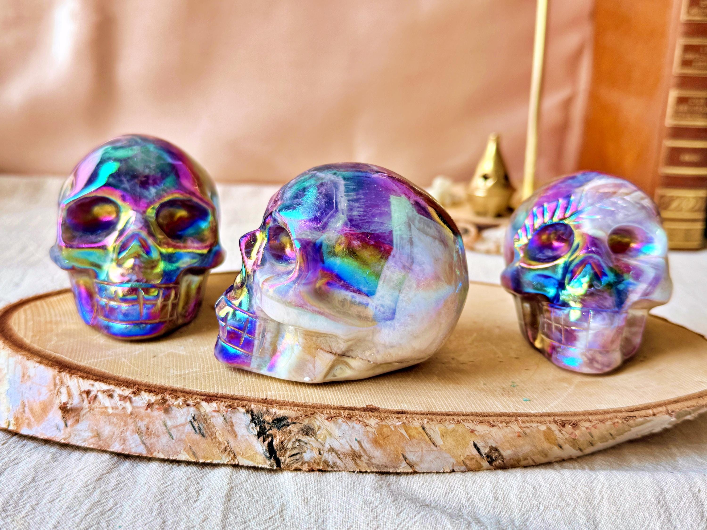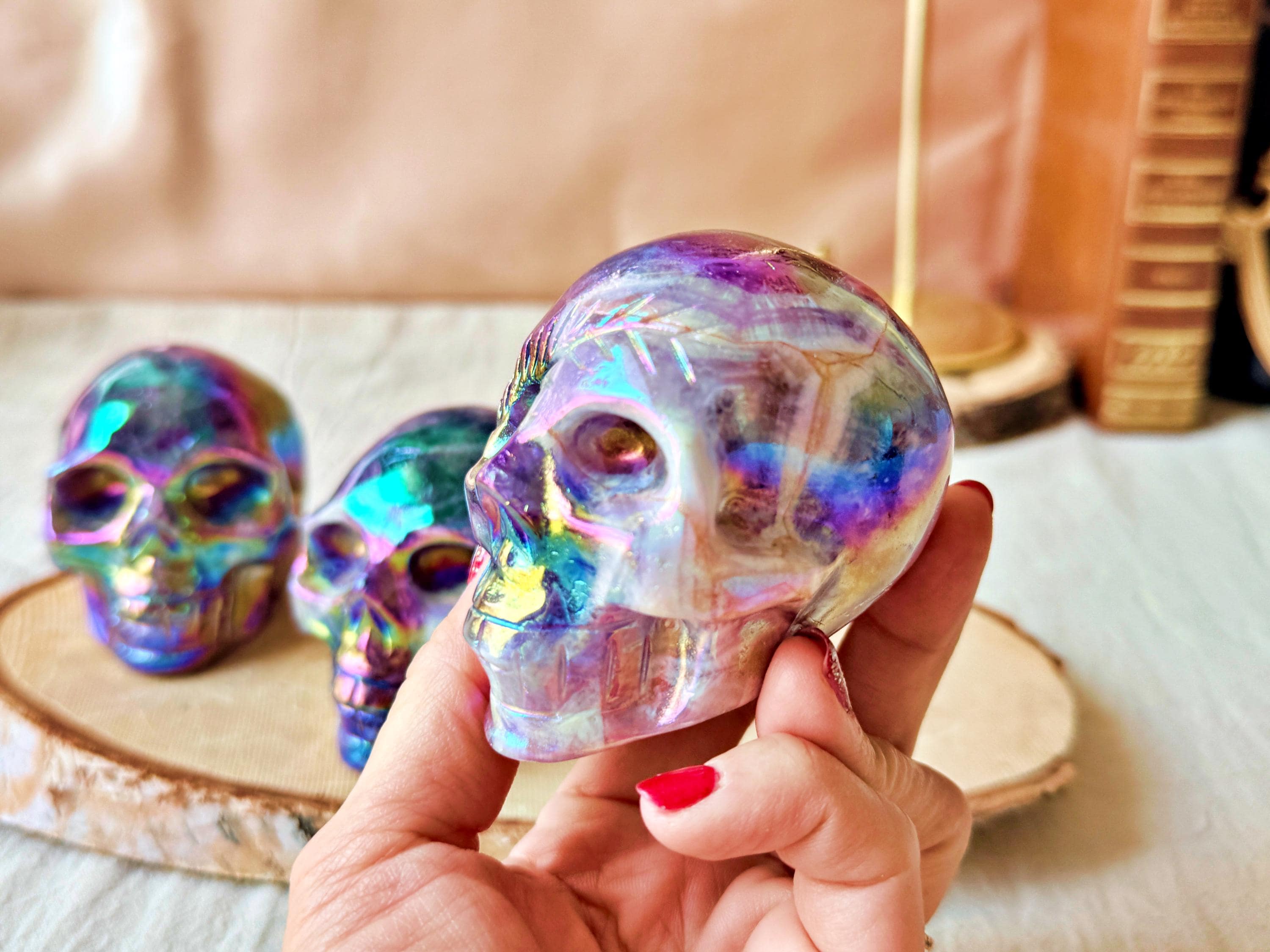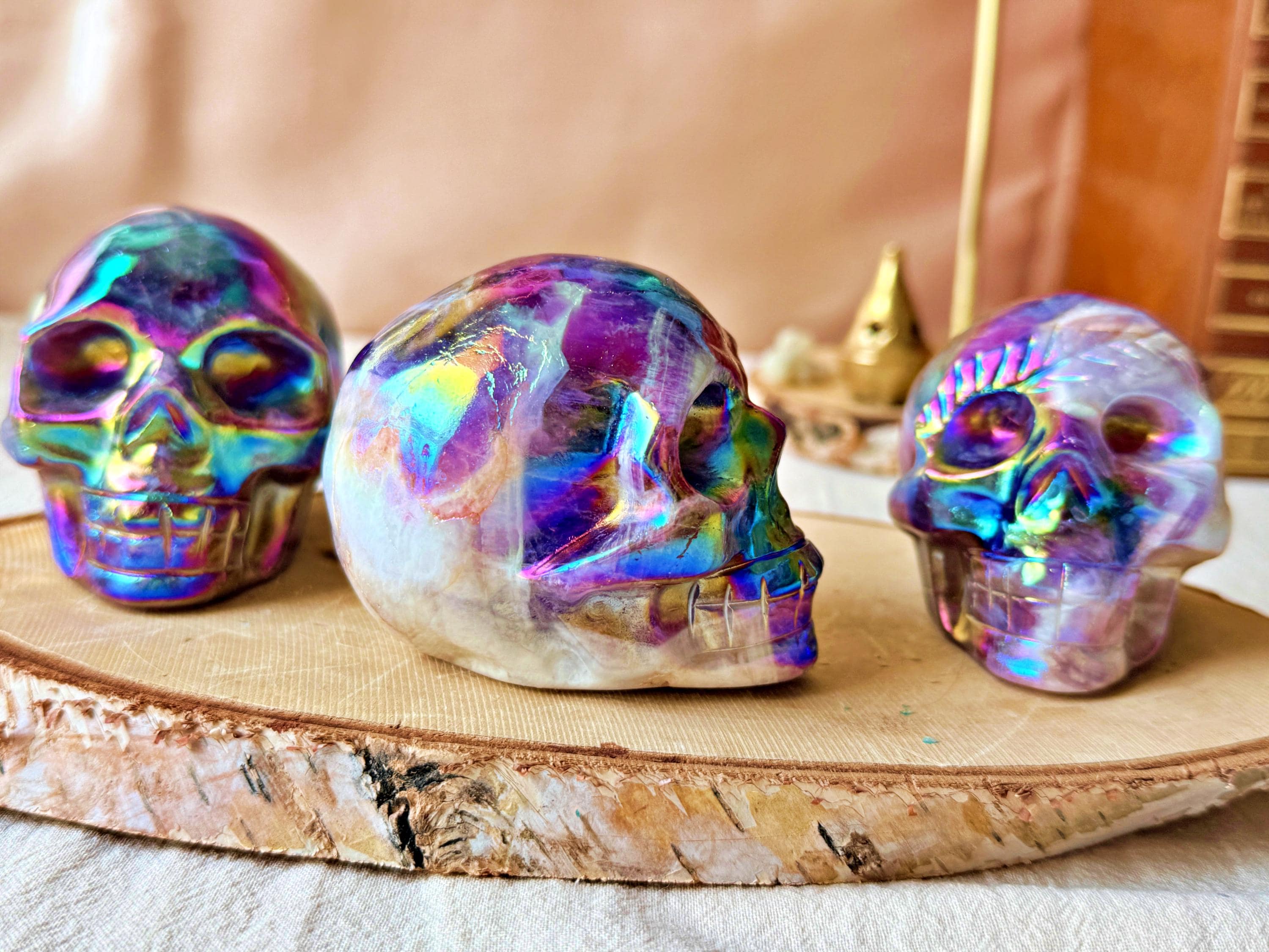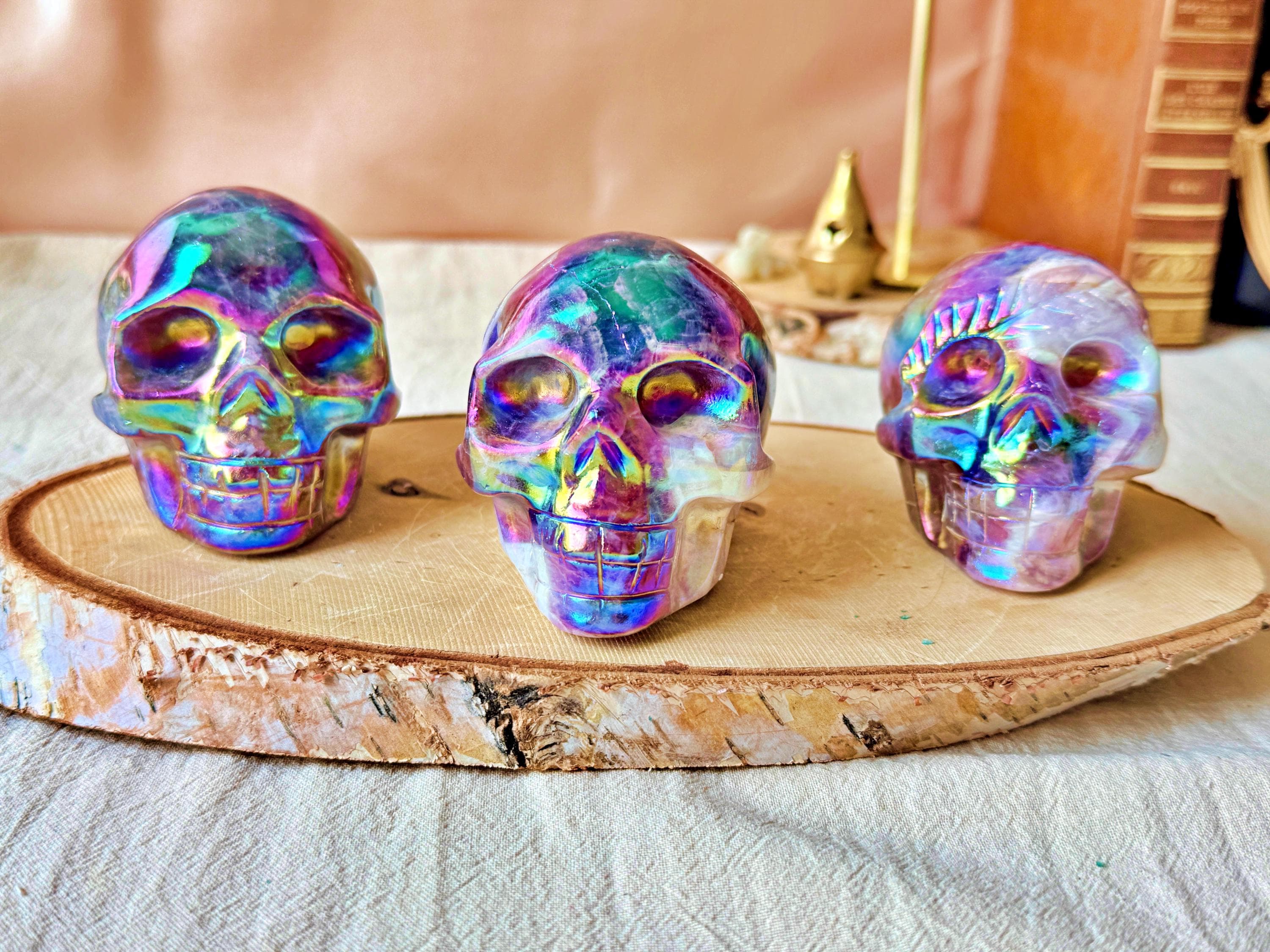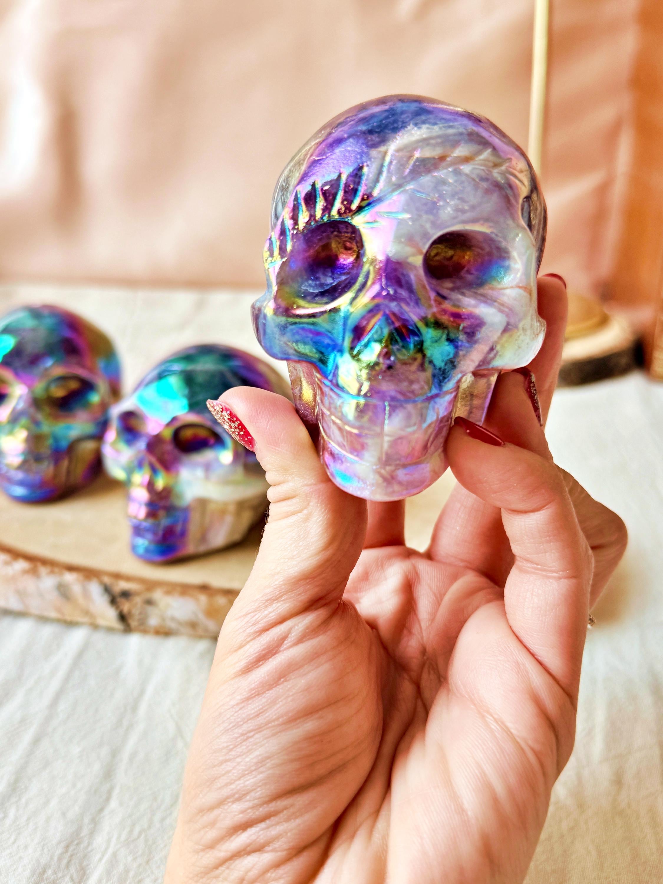 Carved from natural chevron amethyst (distinctive purple and white banding), then enhanced with a laboratory Aura surface treatment, creating permanent iridescent reflections across the crystal.