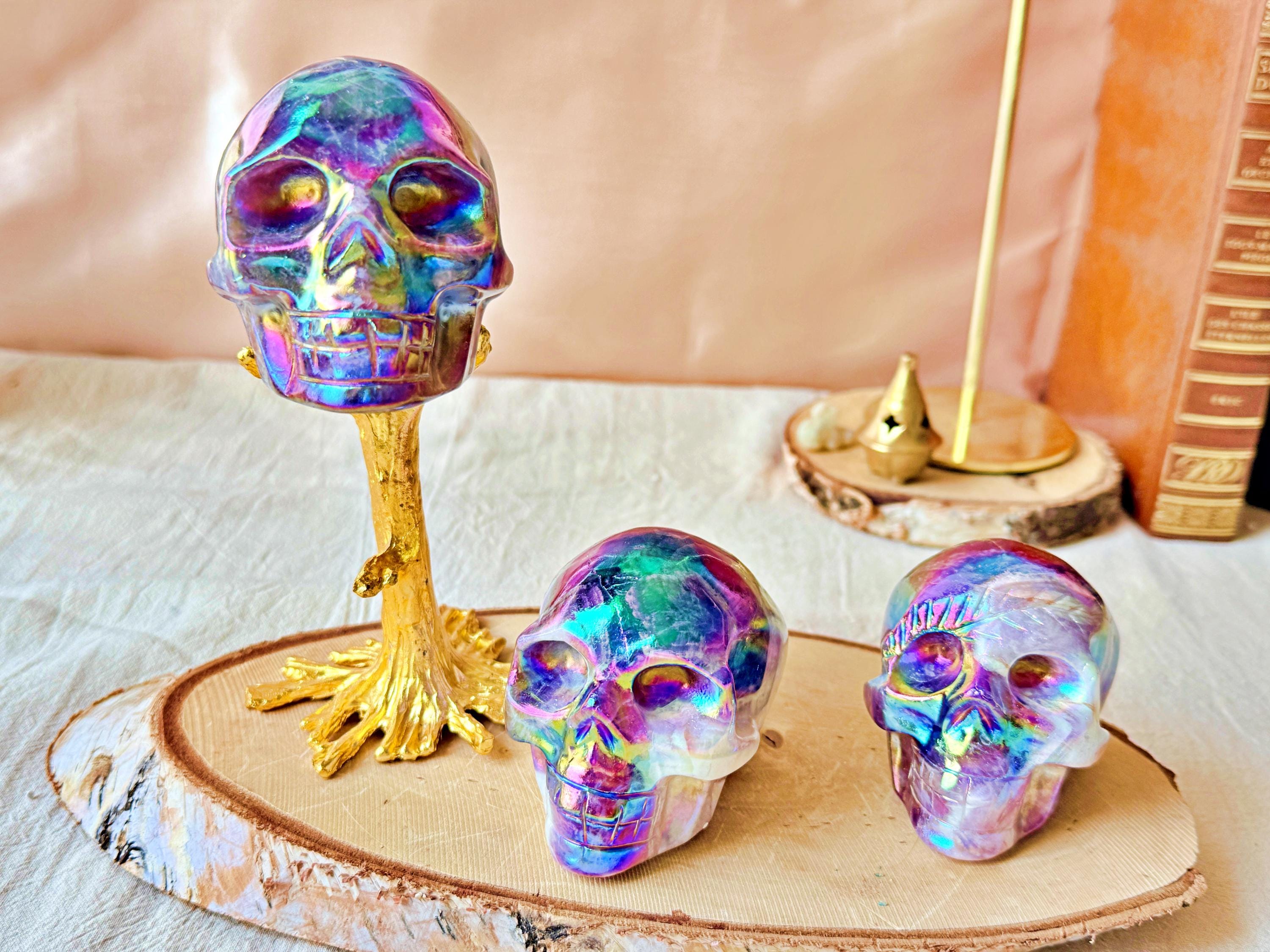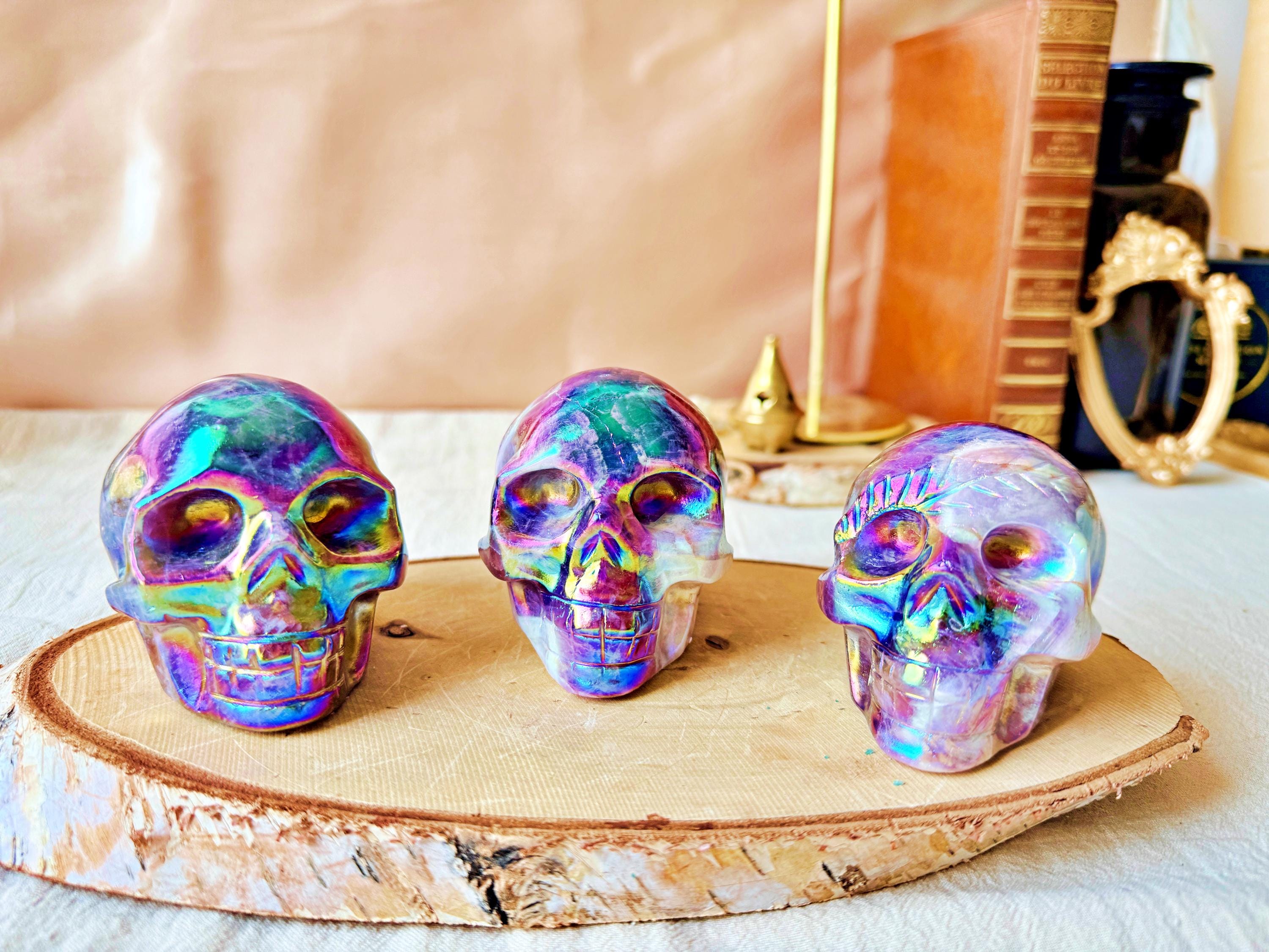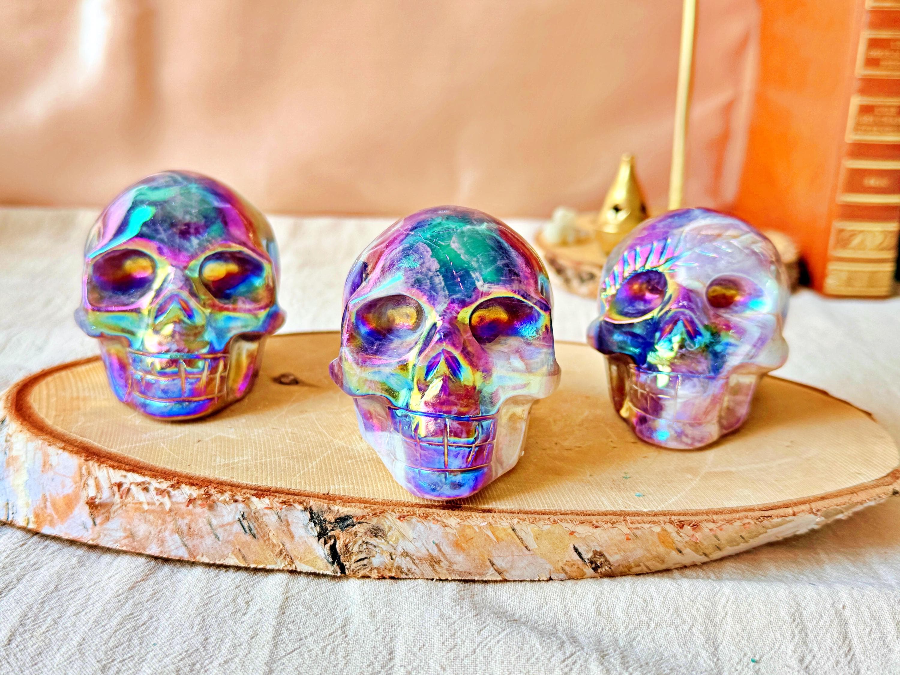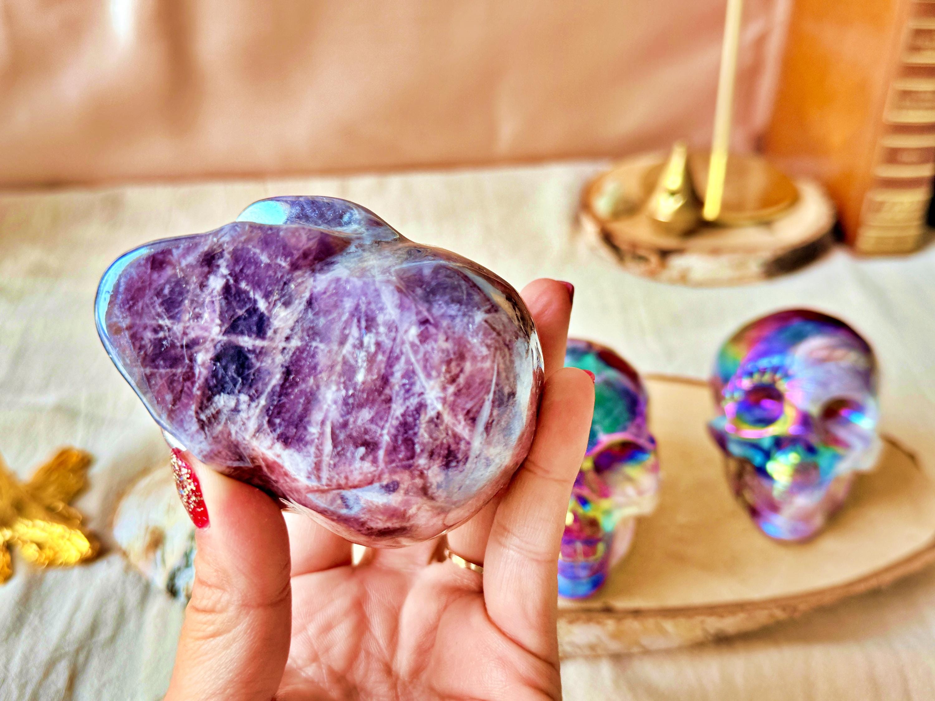 Carved from natural chevron amethyst (distinctive purple and white banding), then enhanced with a laboratory Aura surface treatment, creating permanent iridescent reflections across the crystal.