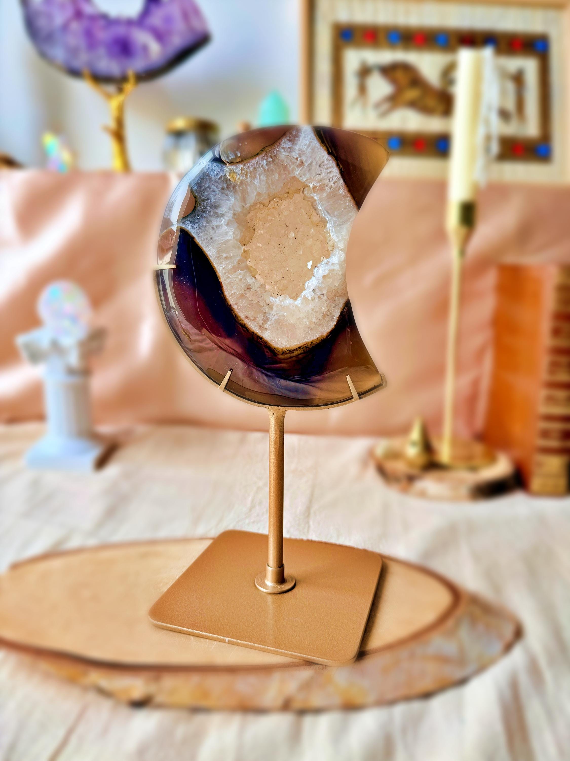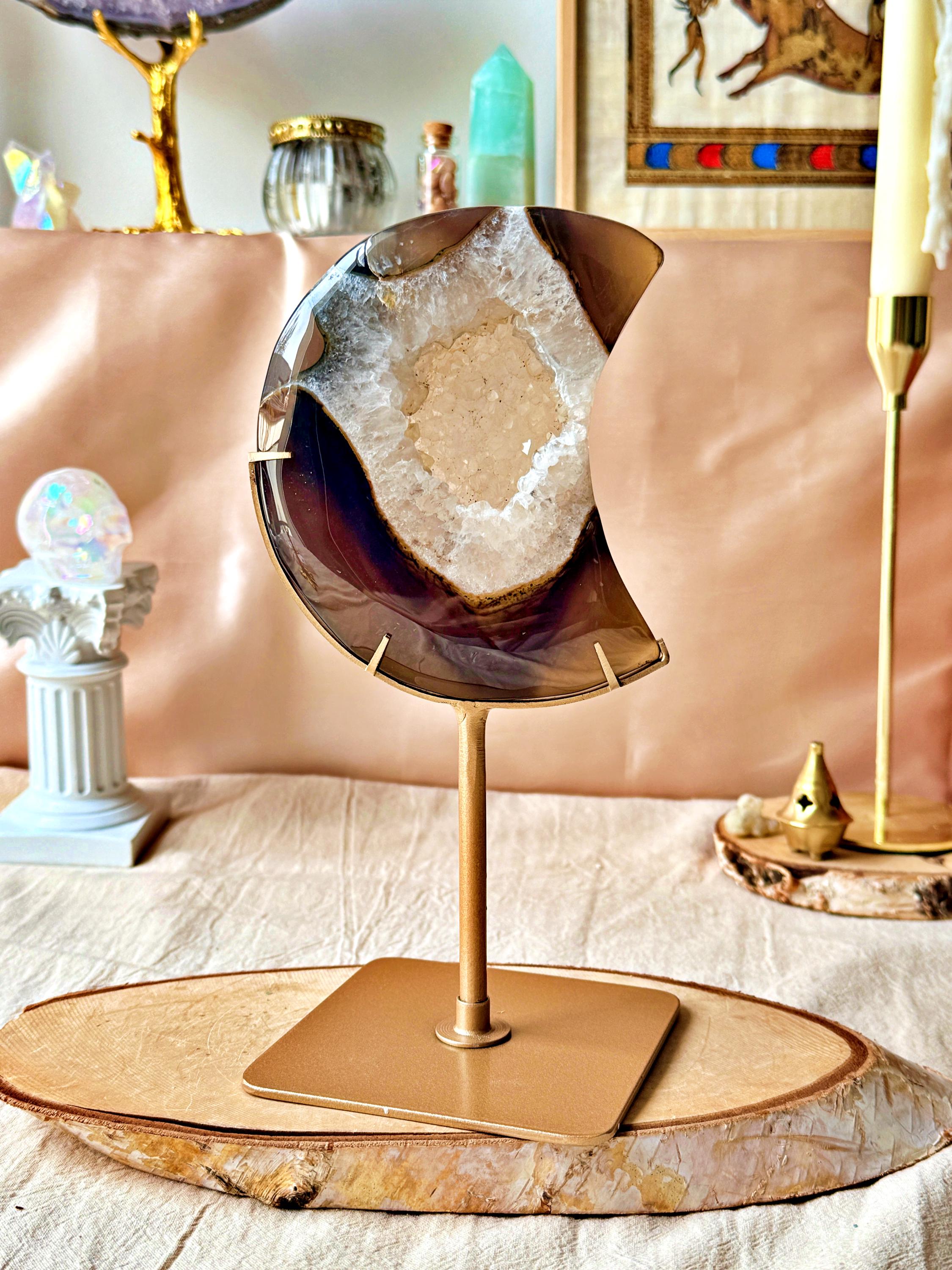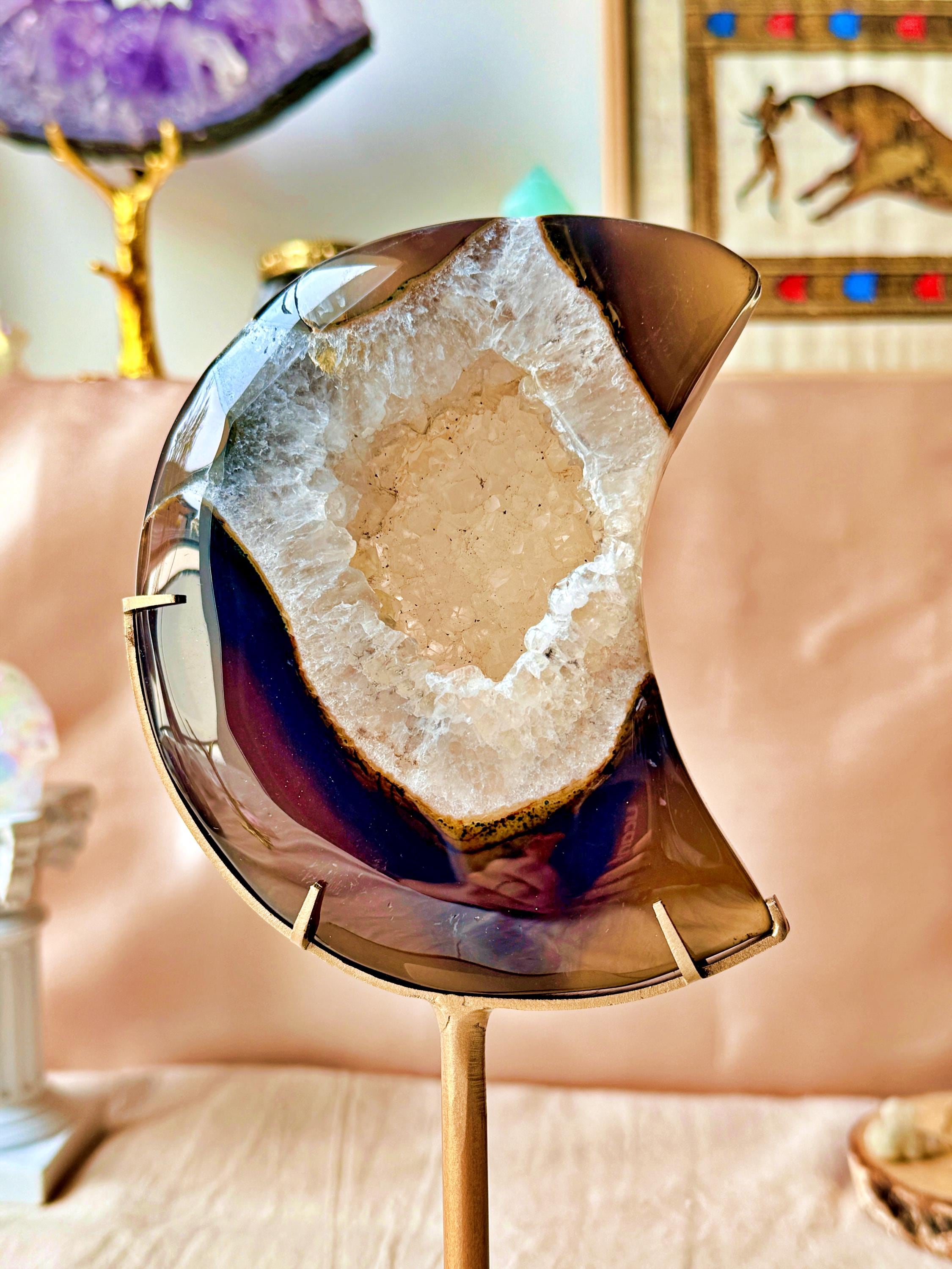 The natural banding and cloudy mineral formations create depth and contrast, enhanced by the crescent moon shape. Each section reveals unique shades typical of this agate variety.