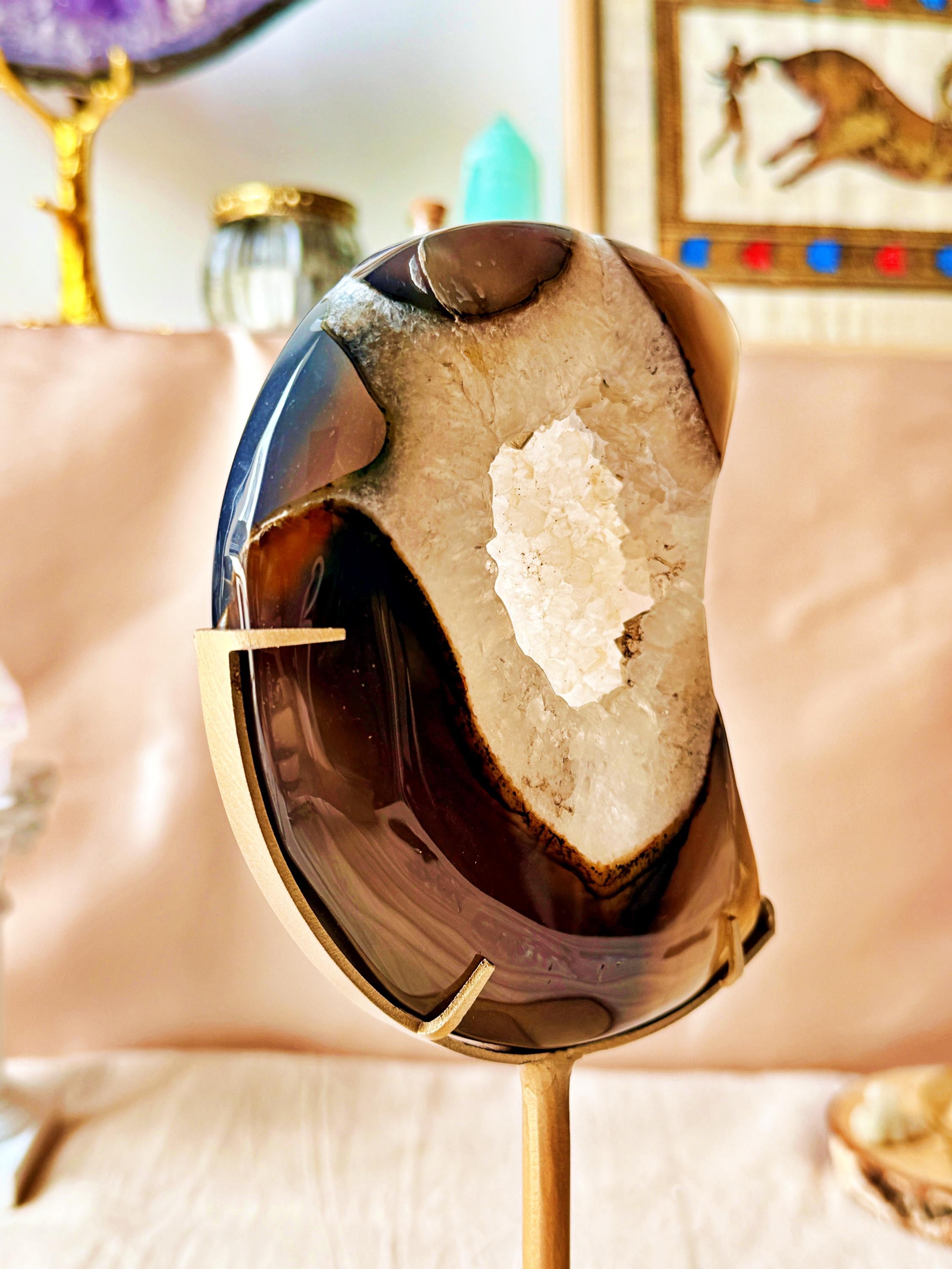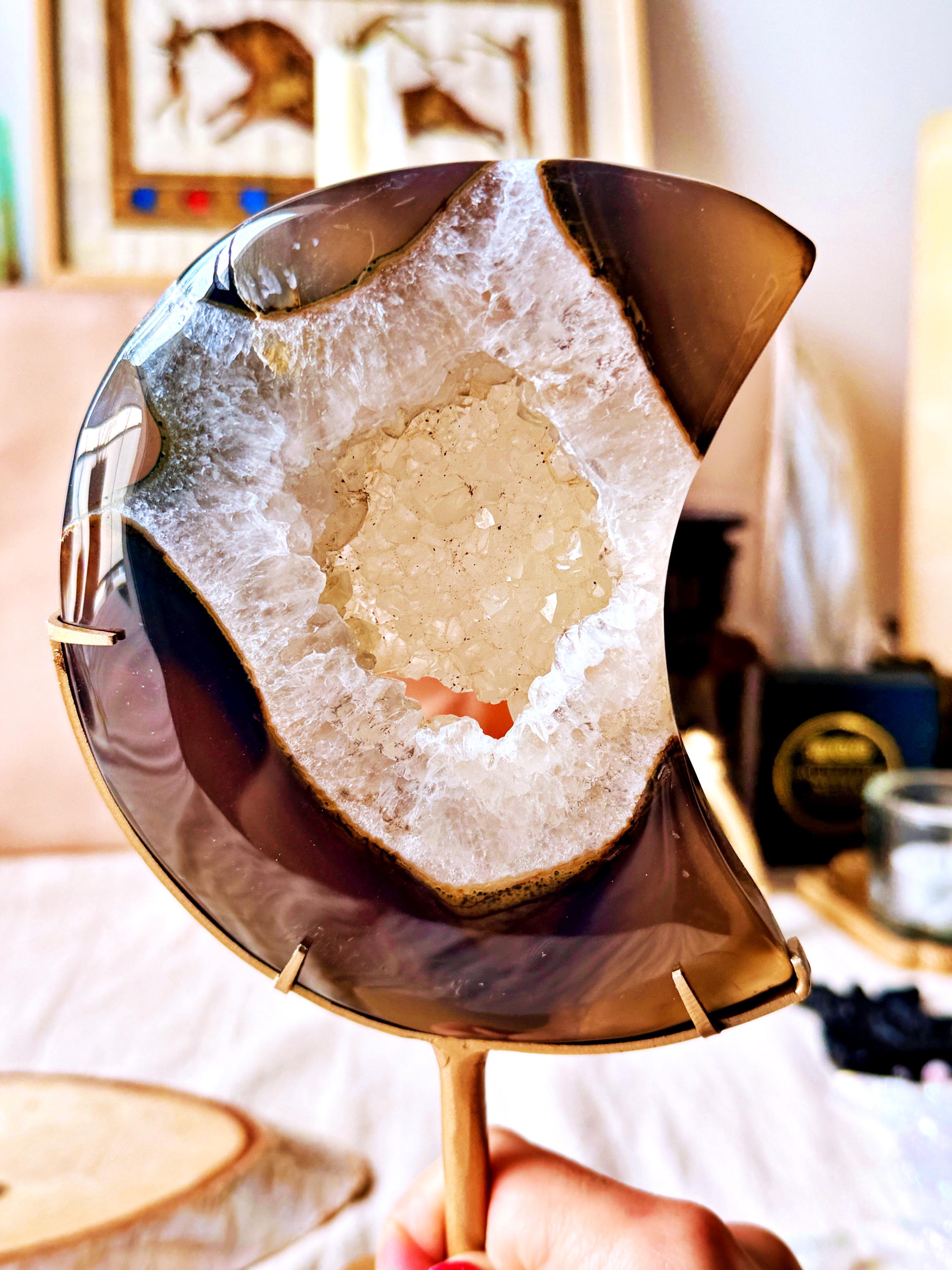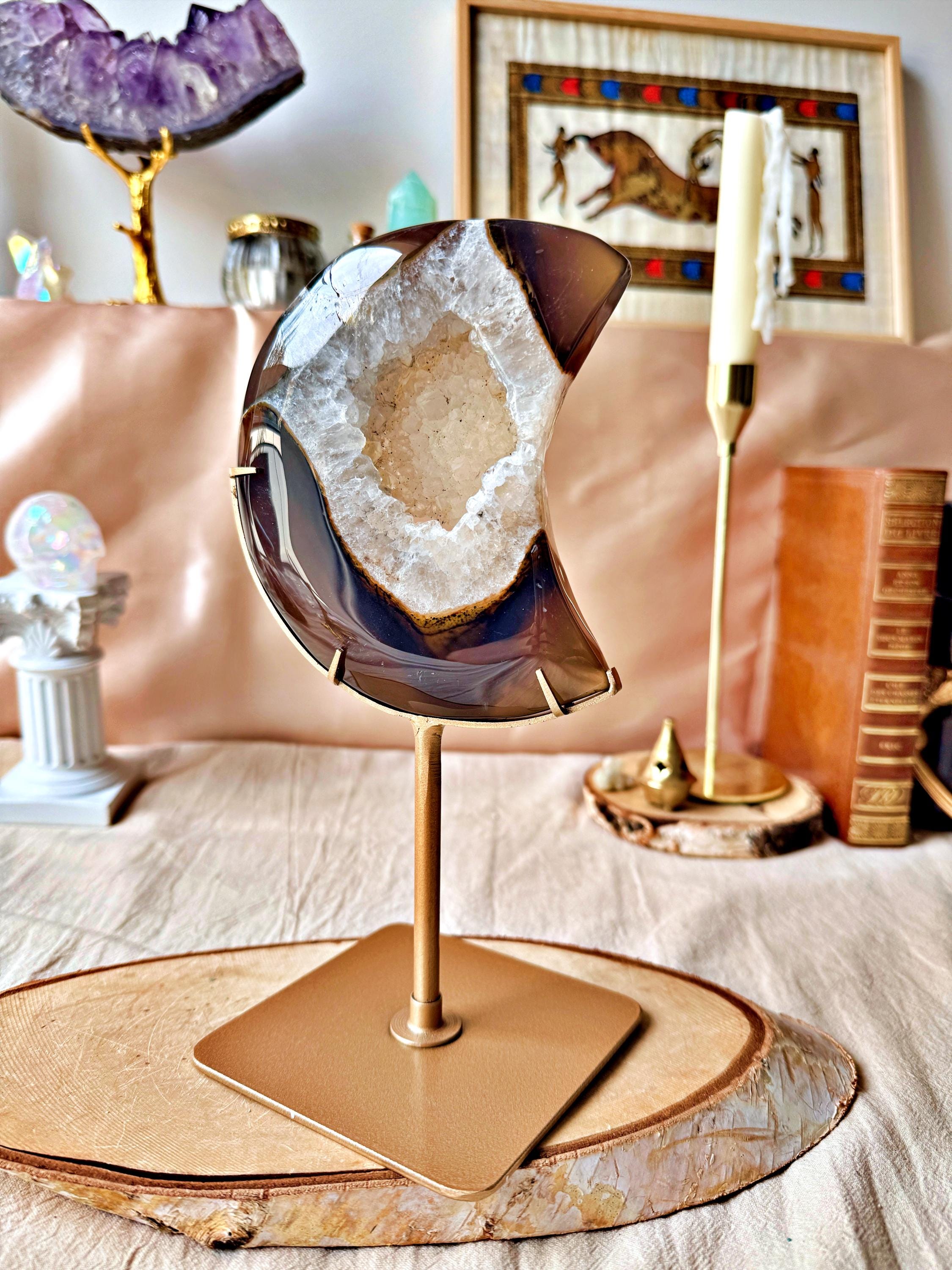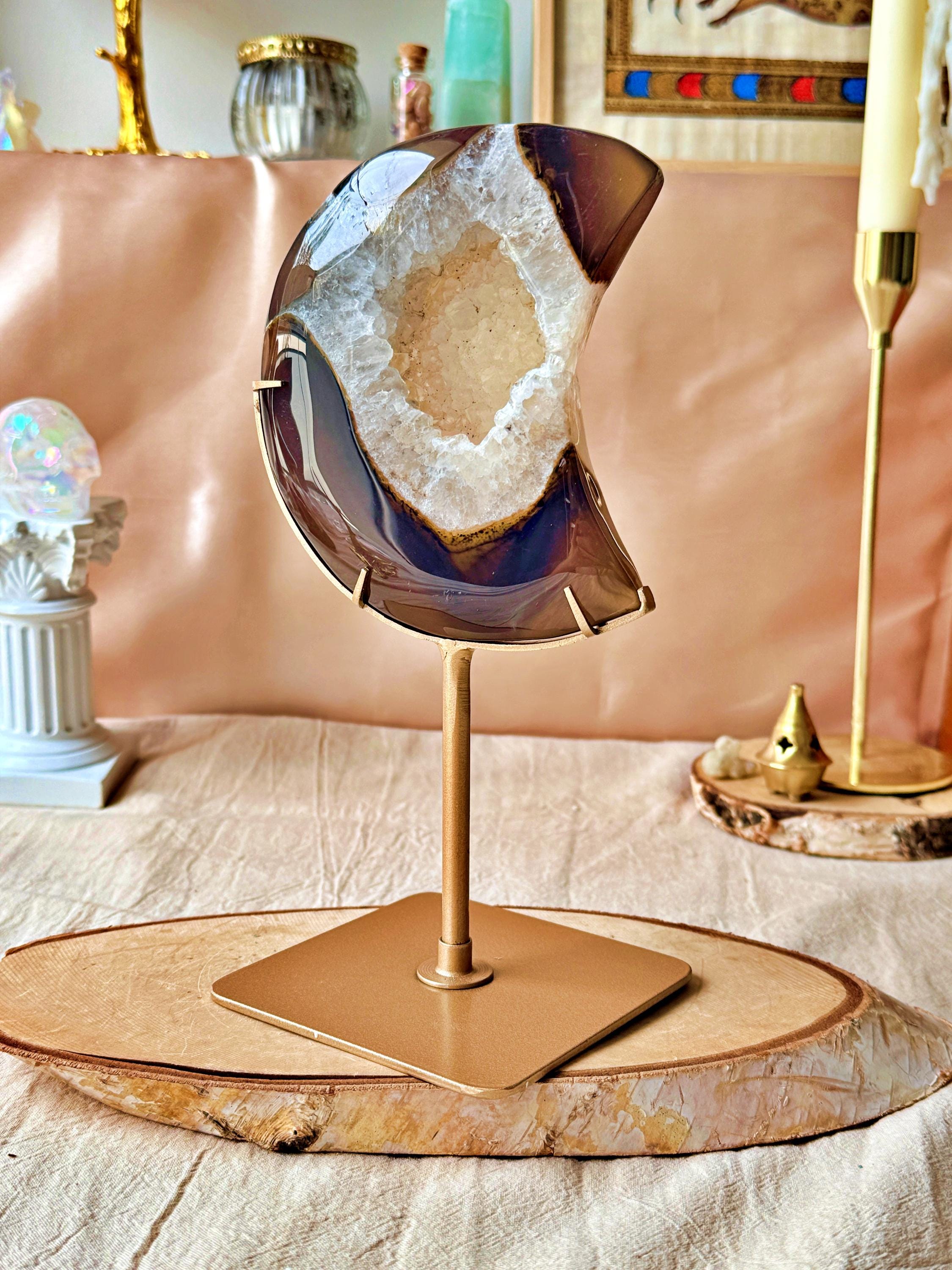 The natural banding and cloudy mineral formations create depth and contrast, enhanced by the crescent moon shape. Each section reveals unique shades typical of this agate variety.