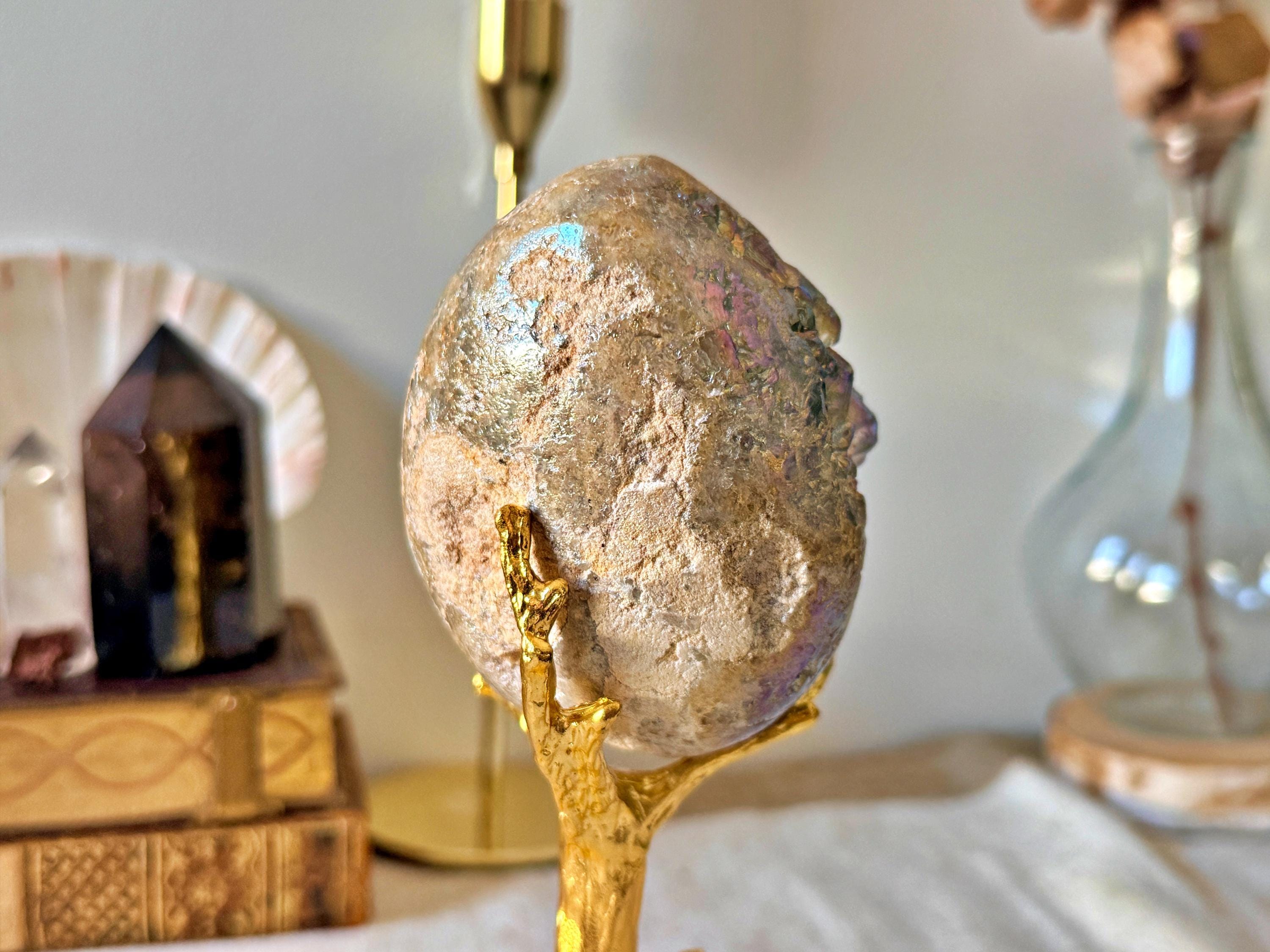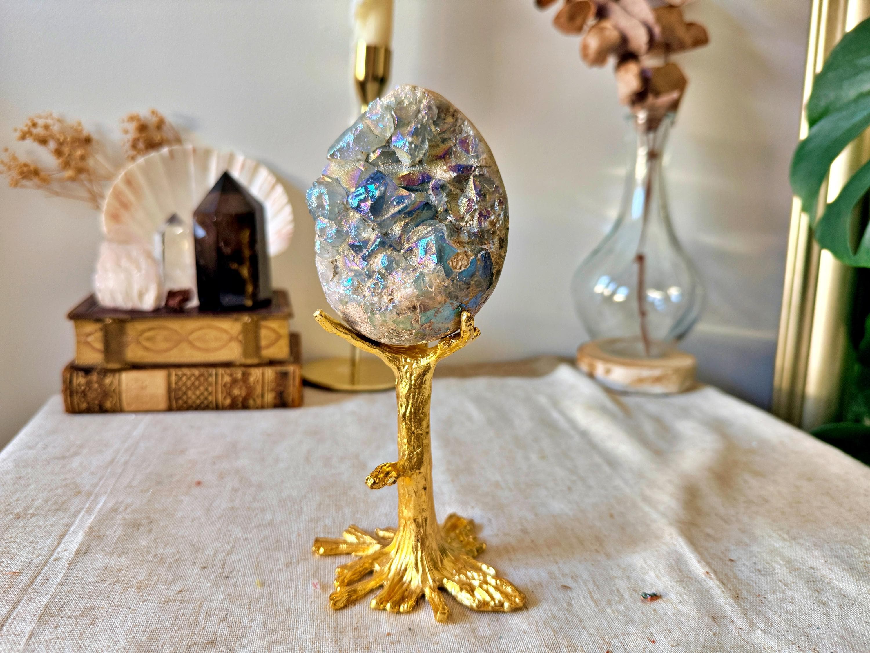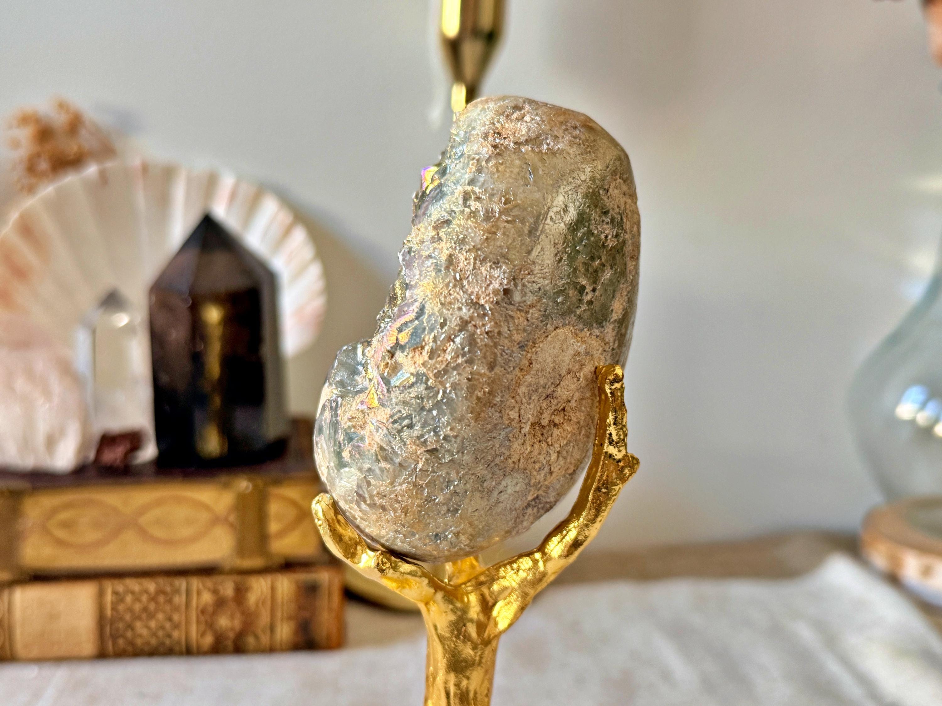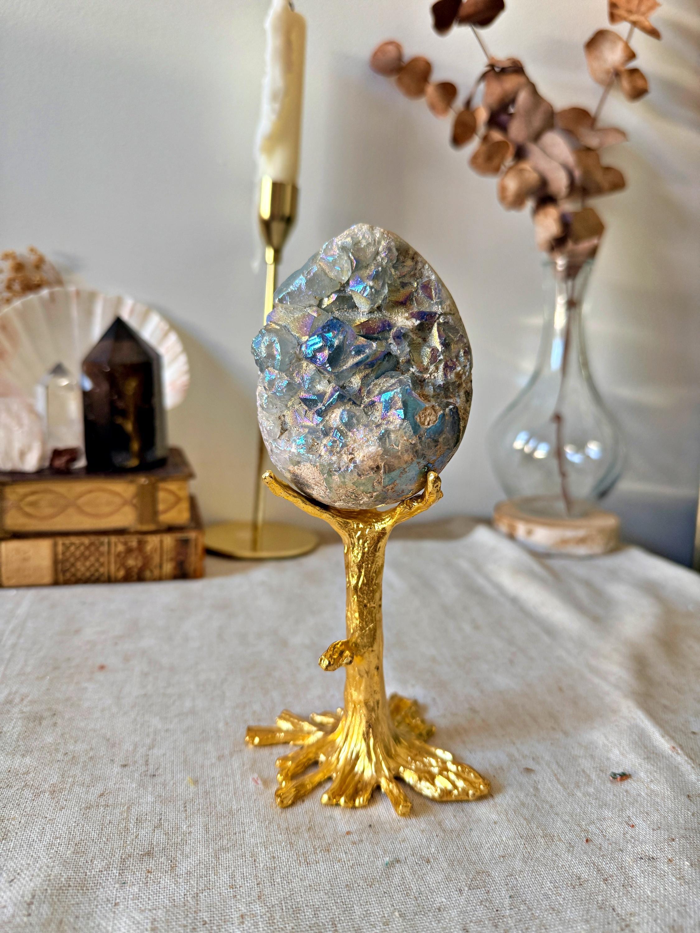 The crystalline surface remains raw and textured, contrasting with the denser mineral matrix. The piece is displayed on a gold-toned brass stand, inspired by a “sacred tree” design, adding a sculptural and decorative dimension.