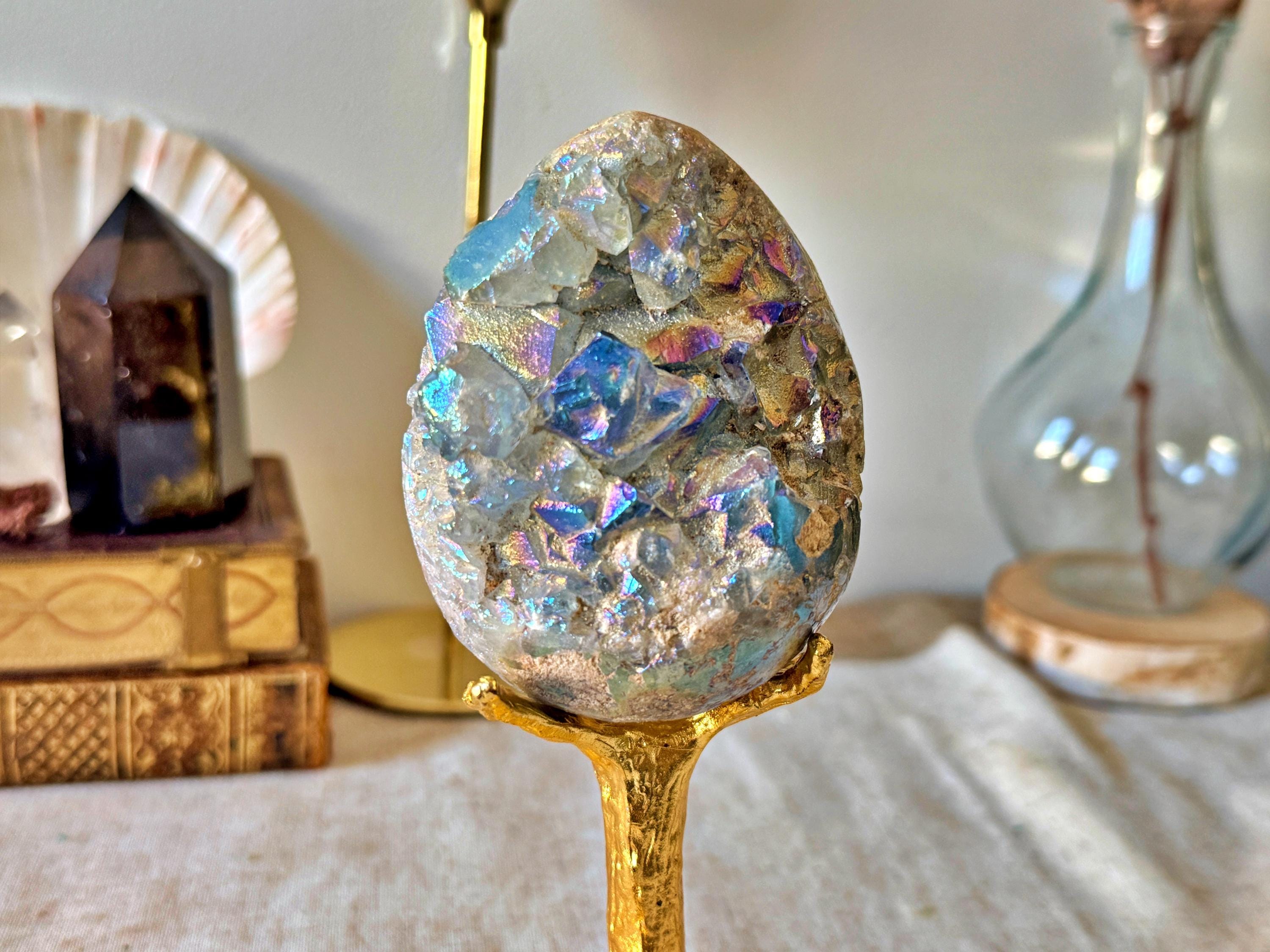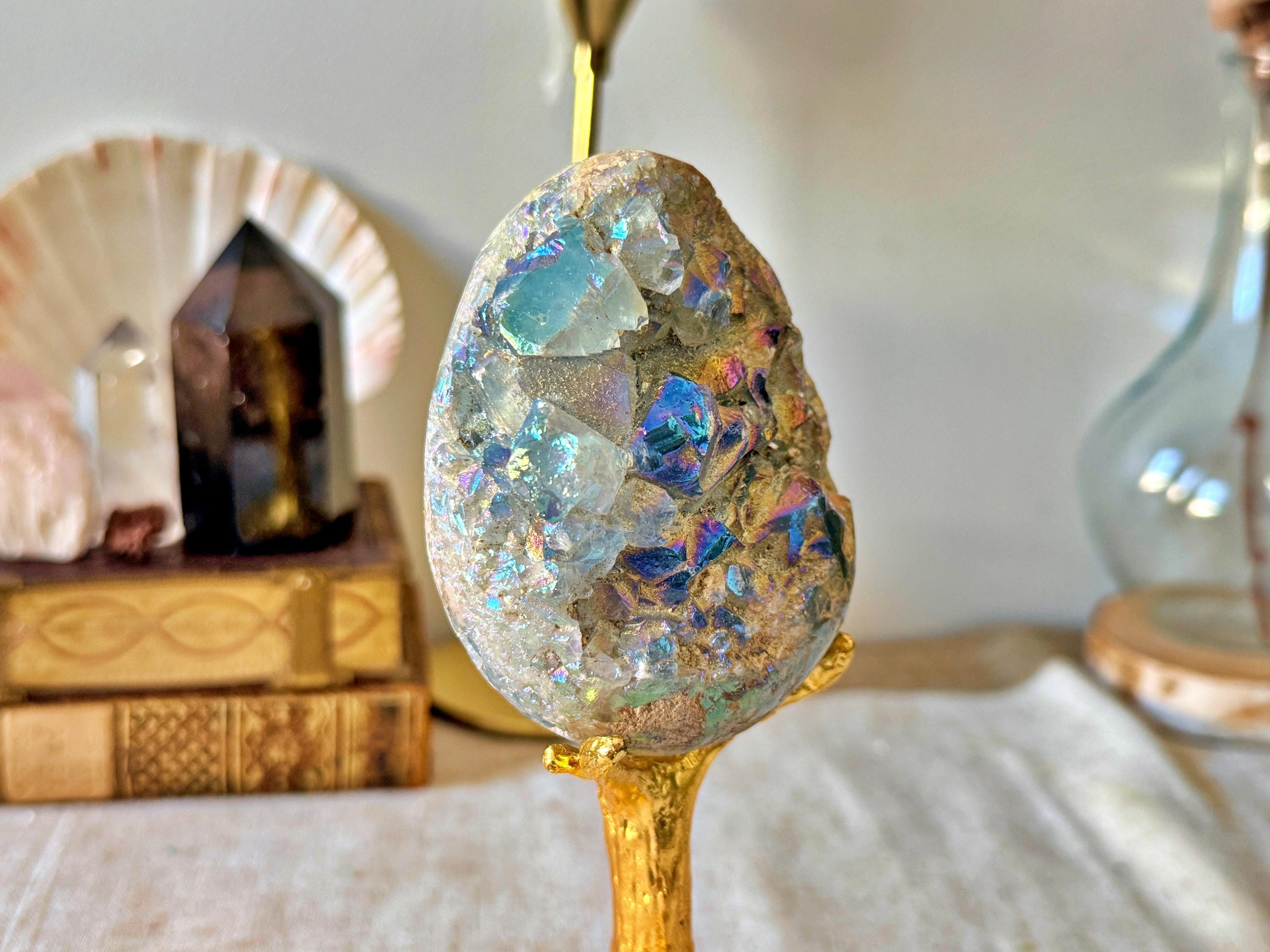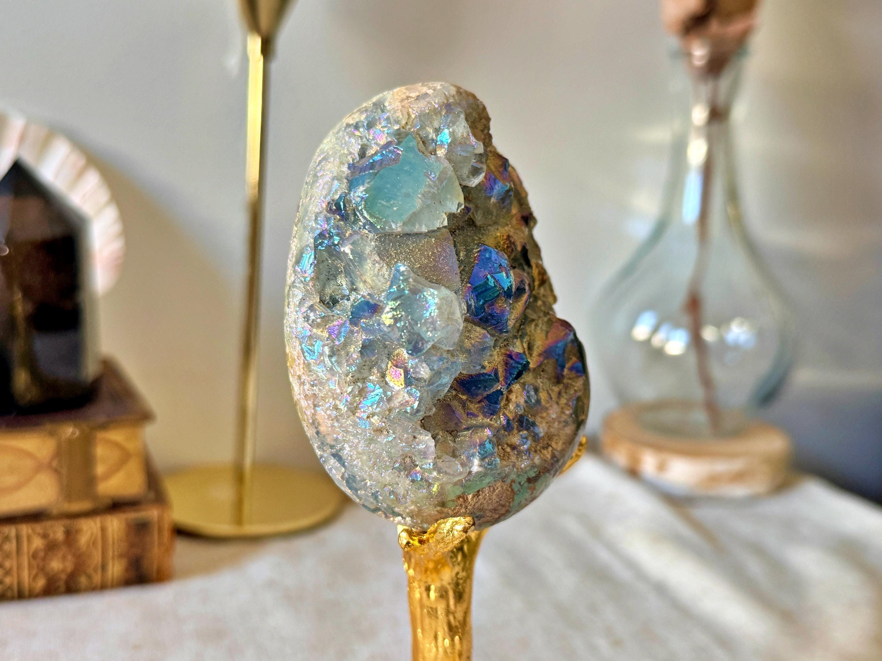 Half geode of natural celestine, featuring well-defined internal crystal formations, enhanced with a laboratory Aura surface treatment producing iridescent reflections in blue, gold and violet tones.