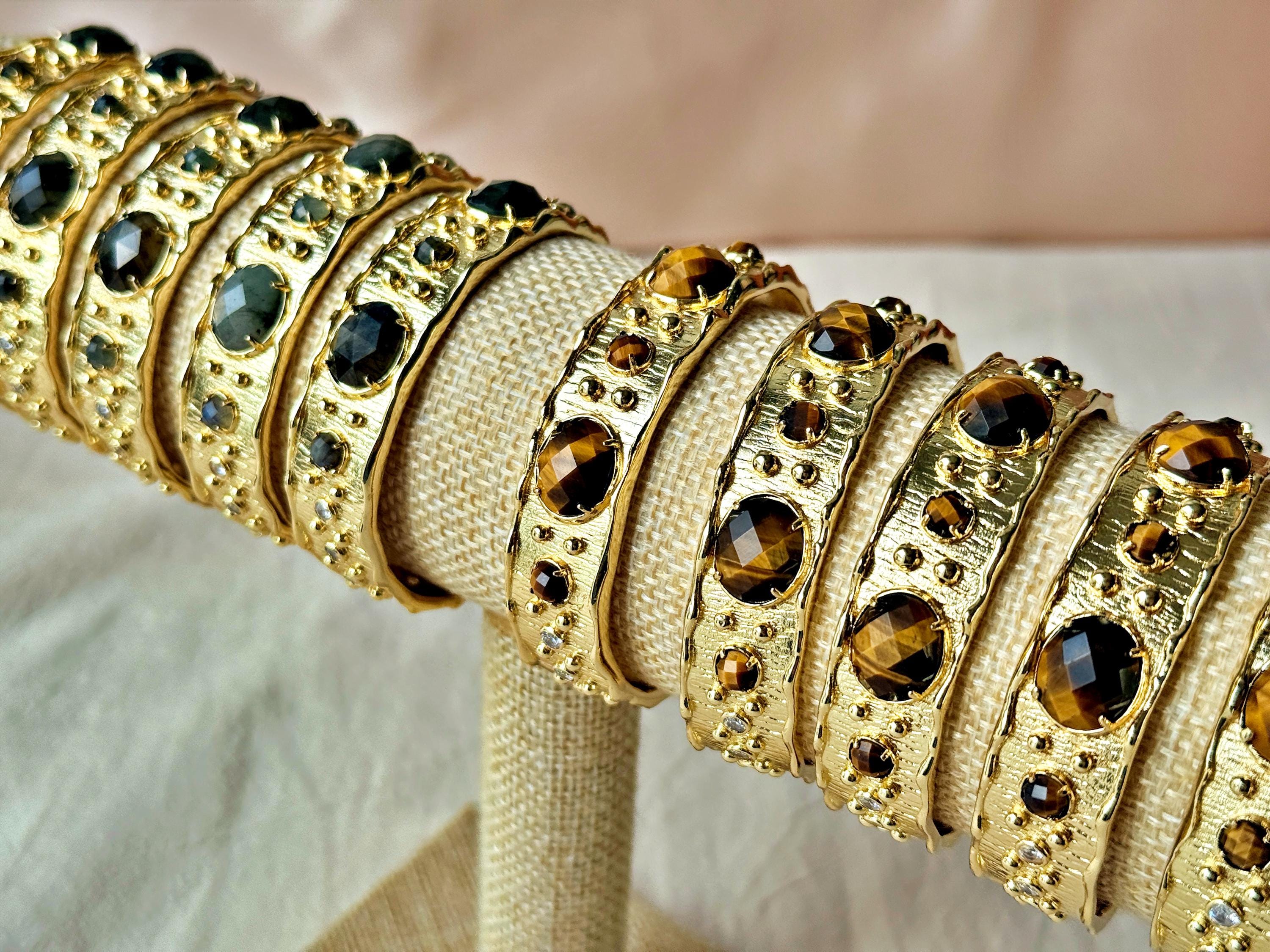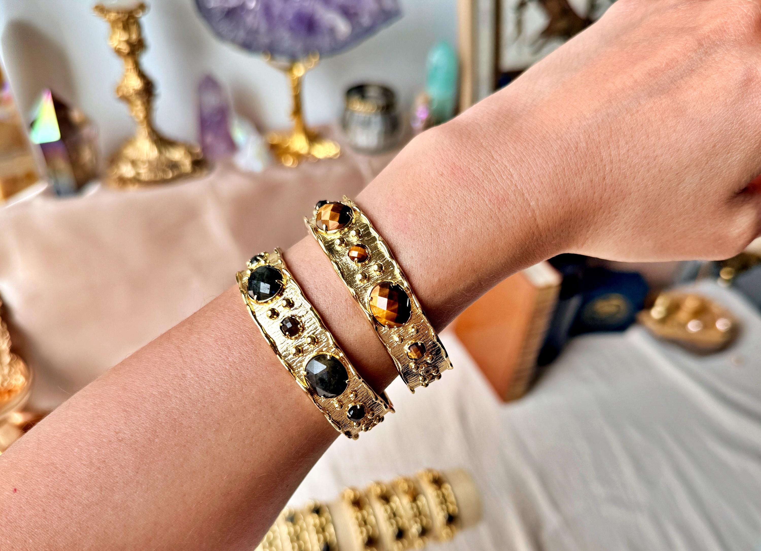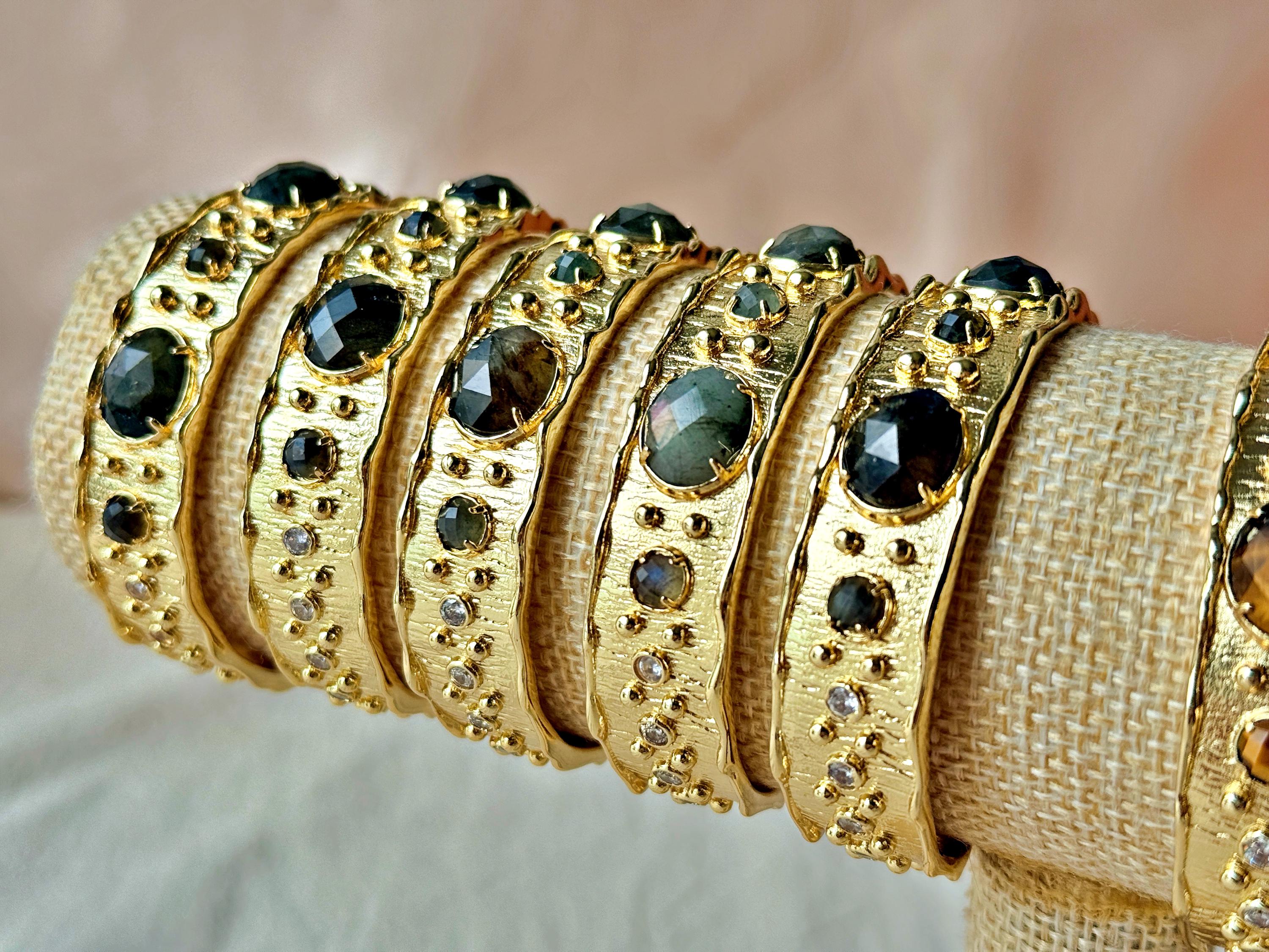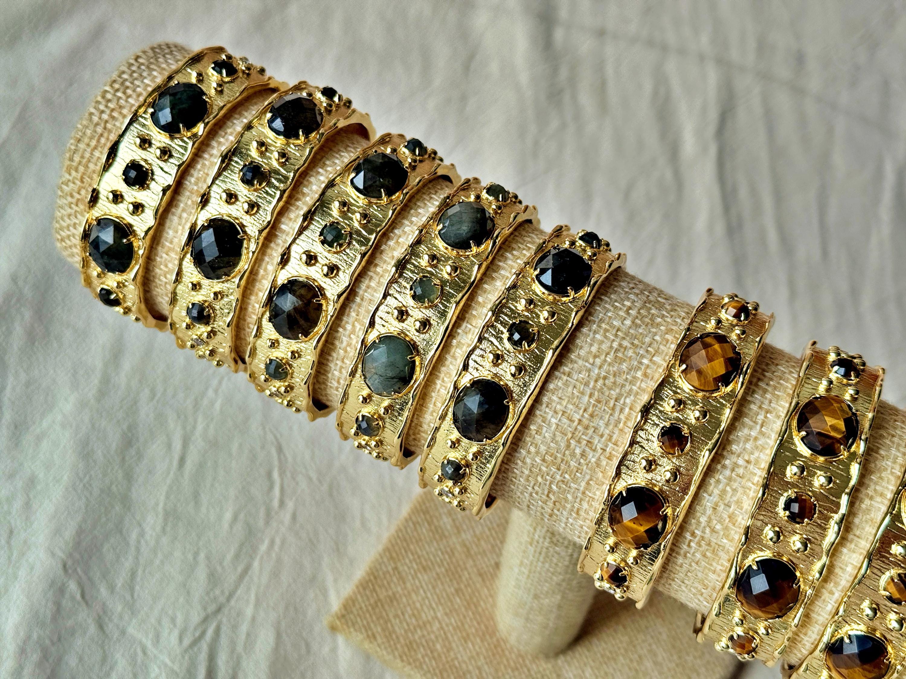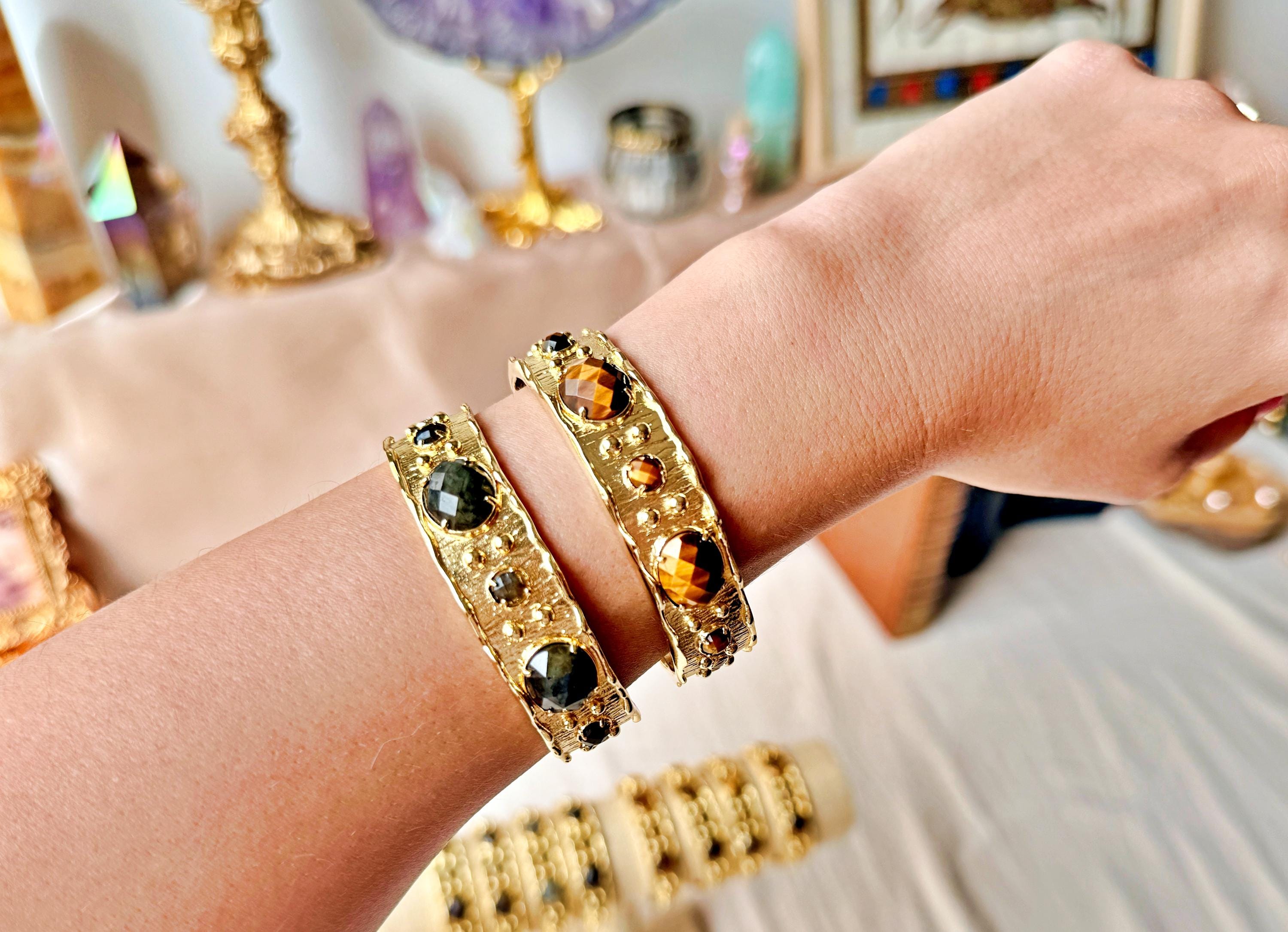 Cuff bracelet featuring natural faceted stones, set on a textured gold-plated metal structure.