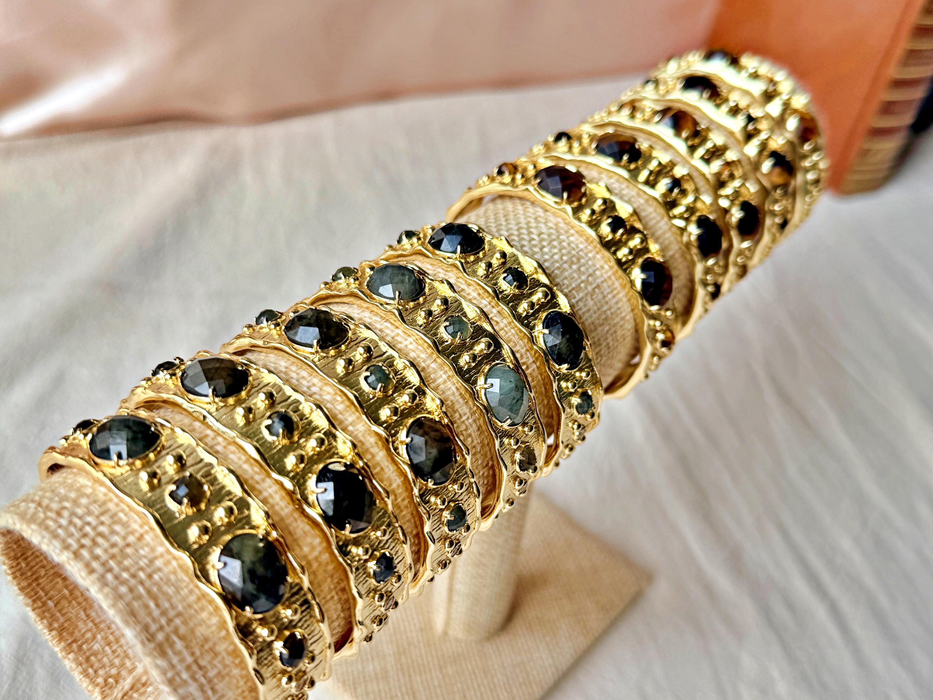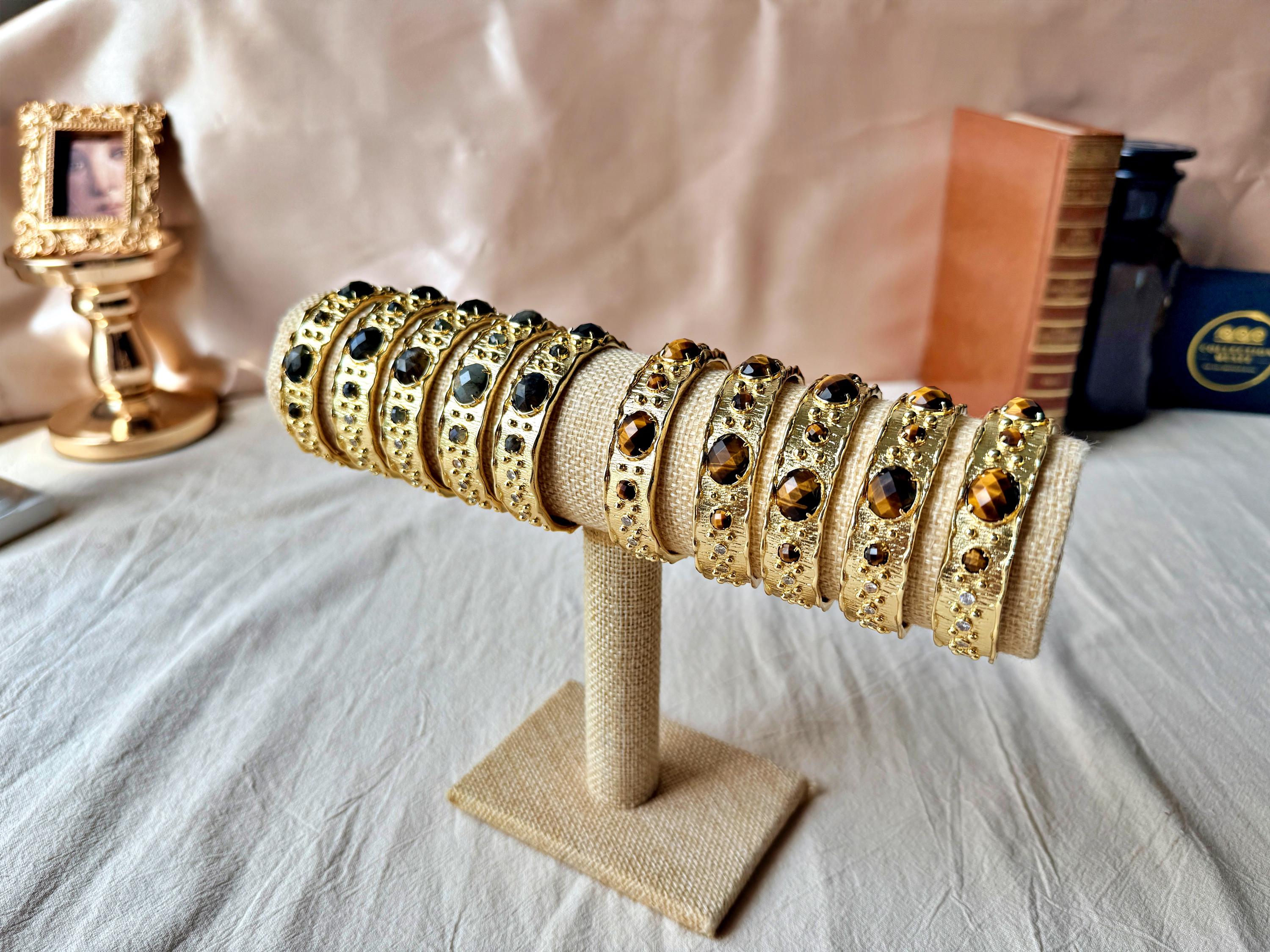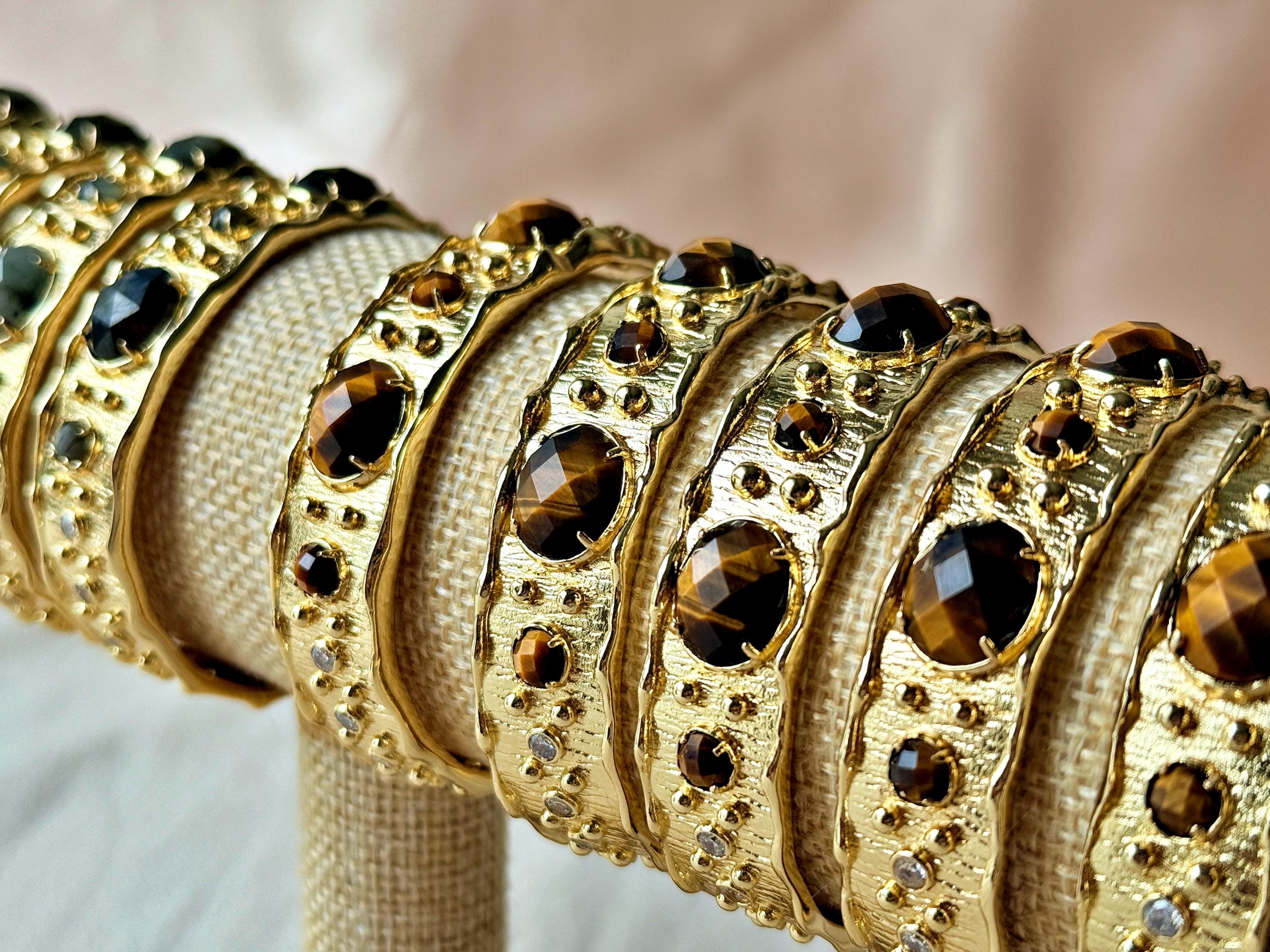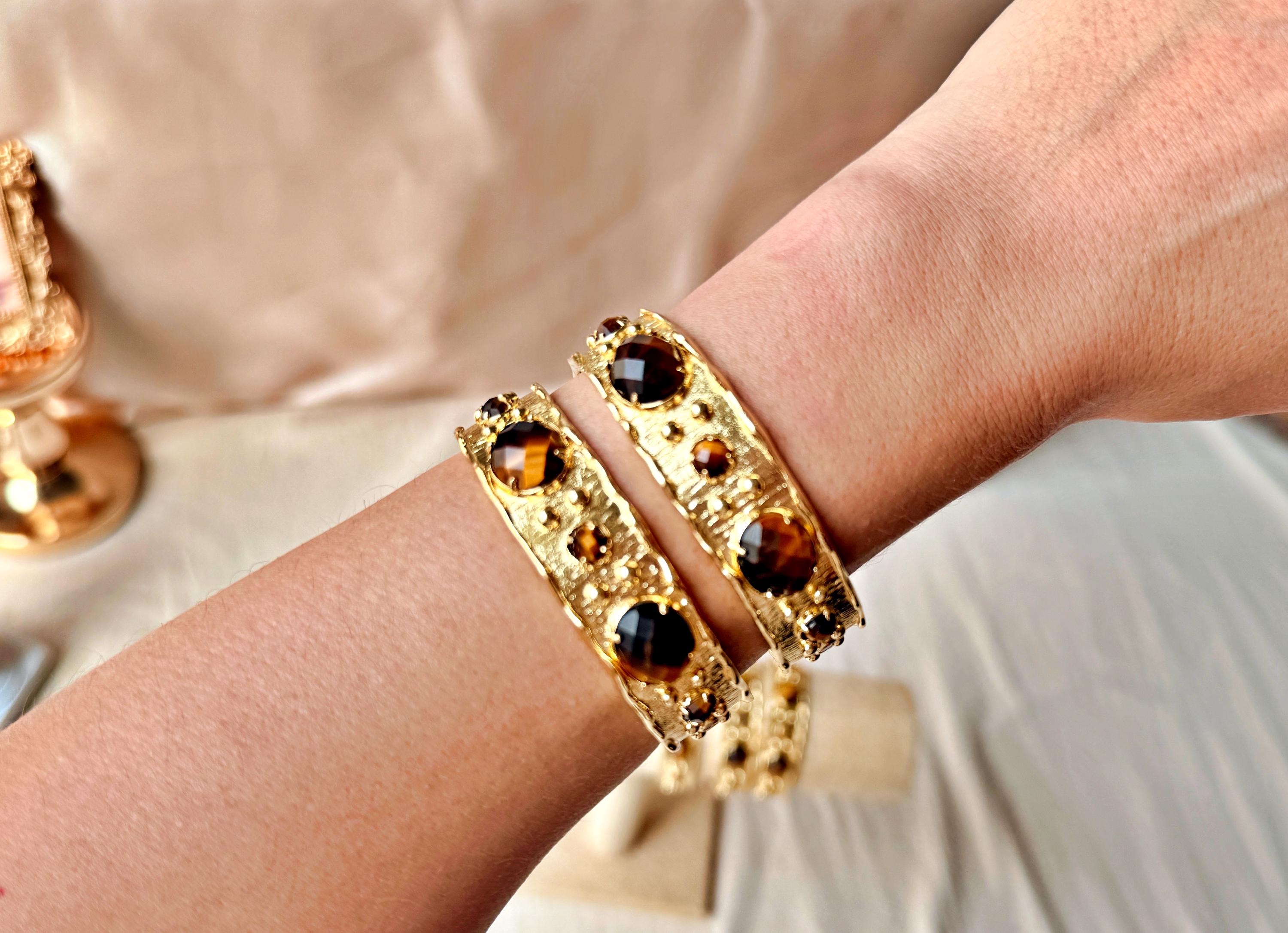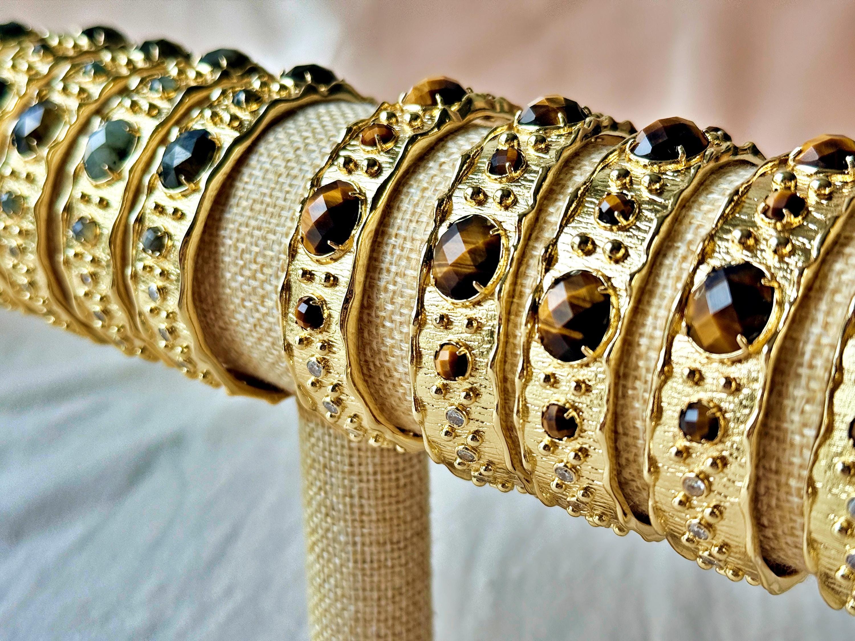 Cuff bracelet featuring natural faceted stones, set on a textured gold-plated metal structure.